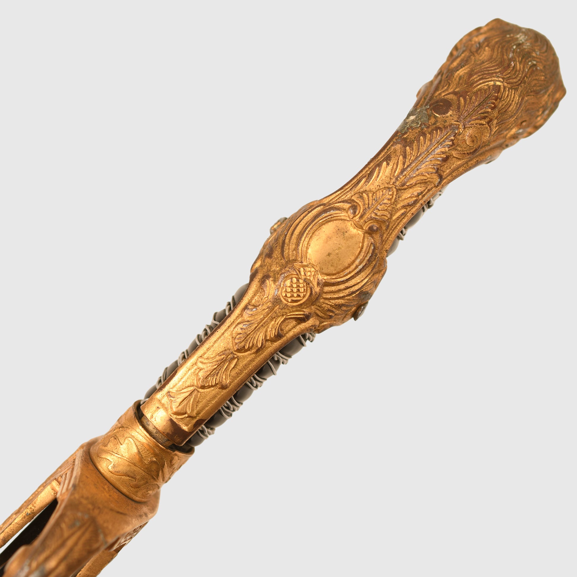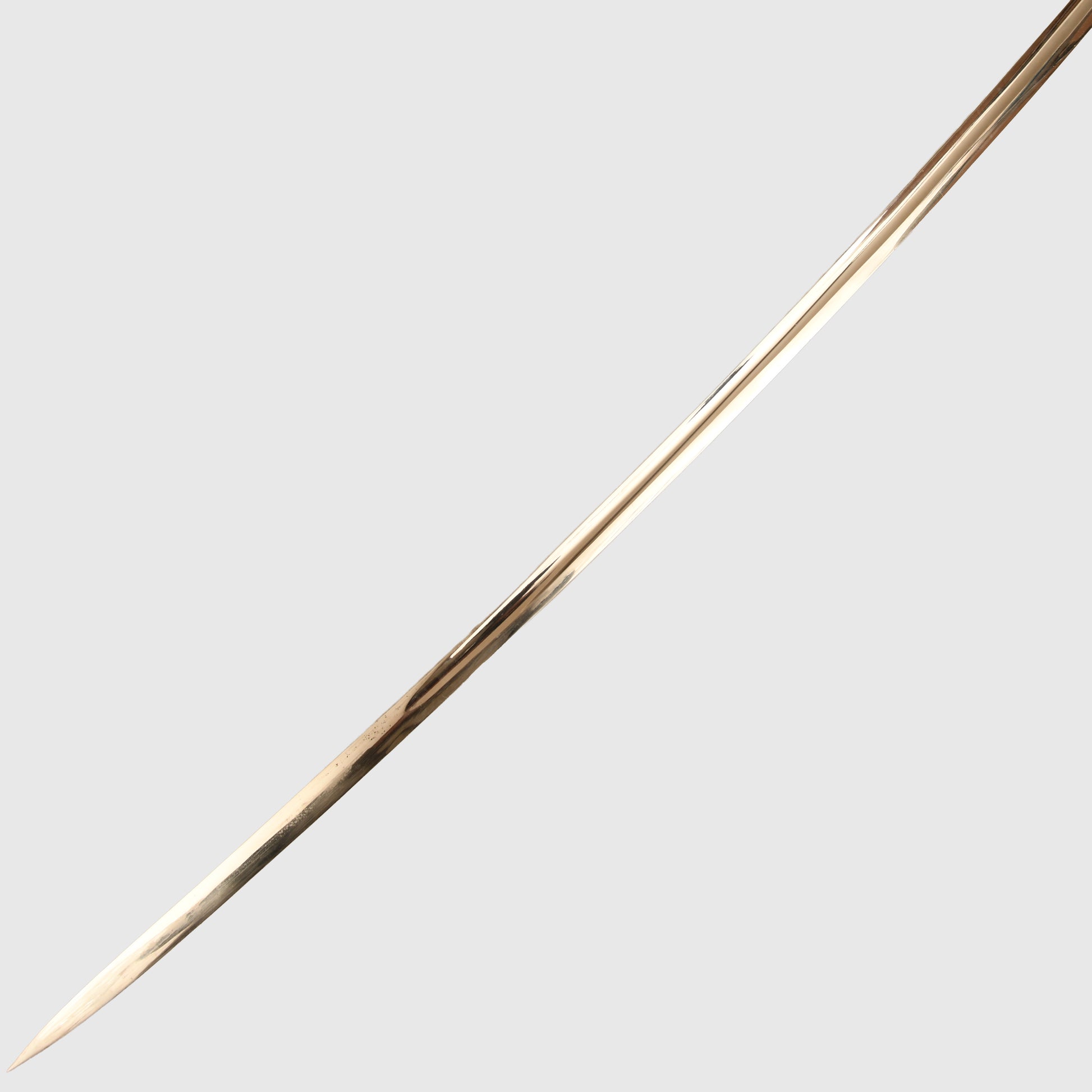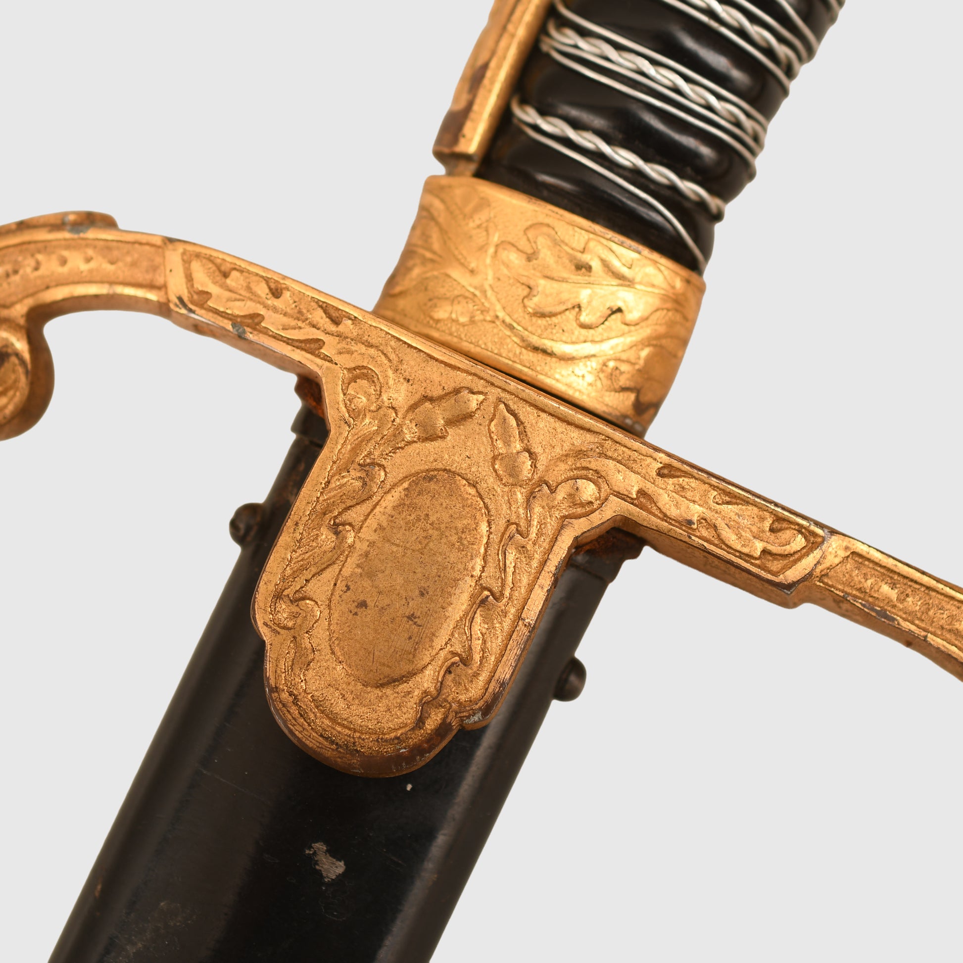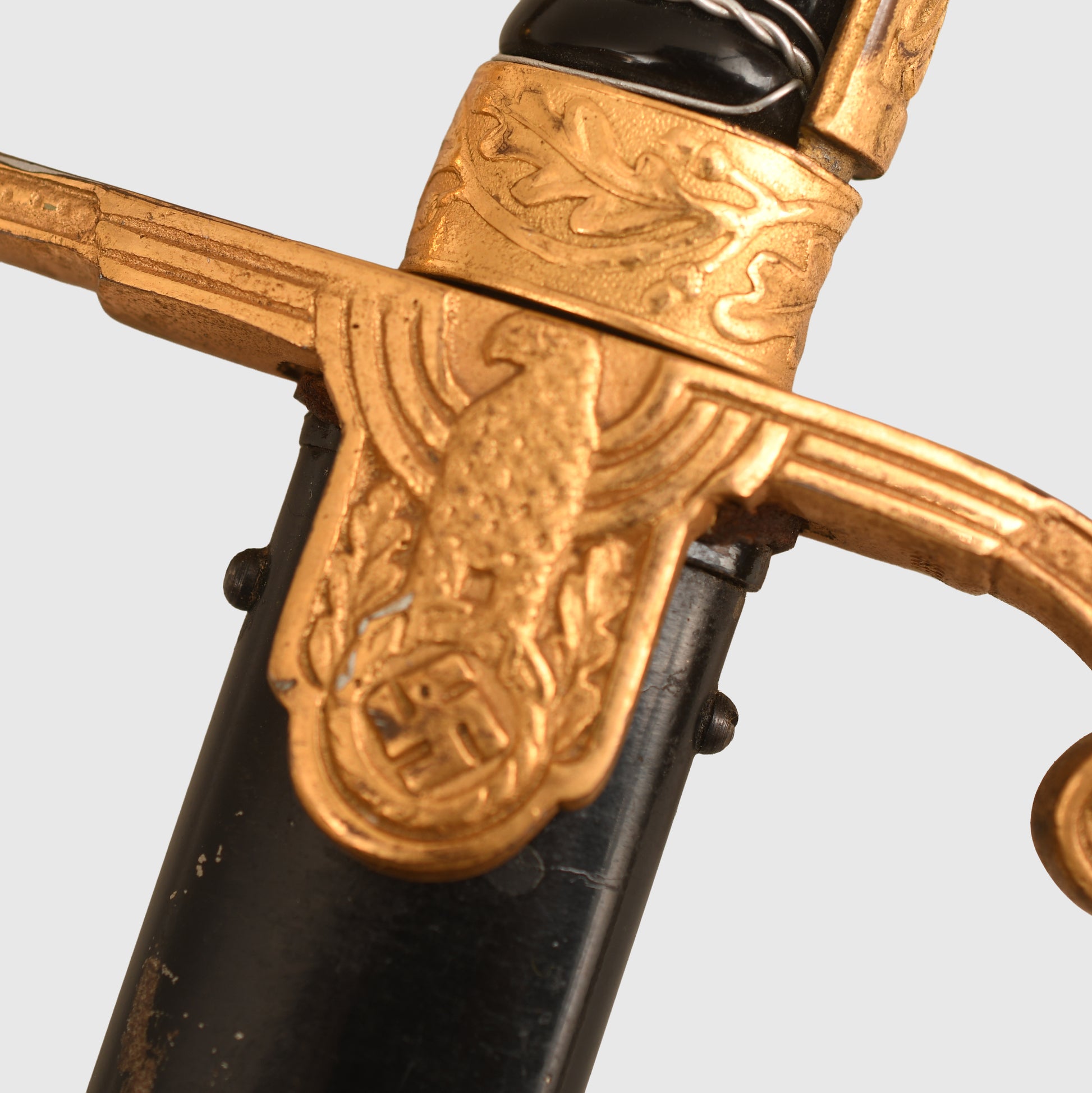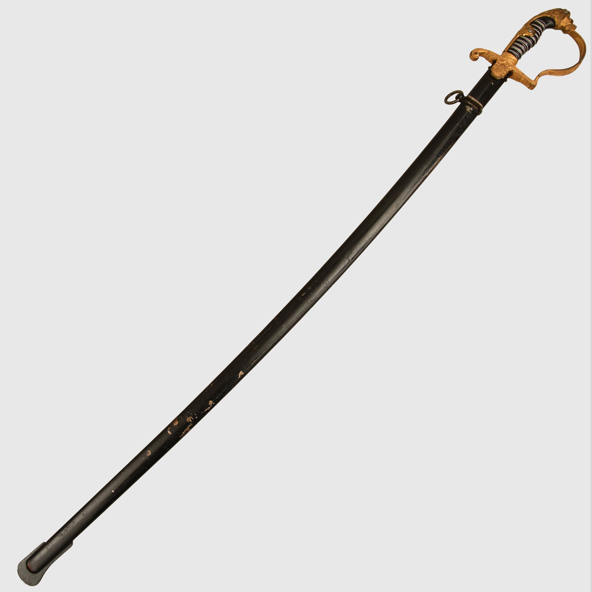 Excellent condition gilt to the hilt, some slight rubbing of the gilt on the right and left-hand side of the lion’s head. Twin red jewelled eyes. Grip undamaged, grip wire in place but slightly loose. Mint condition single fullered blade with the Eickhorn trademark fitted. The blade is 83cm long, in its original undented scabbard, with some minor abrasions to the paint finish to the lower half of the scabbard; otherwise, overall a good army officer's sword.
