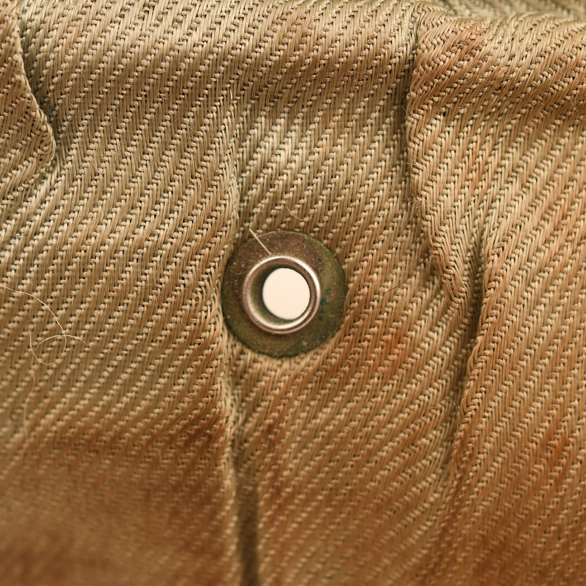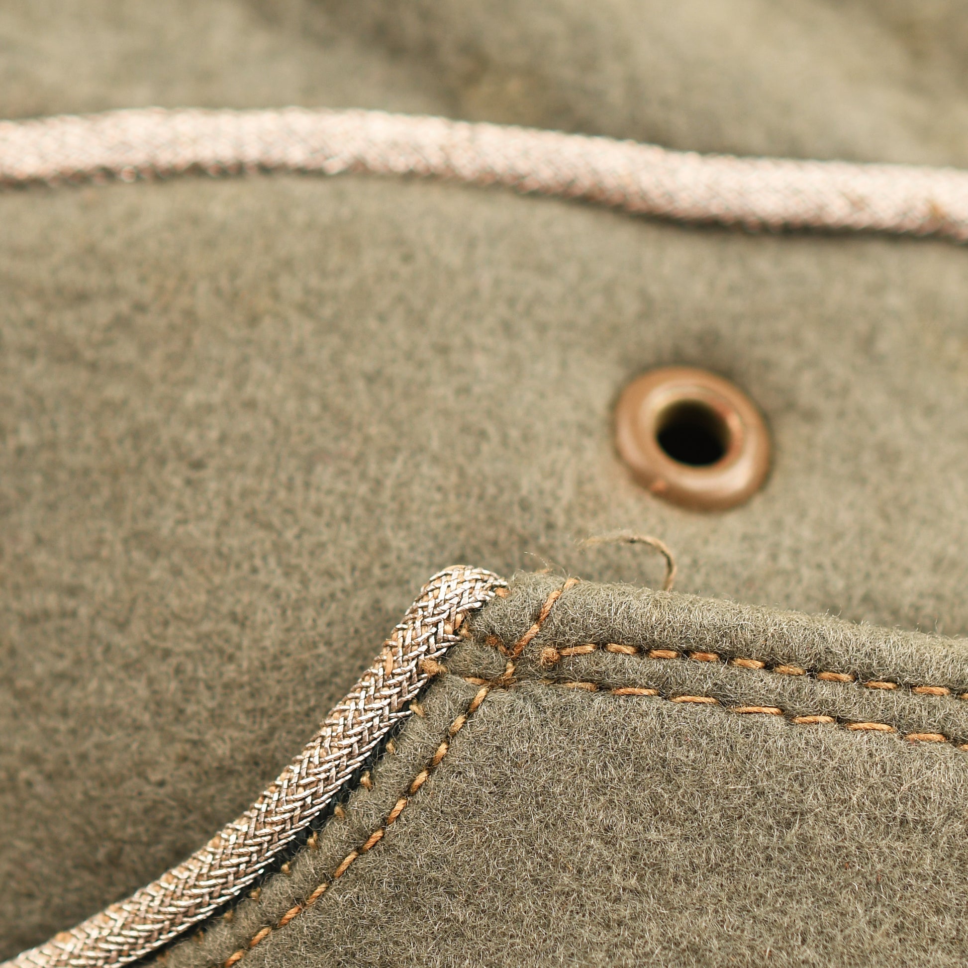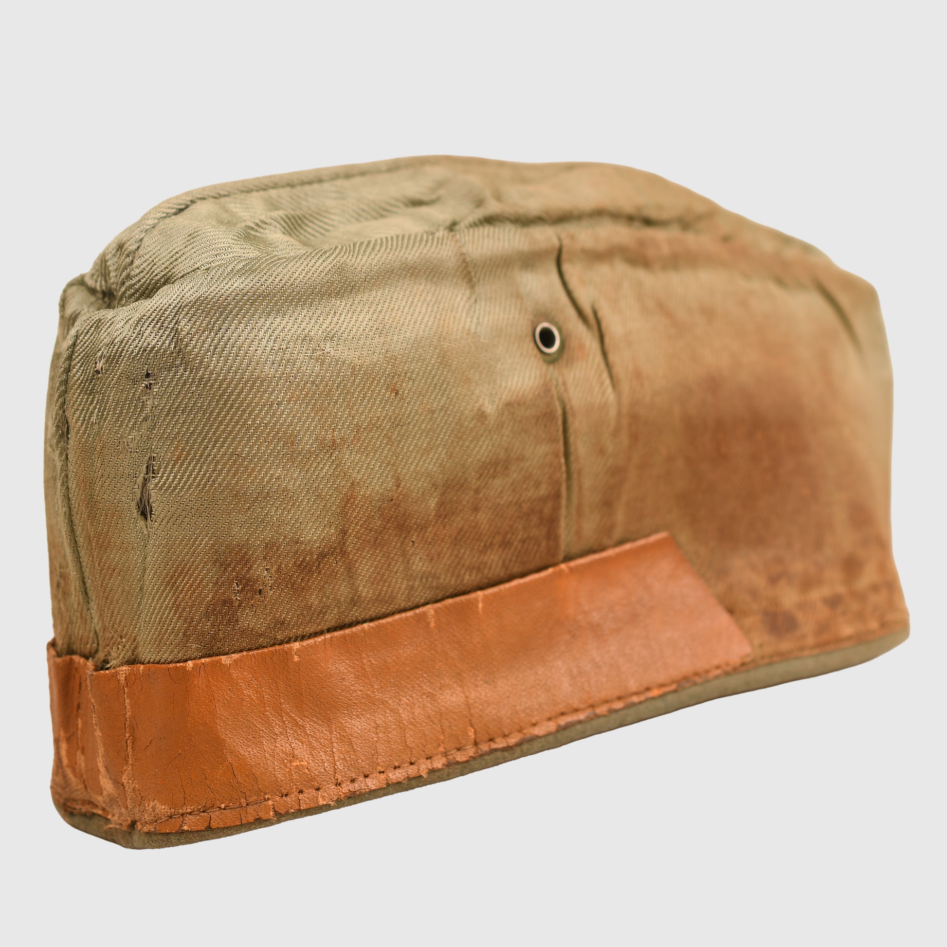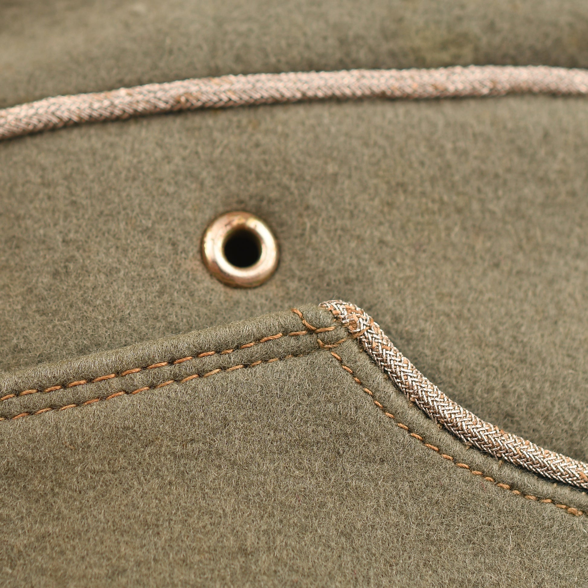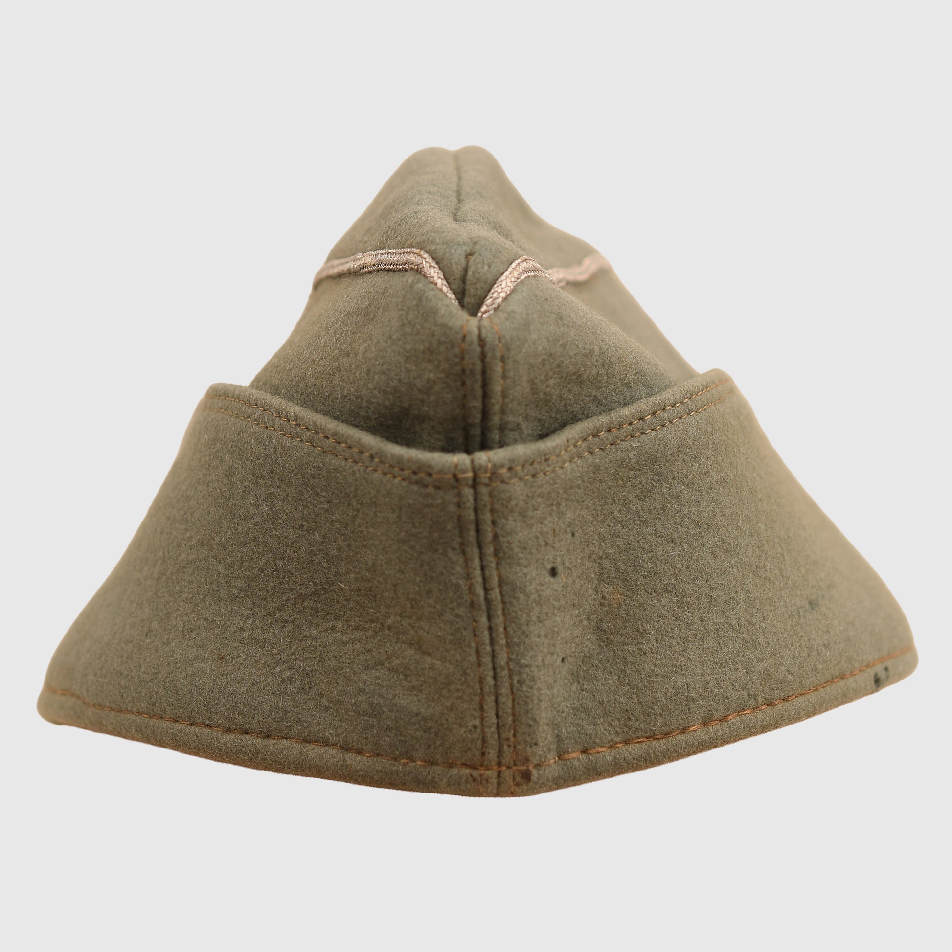 A high-quality field grey-green officer’s overseas cap, small size, approximately 54. The cap shows two minor moth nips to the upper body. It is trimmed with silver waffenfarbe around the upper envelope and front scallop, with pink waffenfarbe forming a V-shape around the central bullion wire cockade. The correct Bevo silver wire eagle has been applied over a section of heavy-duty cloth and then stitched to the cap, showing slight moth grazing to the upper part of the eagle and the tip of the lower right wing. The interior displays clear evidence of wear, with a half-size inner sweatband fitted—either originally or added after purchase—covering the forehead and half of the head area.