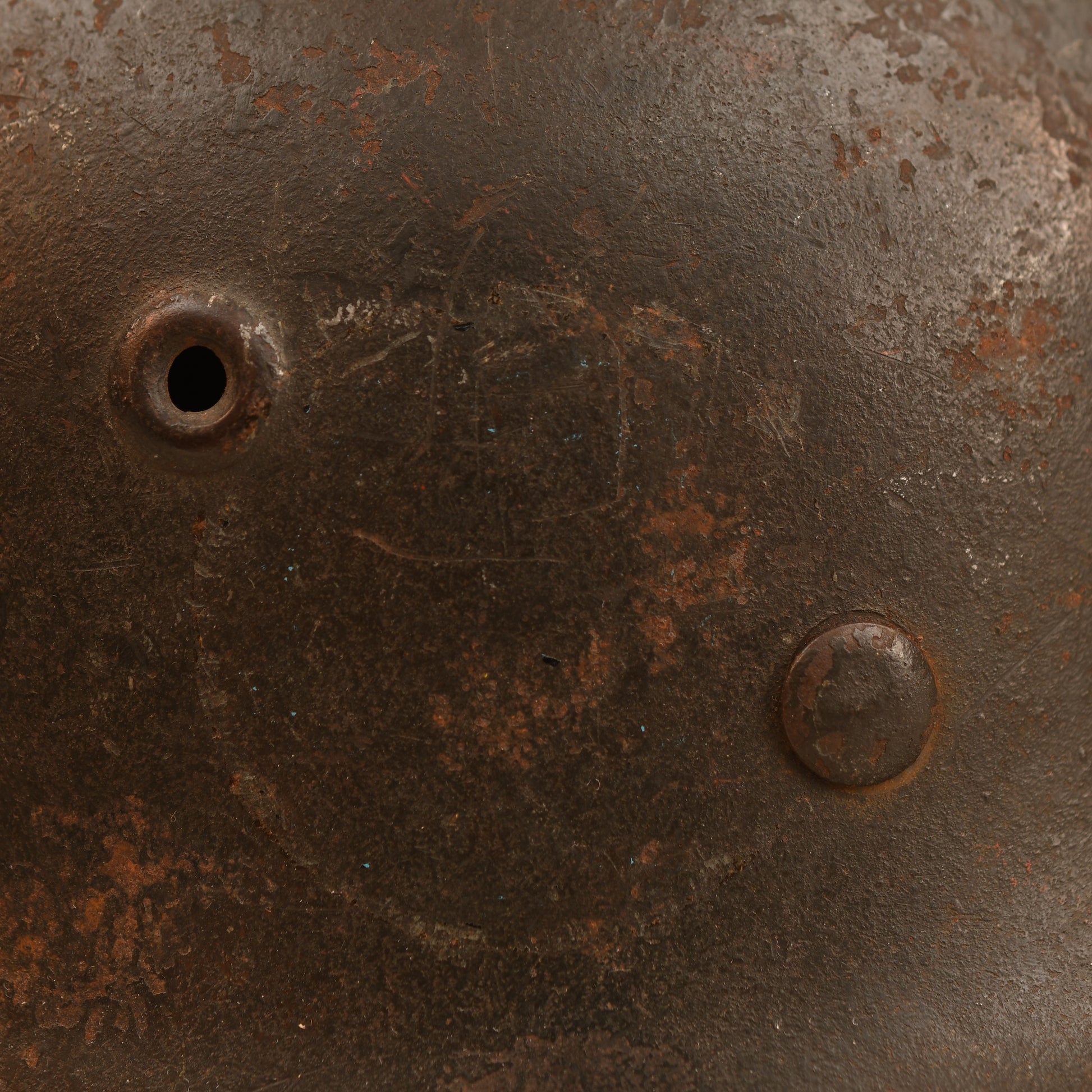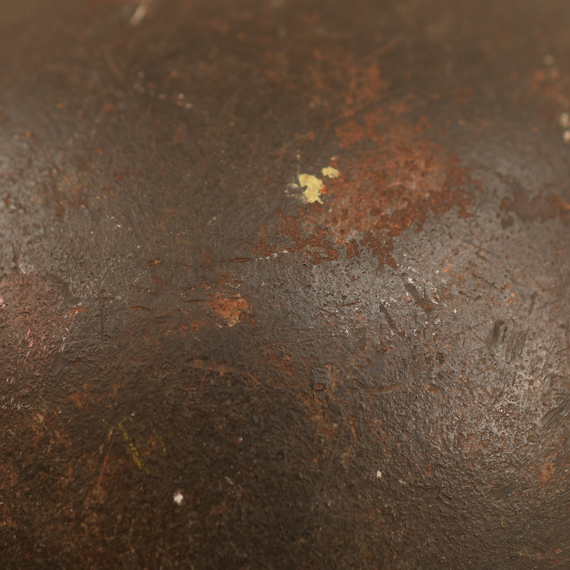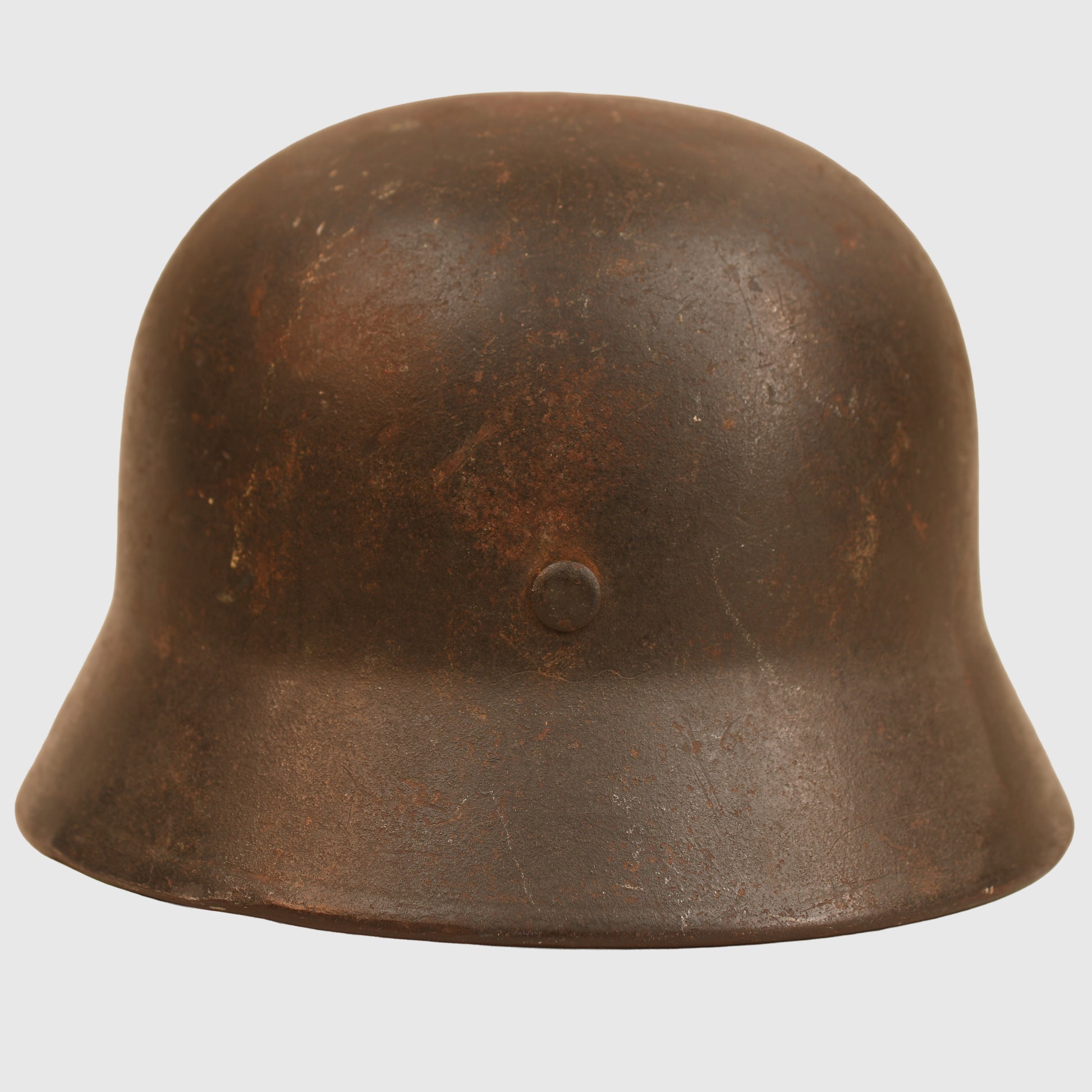 A very good example of an M40 Army combat helmet, large Q66 shell, retaining much of its original field-grey finish with light rust bleed visible on the crown and surrounding areas. The single army decal remains virtually complete, showing only slight rust bleed to the left side.