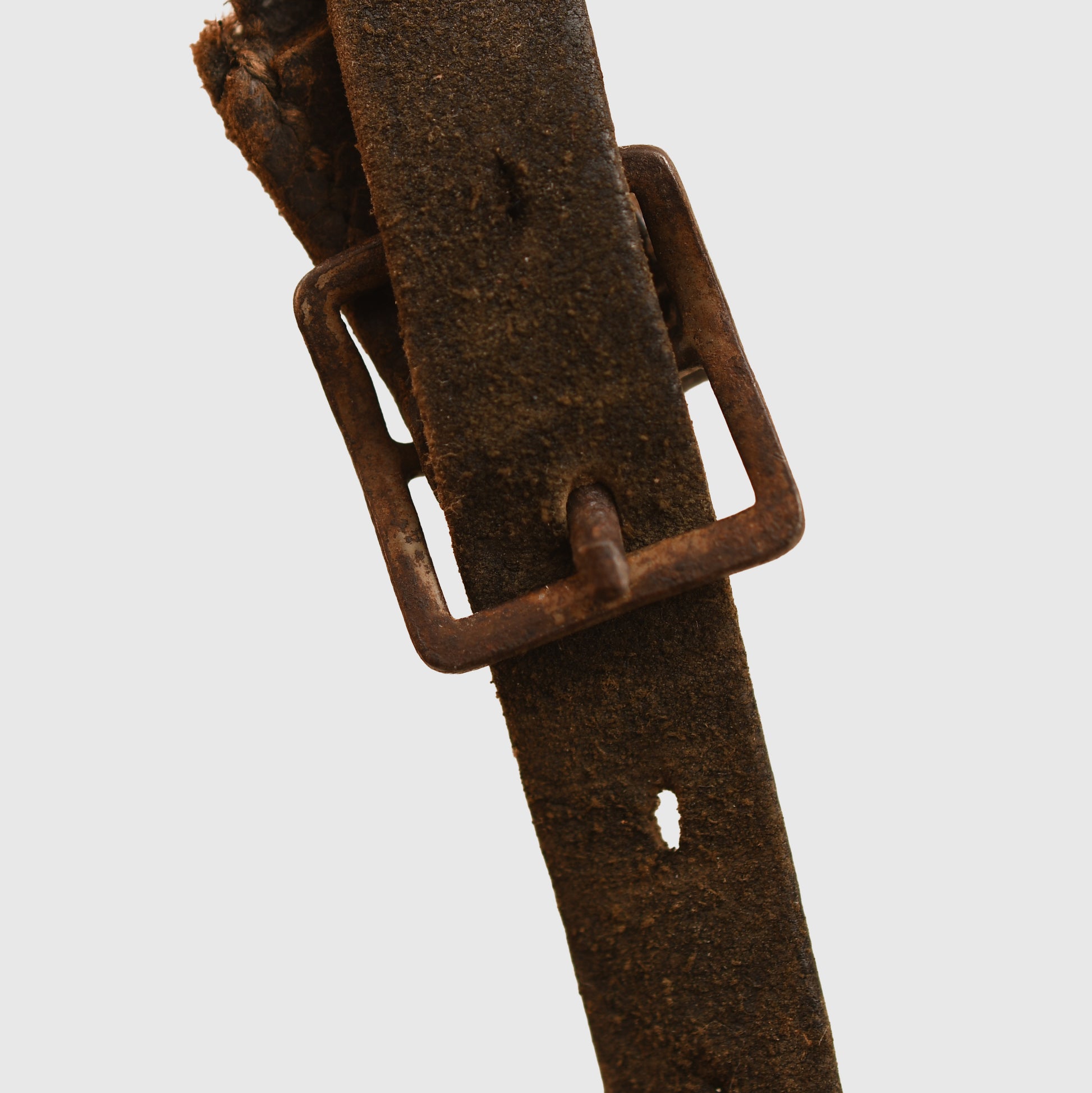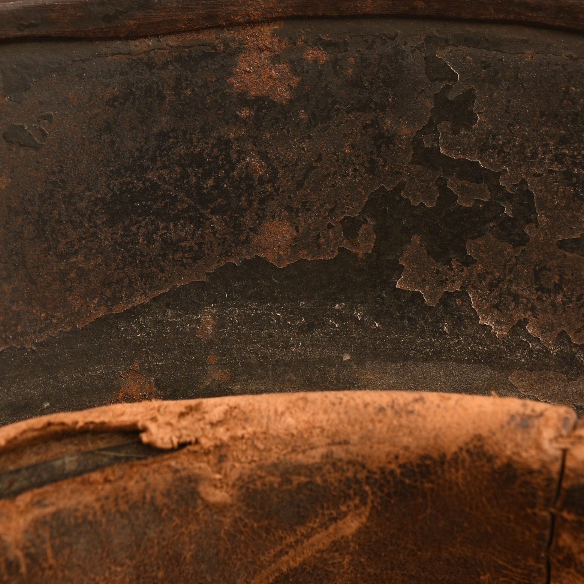 Fitted with its original untouched liner, the leather showing thinning along one inner edge, with the faint size marking appearing to read 58. One long section of the original chinstrap is present, with the opposite side retaining a short section including the buckle.