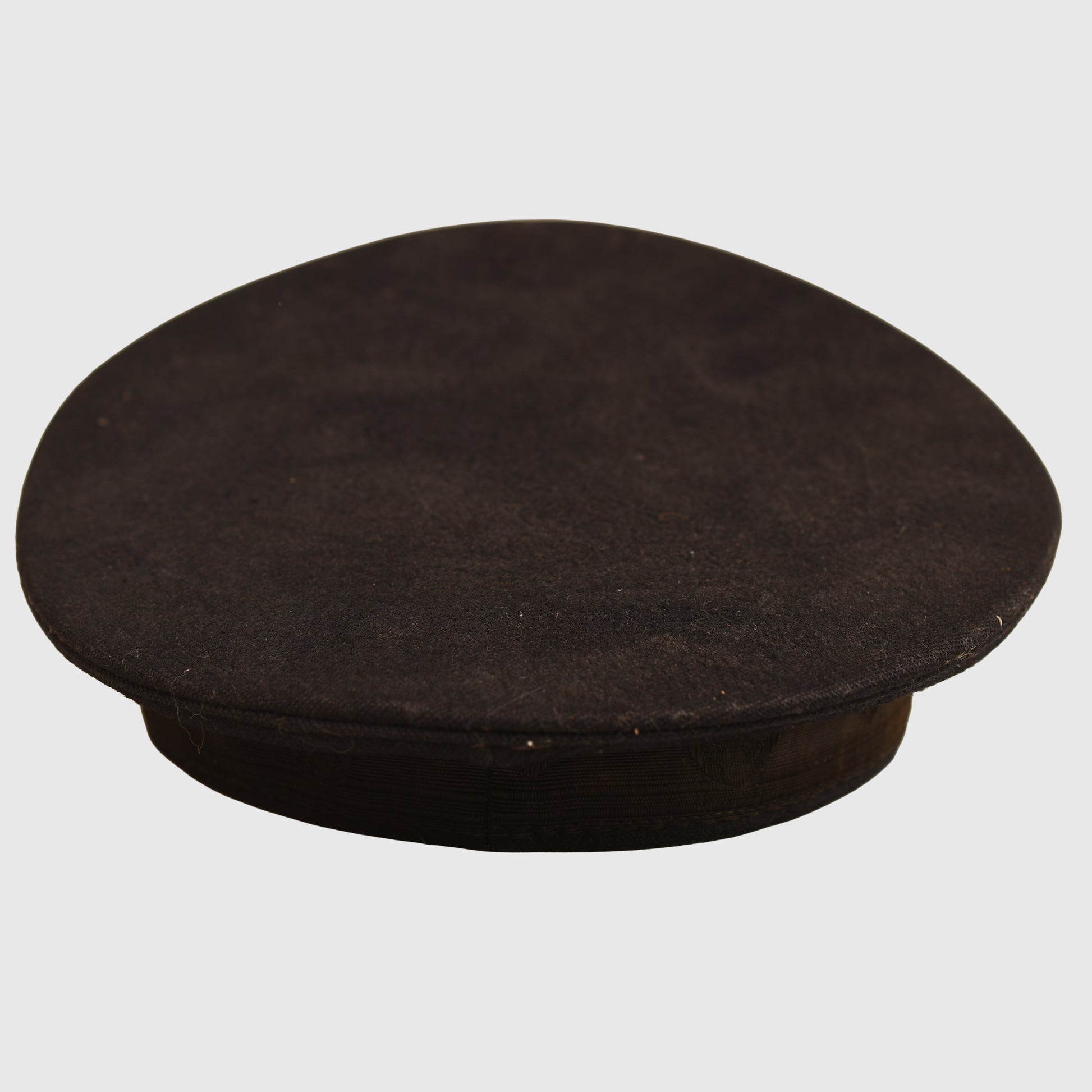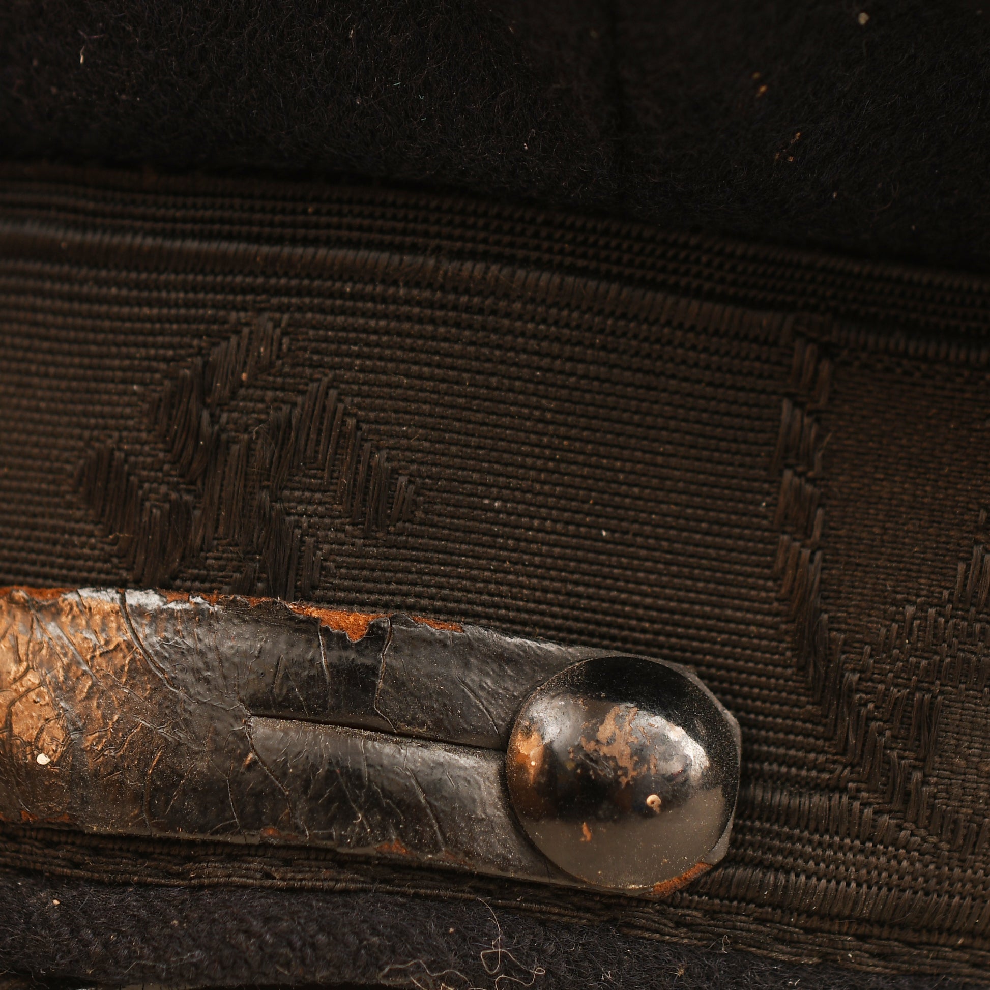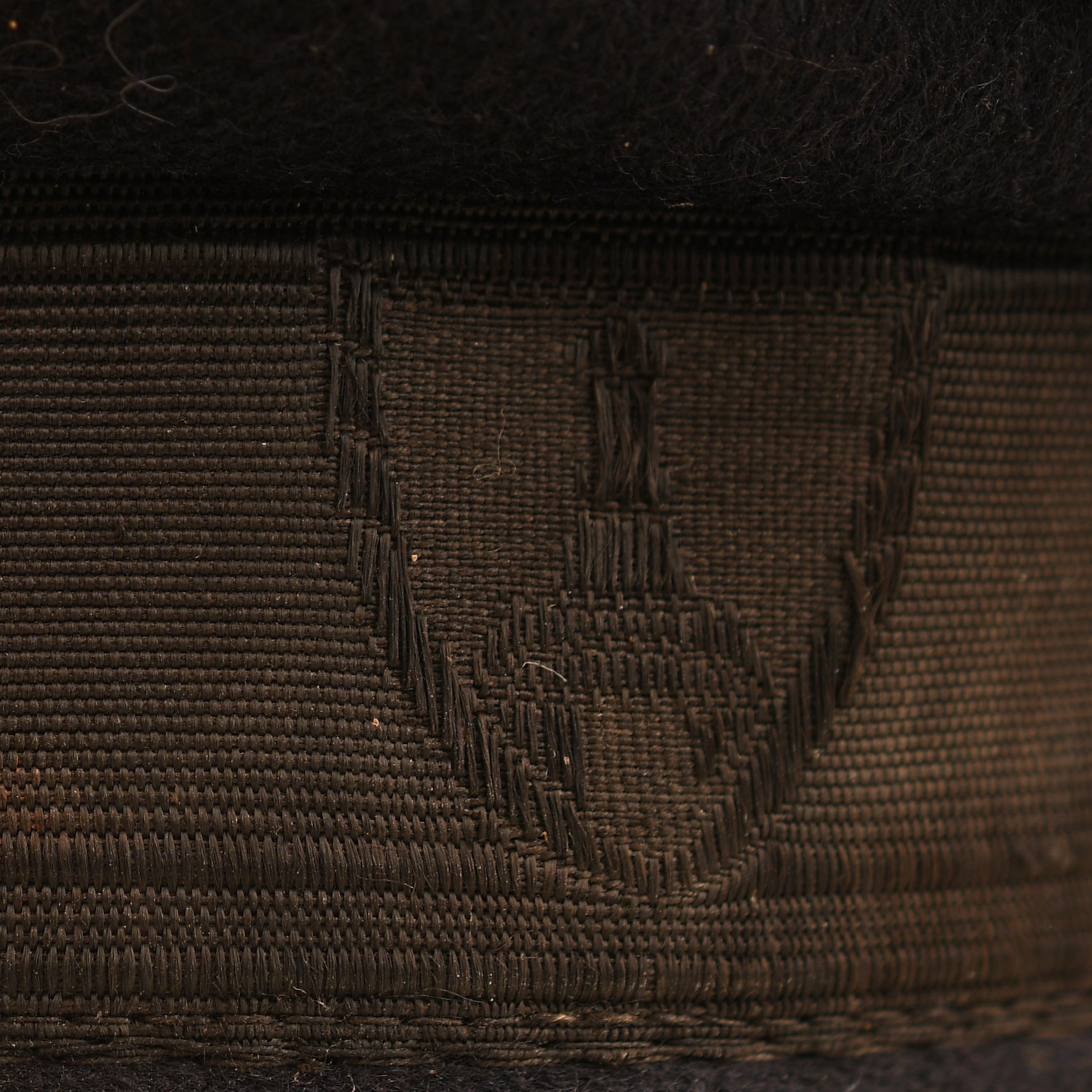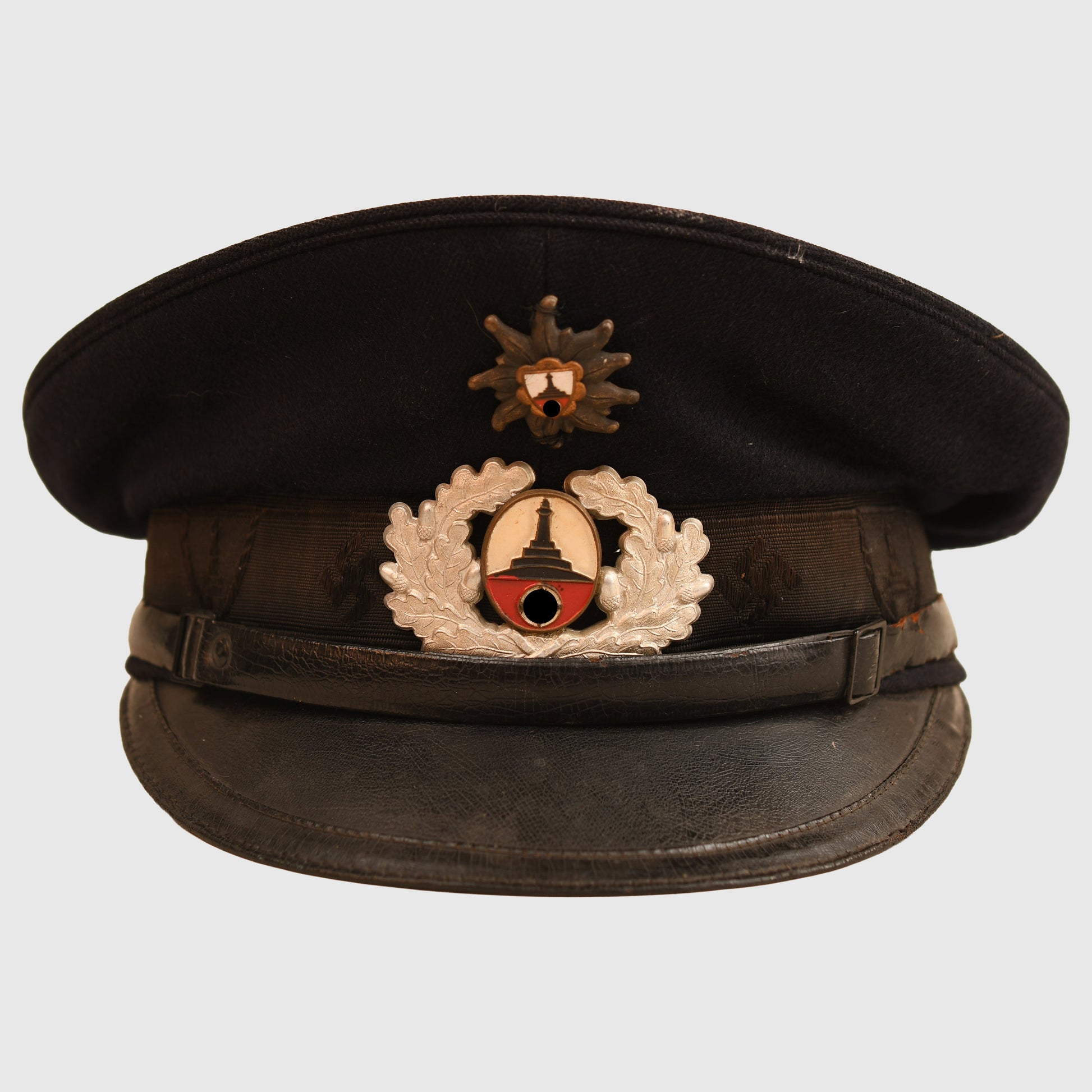 A well-preserved dark blue Kyffhauserbund visor cap, completely free of moth damage. The central band features an intricate intertwining of the Kiel Lighthouse memorial and swastikas. Standard strap with the characteristic wide-rimmed visor edge. The insignia shows the Kiel Lighthouse at the center of the cockade, above an edelweiss, with a miniature version of the lighthouse emblem also applied. The cap retains its standard leather sweatband and an original interior label reading ‘DRKV Kyffhauserbund Mutz.’ Faint remains of the upper crown insignia are visible, with slight traces of the swastika still discernible.