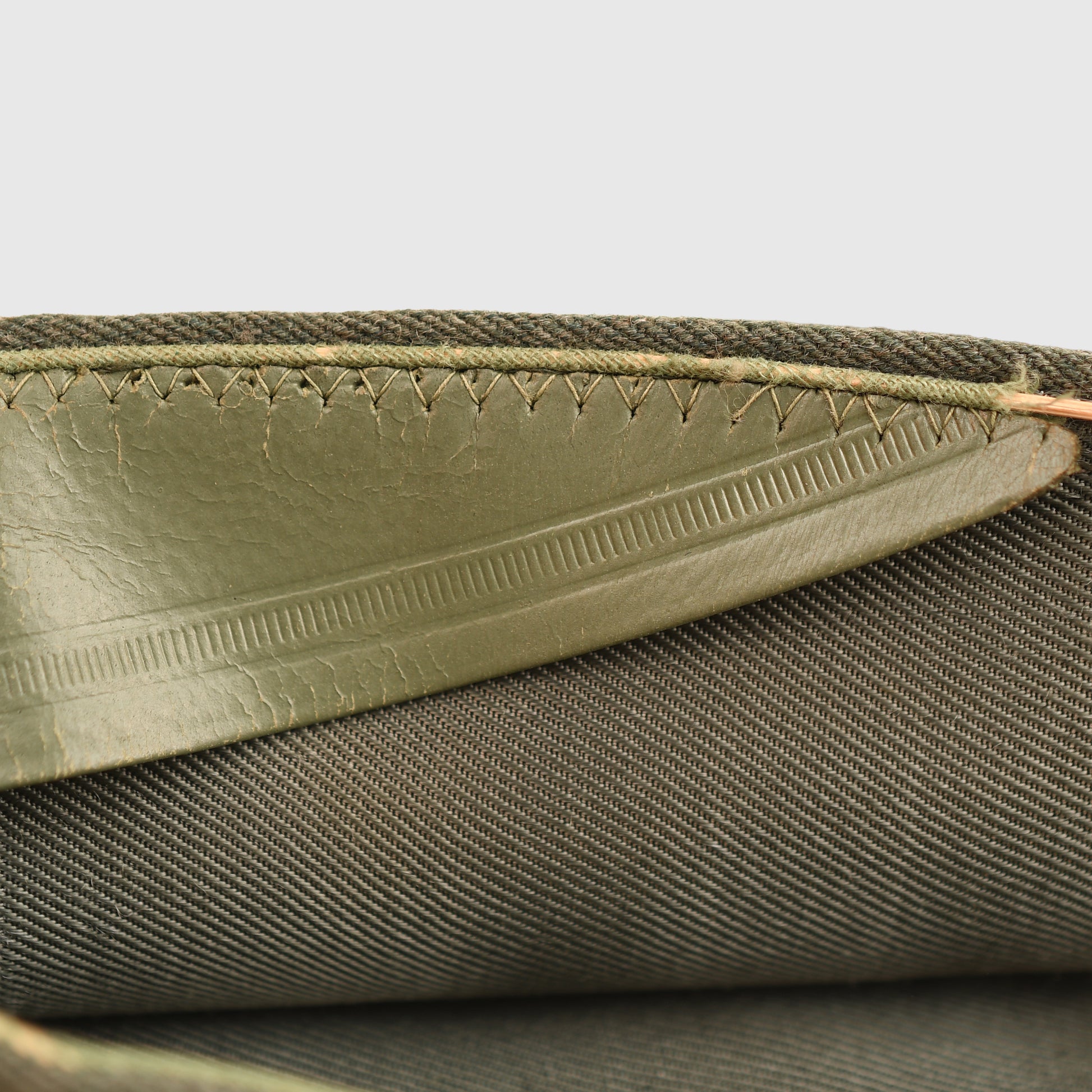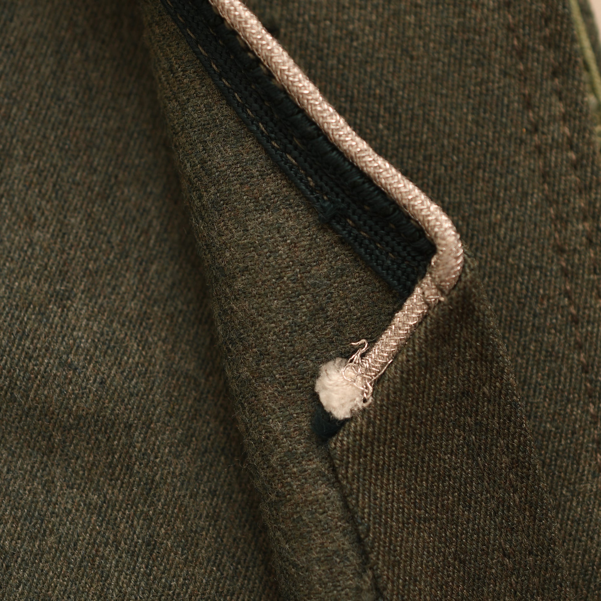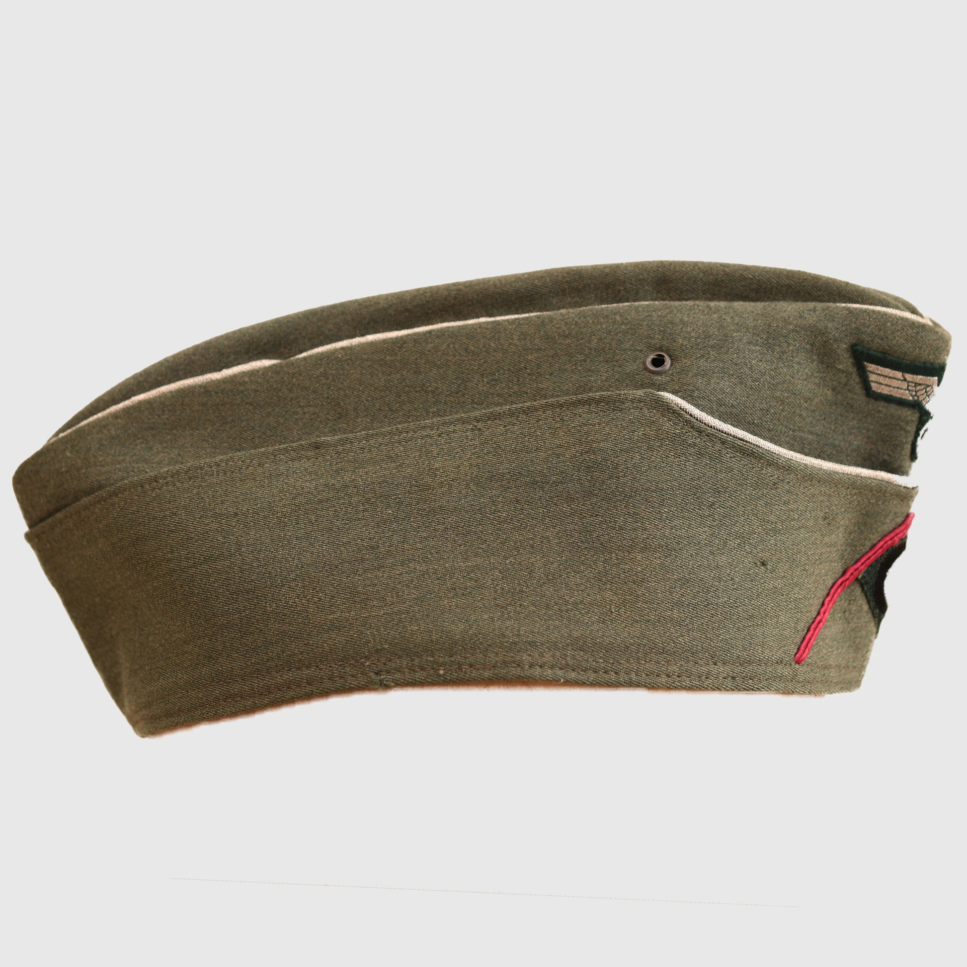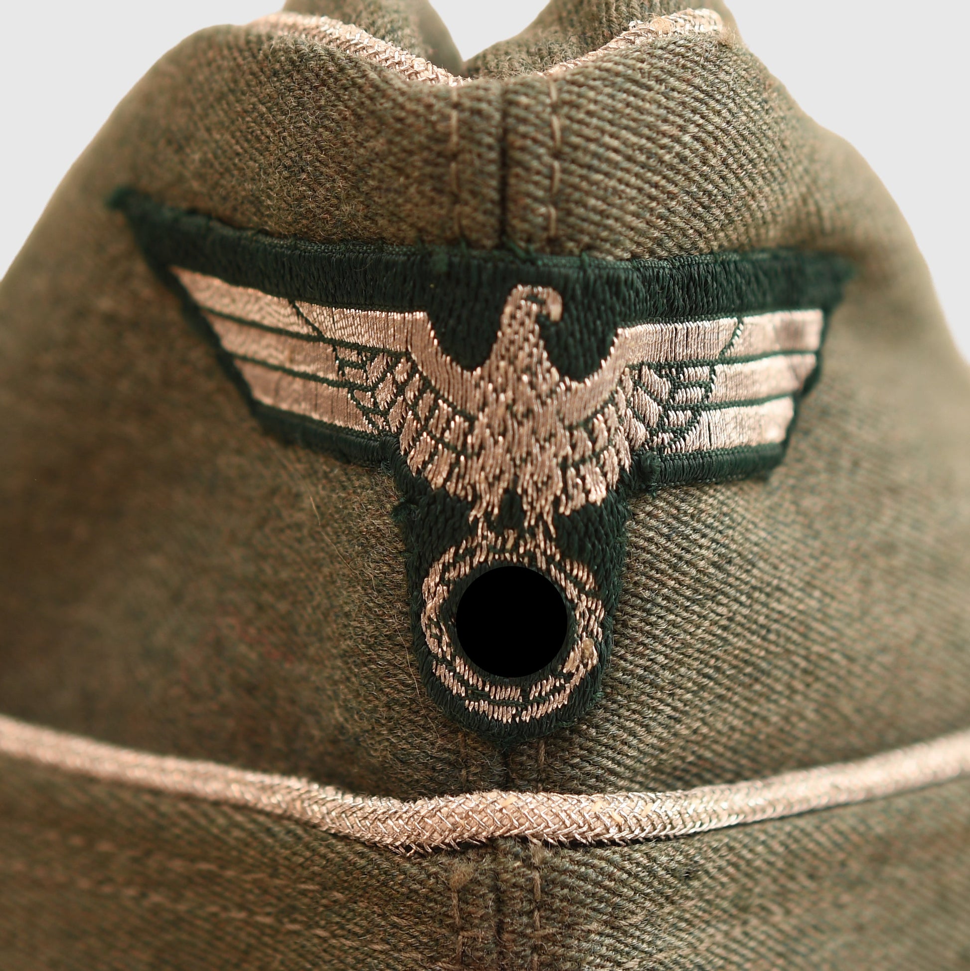 A fine quality Army officers overseas cap in gabardine, featuring standard silver piping to the crown and front scallop. Fitted with a silver Bevo woven eagle on dark green backing, accompanied by the correct matching officers Bevo woven cockade and inverted V waffenfarbe, denoting either the General Staff or Veterinary Department.