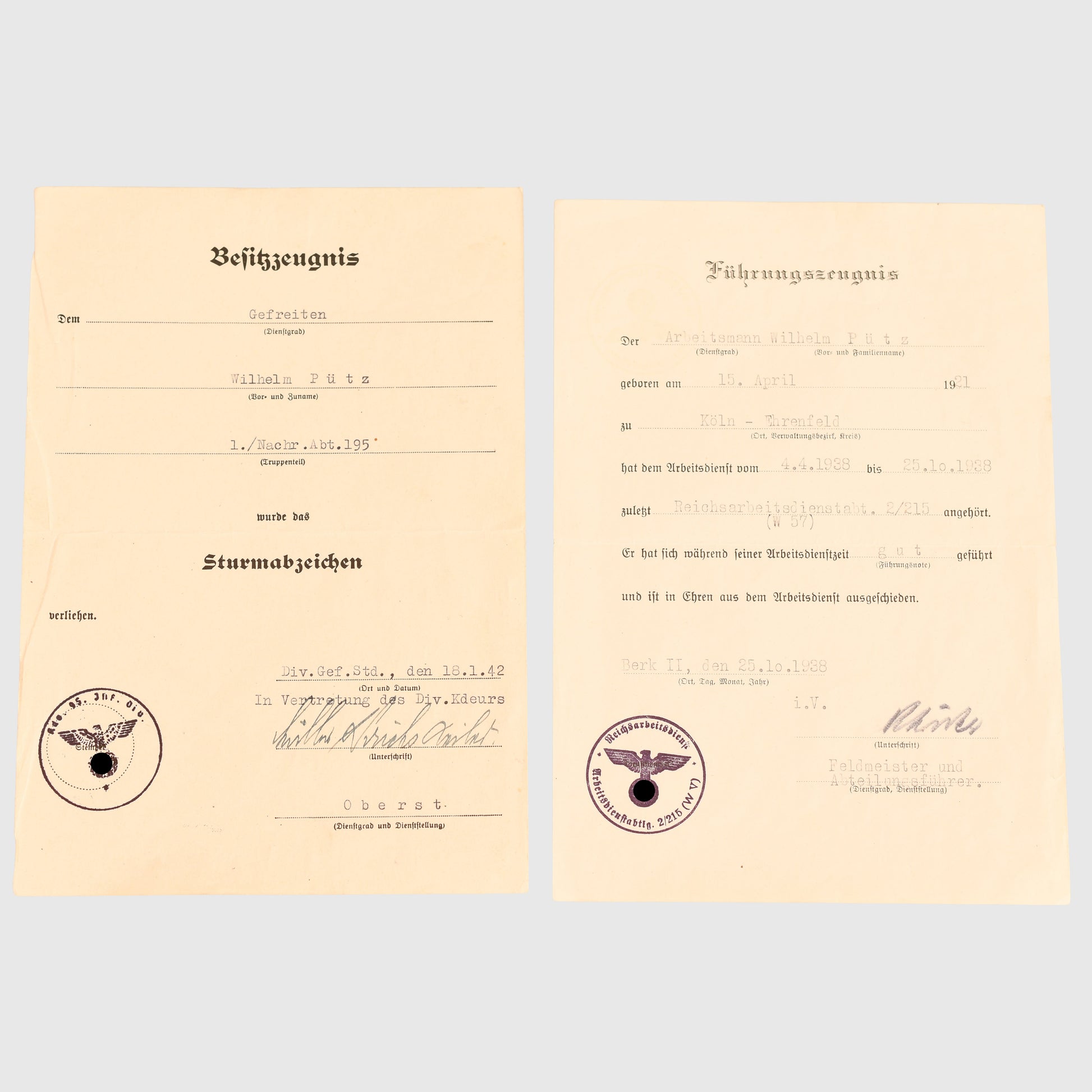 Additional items include Putz’s RAD certificate and Arbeitsbuch with entries from 1935–1940. The Iron Cross 1st Class citation is folded once; the General Assault Badge citation also folded once. All documents are in excellent condition, offering a remarkable insight into the career of a frontline soldier.