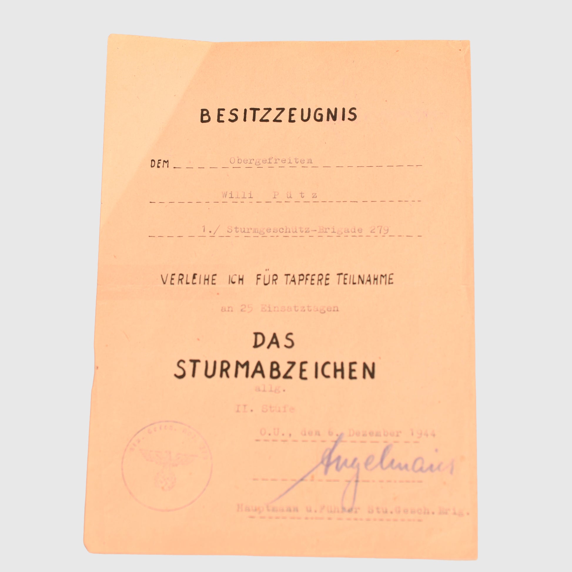 Field-printed 25 Actions General Assault Badge, dated 6th December 1944, to Sturmgeschütz Brigade 279, with indelible pencil signature of the unit commanding officer and issue stamp; at this time the unit was engaged in East Prussia.