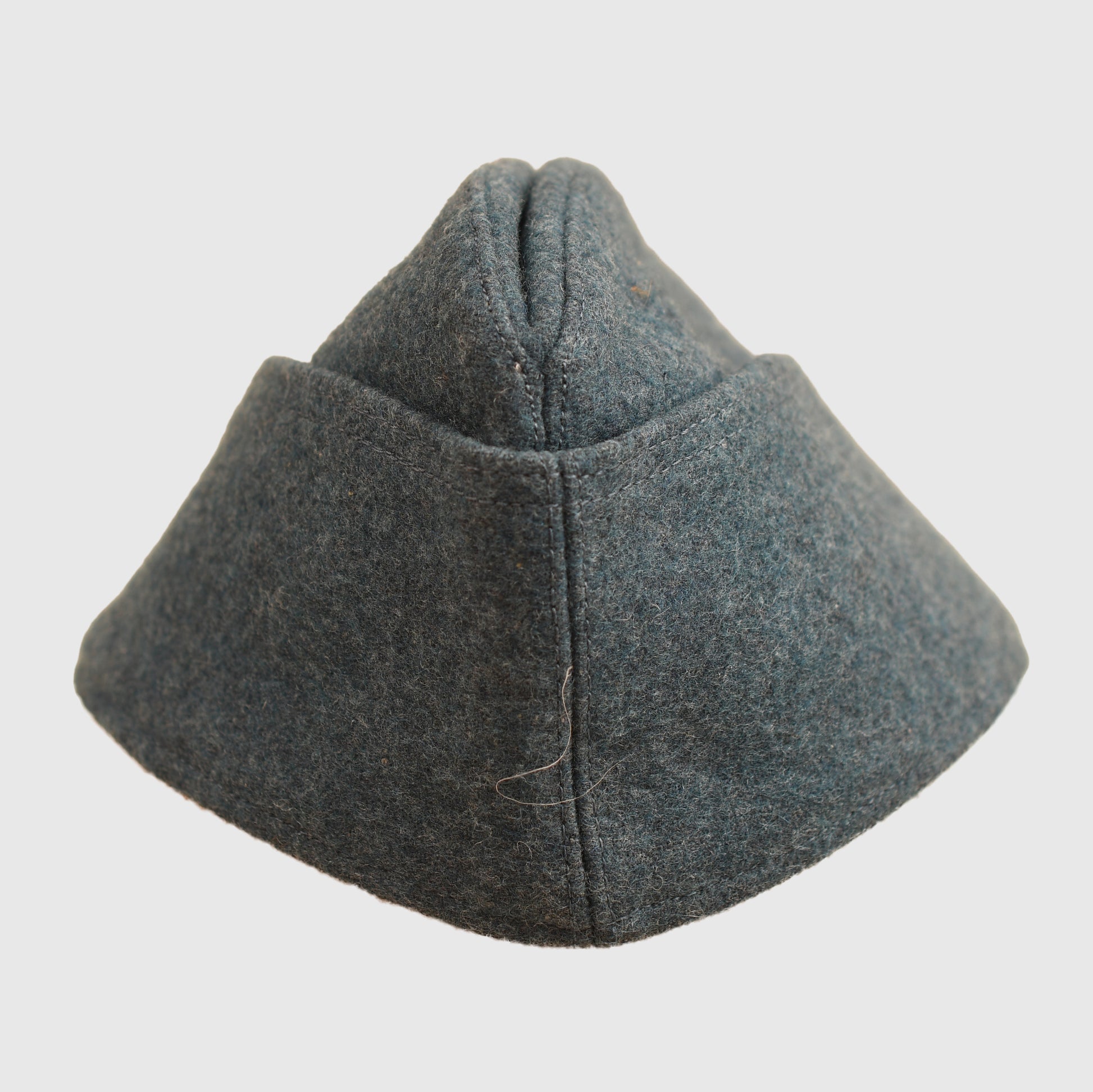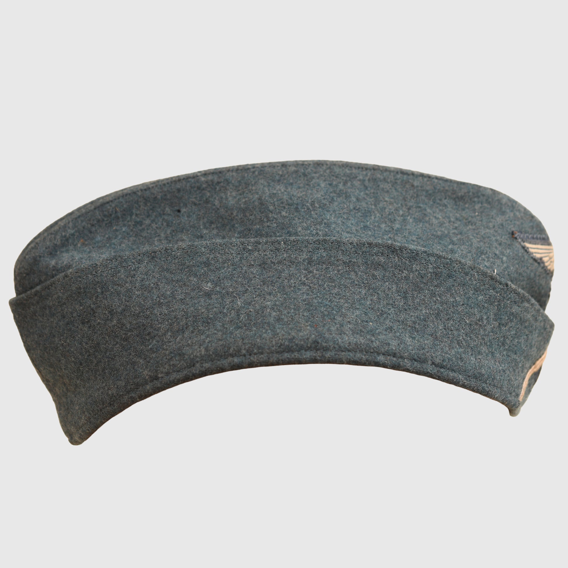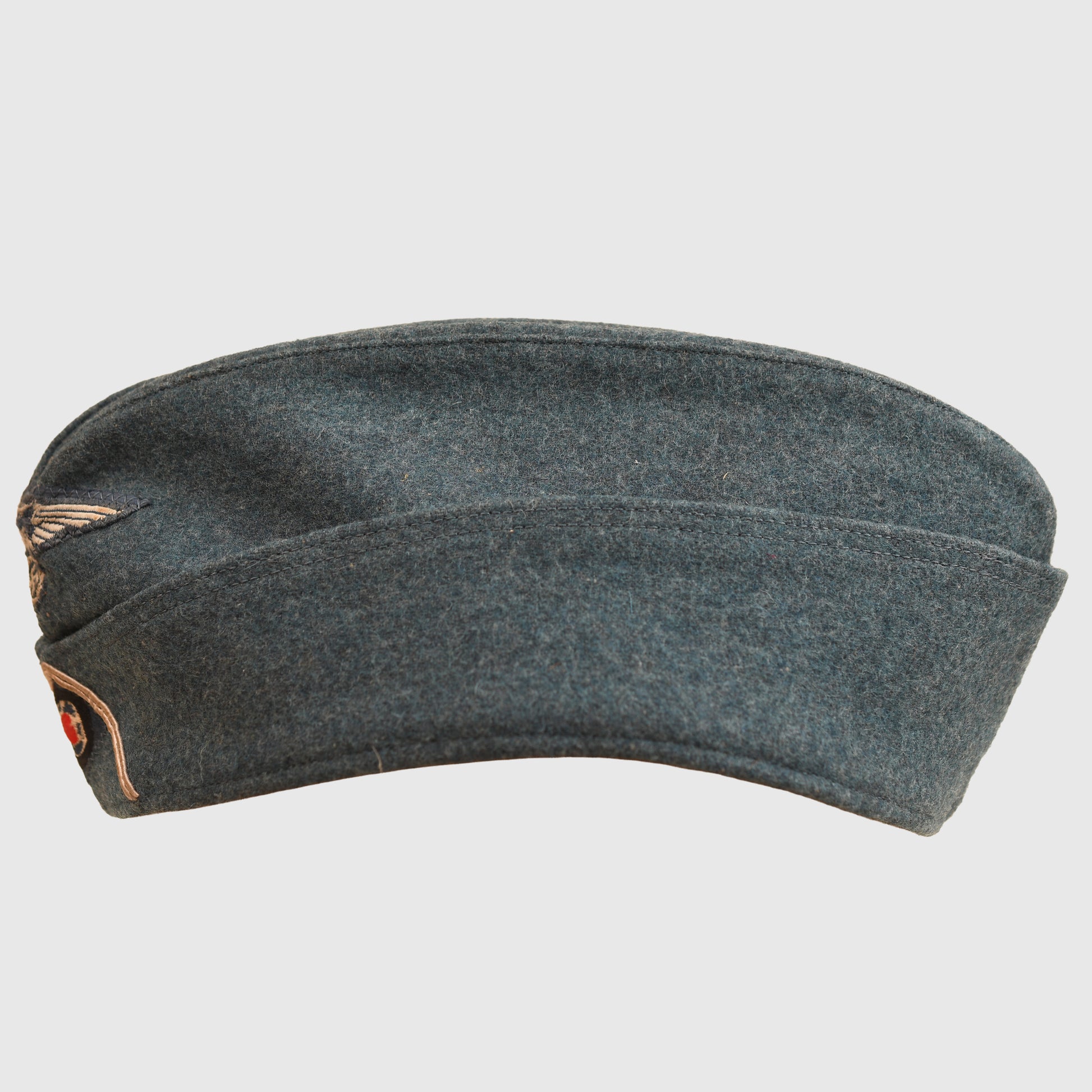 A very nice example of a Bahnschutz overseas cap in the classic light blue. Stamped size ‘55’ to the blue rayon lining. Free of moth damage with the nap in excellent condition. The Bevo woven eagle and cockade show slight fatigue, with minor shredding to the right-hand side of the eagle and small losses to the white section of the national coloured roundel.
