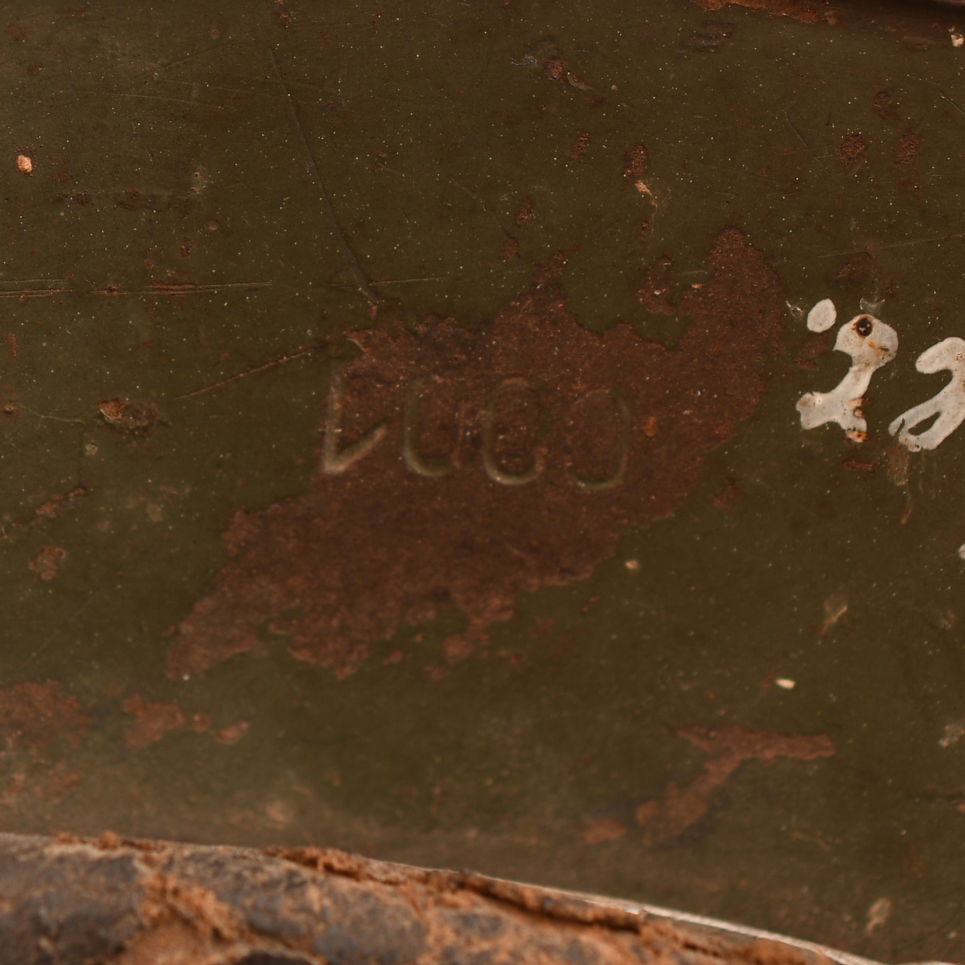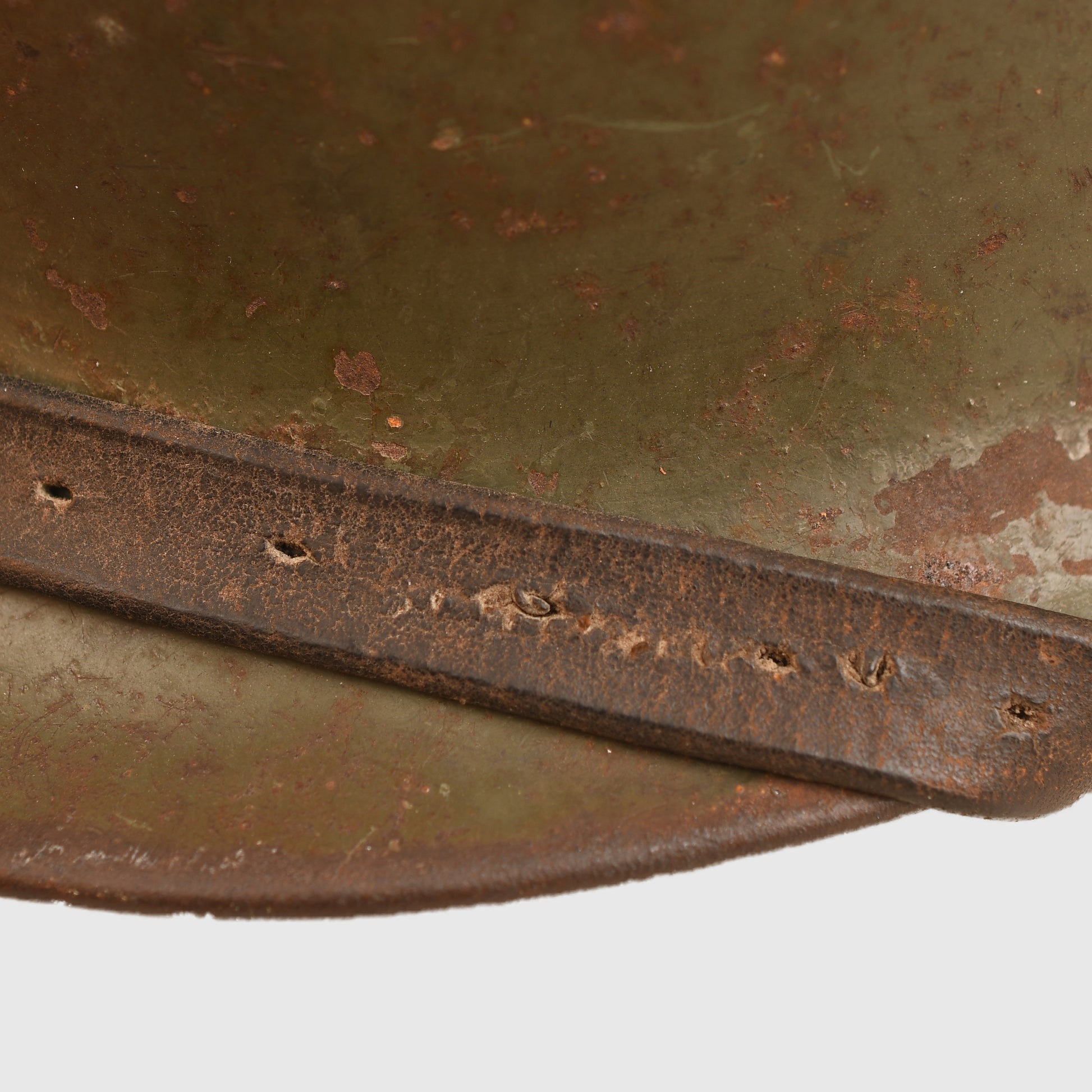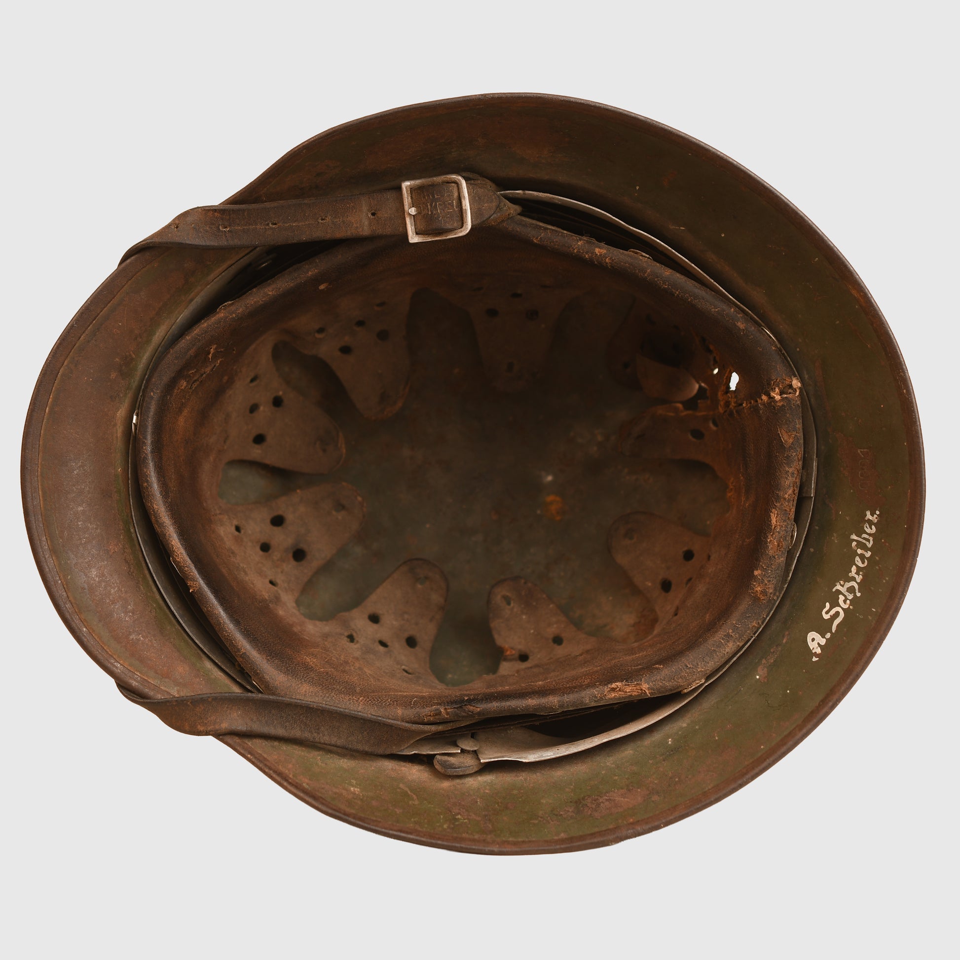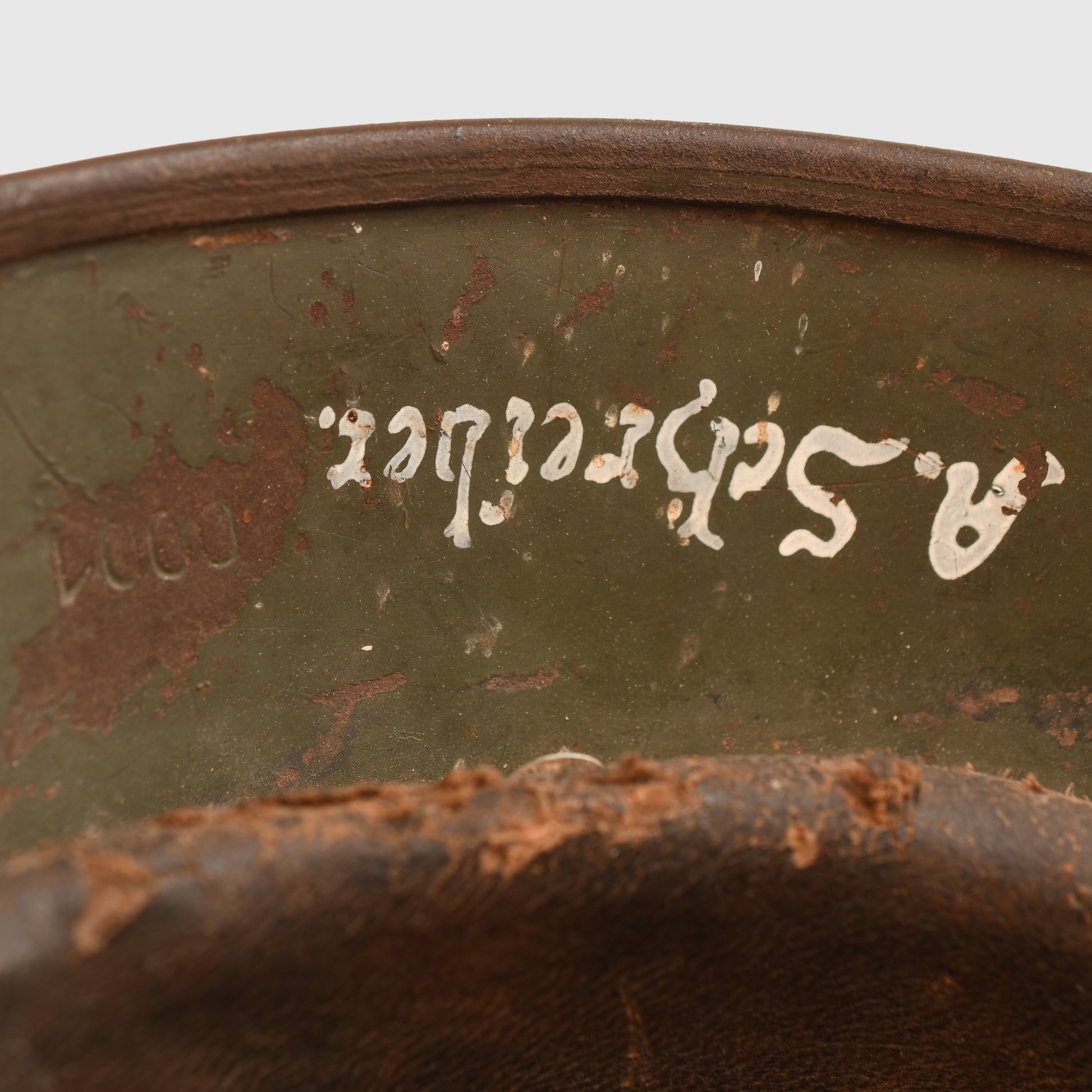 A rare and dramatic example of a battle-damaged M35 double decal helmet, sized 68 and originally issued in apple green. Approximately 50% of the original paint remains, with both decals faint but partially visible. The rear has sustained a heavy shrapnel strike, piercing both the outer shell and inner leather liner, with the liner showing corresponding holes. The square-edged strap posts are missing, likely removed prior to the damage, and the strap is wrapped around the inner aluminium liner band. The maker’s name and partial date remain visible on the tip of the leather strap passing through its aluminium buckle. The inner rear skirt bears the hand-applied initials “A. Schreiber” in white paint, and the batch number 0001 is clearly visible. This helmet is a compelling relic of combat history.