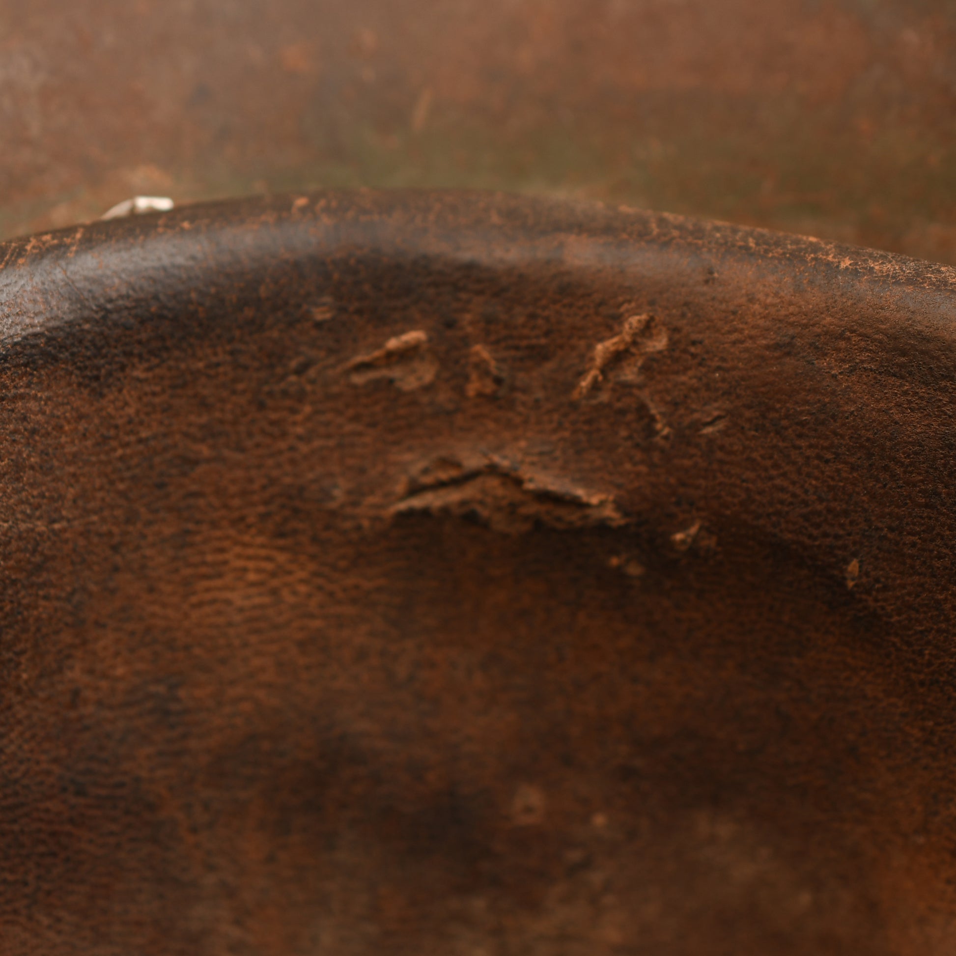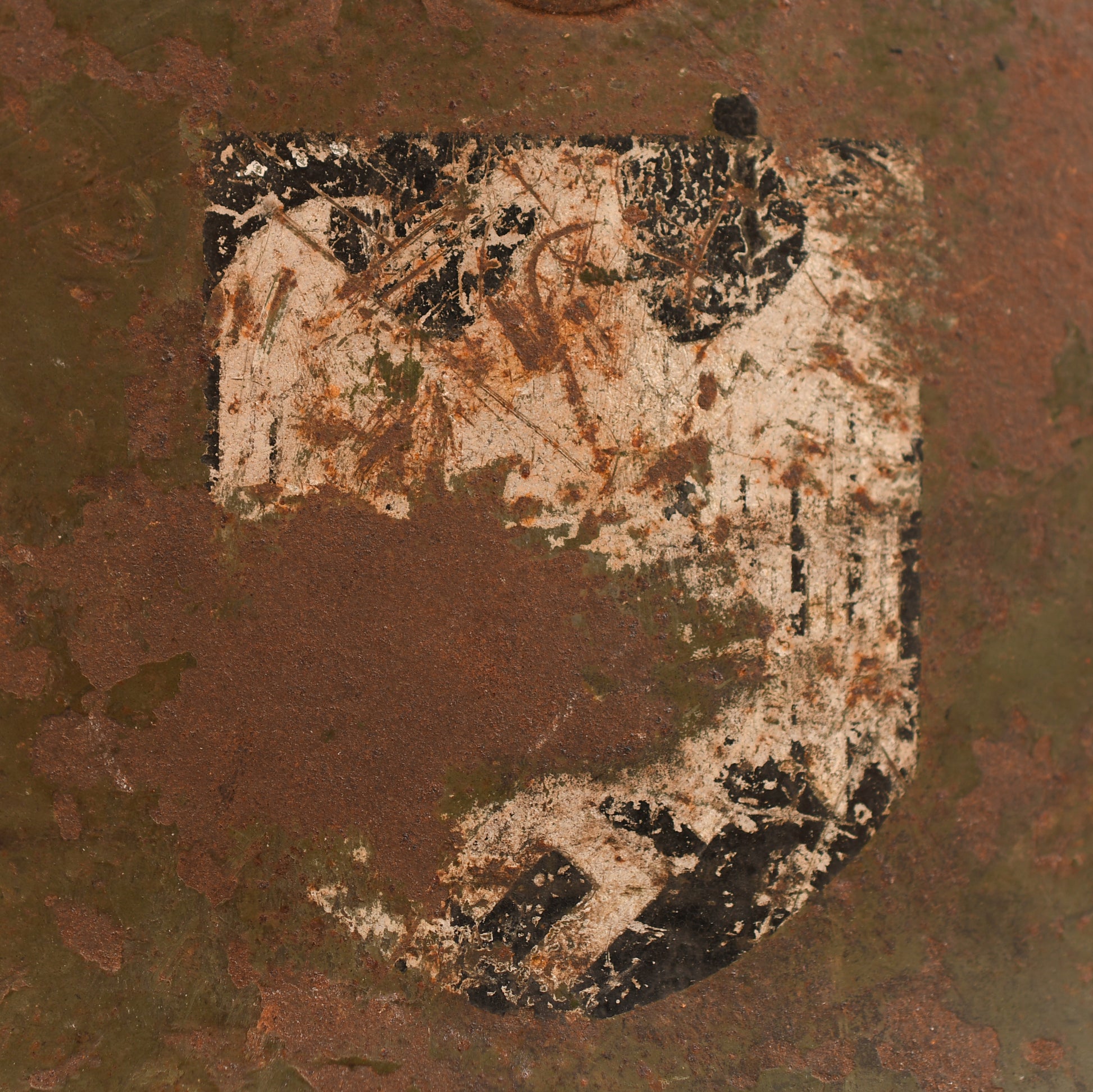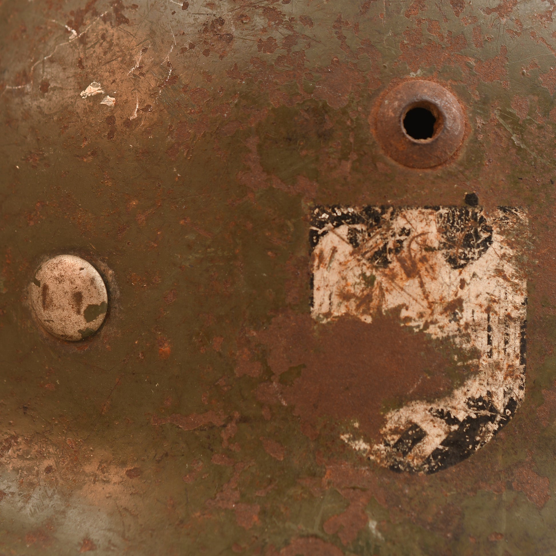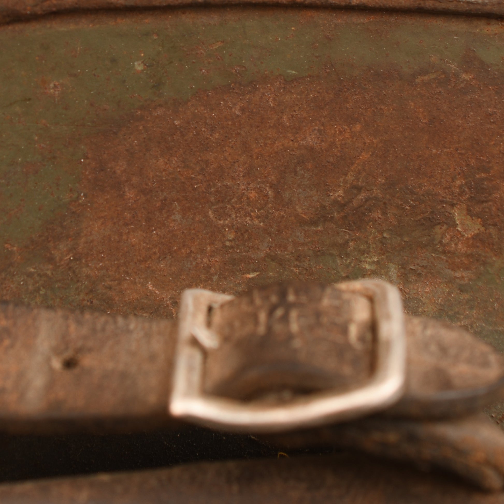 A rare and dramatic example of a battle-damaged M35 double decal helmet, sized 68 and originally issued in apple green. Approximately 50% of the original paint remains, with both decals faint but partially visible. The rear has sustained a heavy shrapnel strike, piercing both the outer shell and inner leather liner, with the liner showing corresponding holes. The square-edged strap posts are missing, likely removed prior to the damage, and the strap is wrapped around the inner aluminium liner band. The maker’s name and partial date remain visible on the tip of the leather strap passing through its aluminium buckle. The inner rear skirt bears the hand-applied initials “A. Schreiber” in white paint, and the batch number 0001 is clearly visible. This helmet is a compelling relic of combat history.