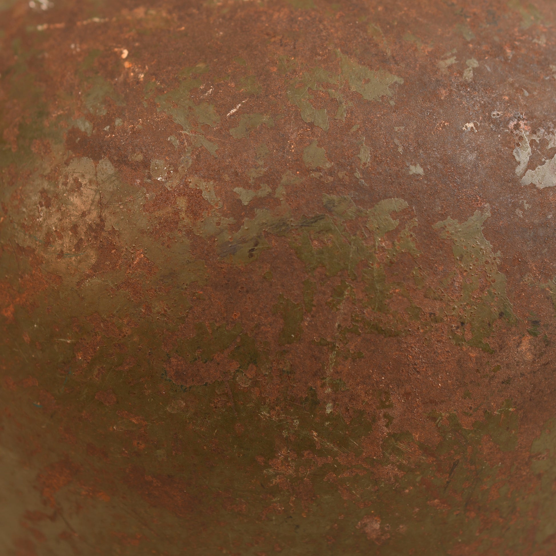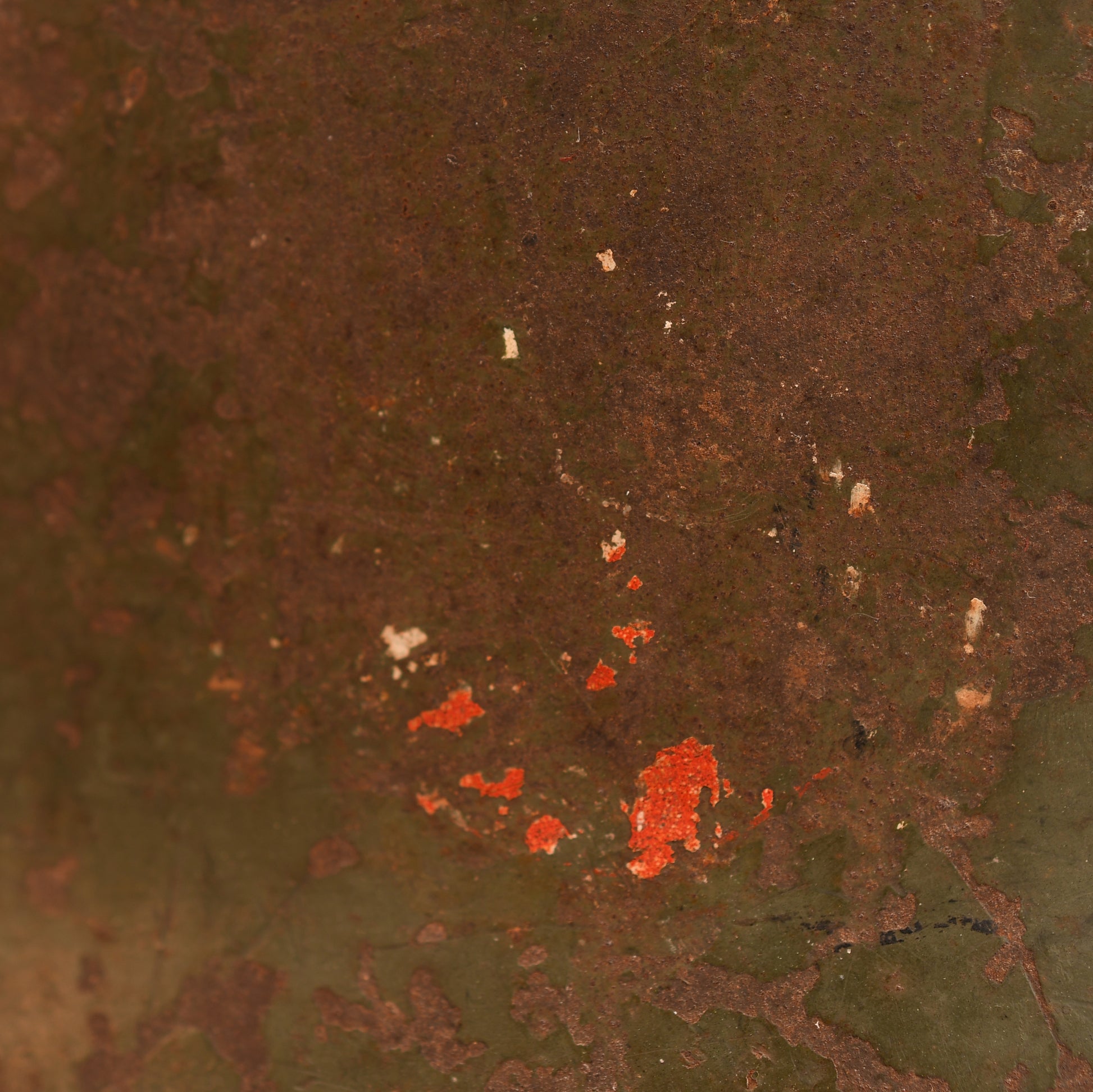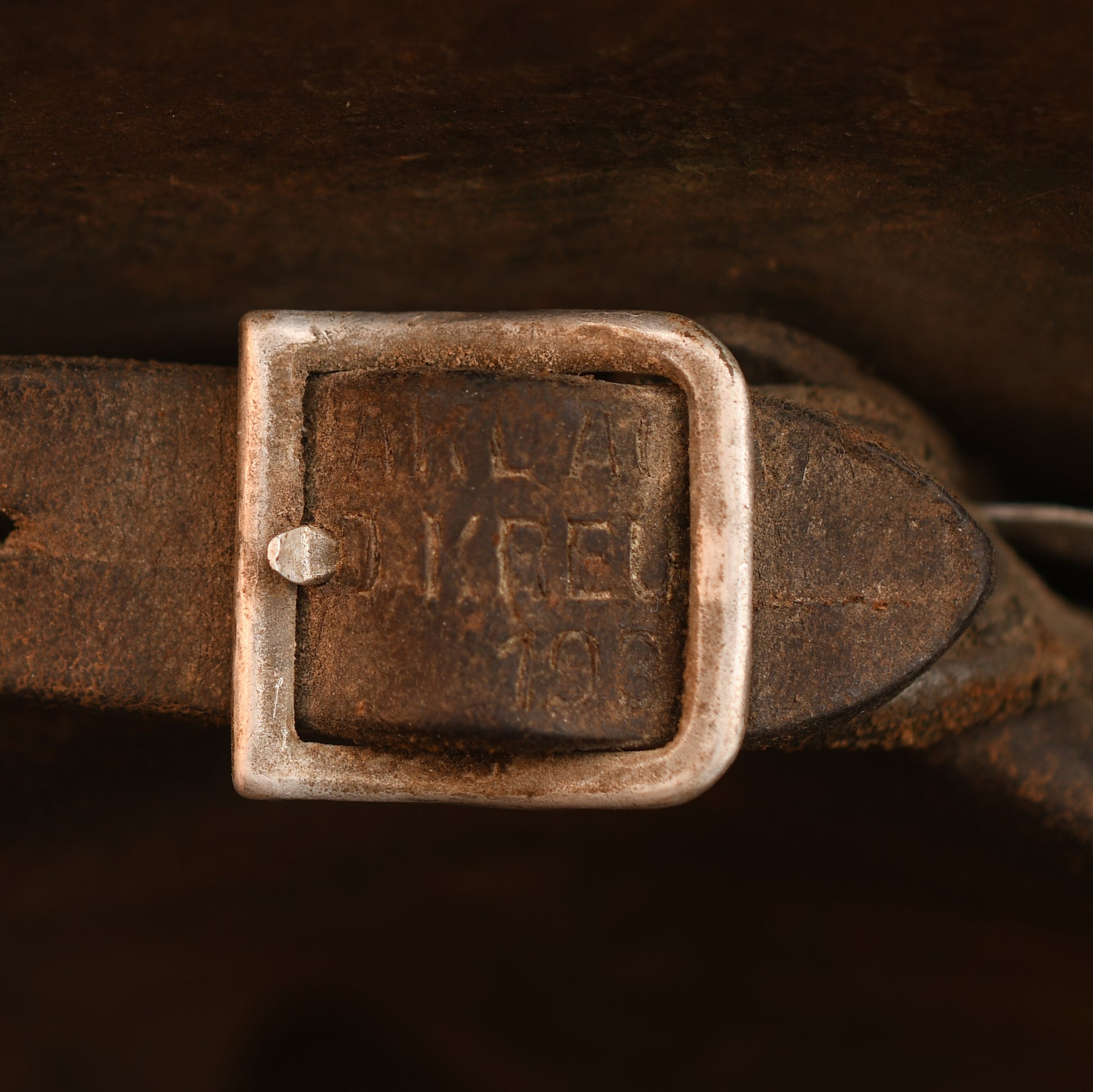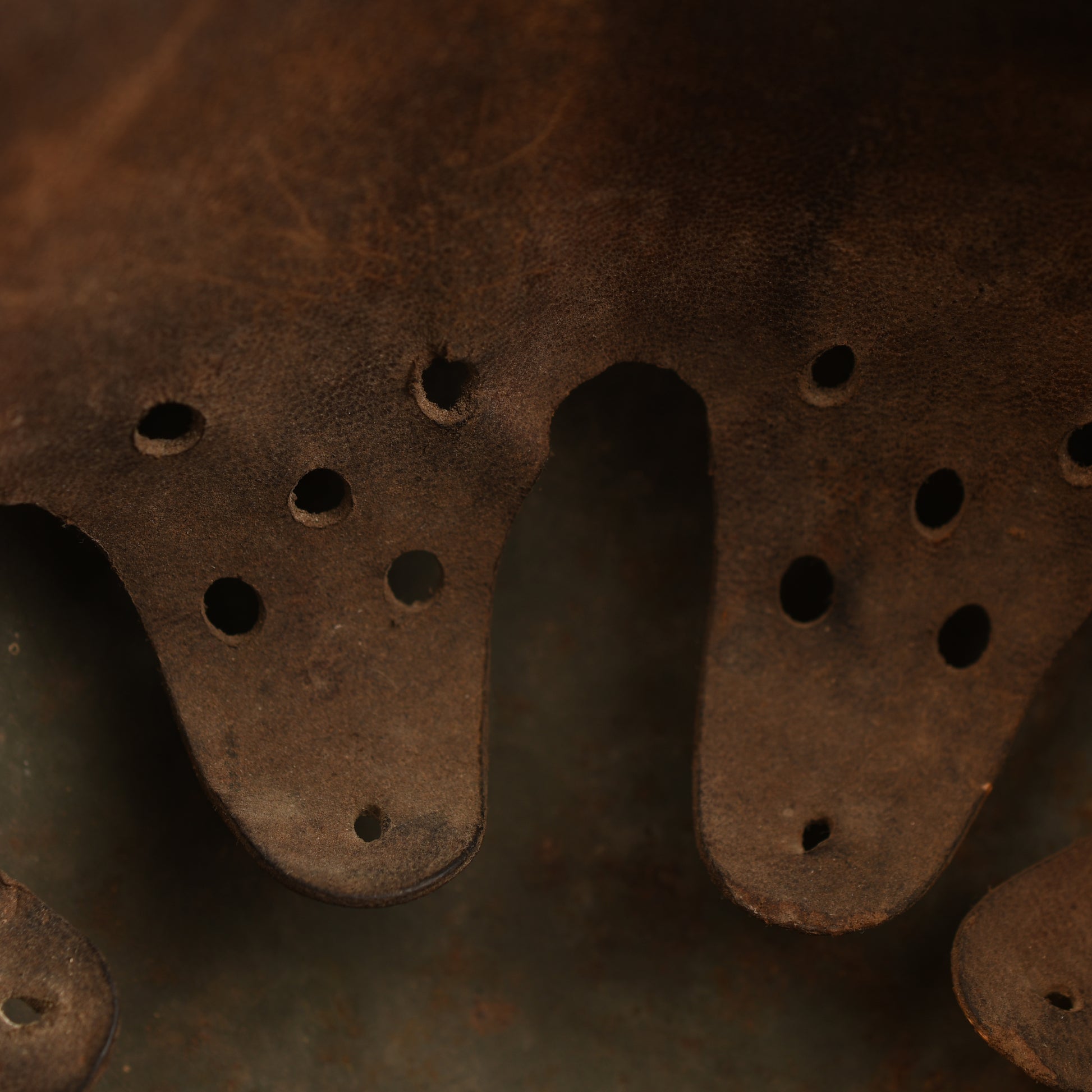 A rare and dramatic example of a battle-damaged M35 double decal helmet, sized 68 and originally issued in apple green. Approximately 50% of the original paint remains, with both decals faint but partially visible. The rear has sustained a heavy shrapnel strike, piercing both the outer shell and inner leather liner, with the liner showing corresponding holes. The square-edged strap posts are missing, likely removed prior to the damage, and the strap is wrapped around the inner aluminium liner band. The maker’s name and partial date remain visible on the tip of the leather strap passing through its aluminium buckle. The inner rear skirt bears the hand-applied initials “A. Schreiber” in white paint, and the batch number 0001 is clearly visible. This helmet is a compelling relic of combat history.