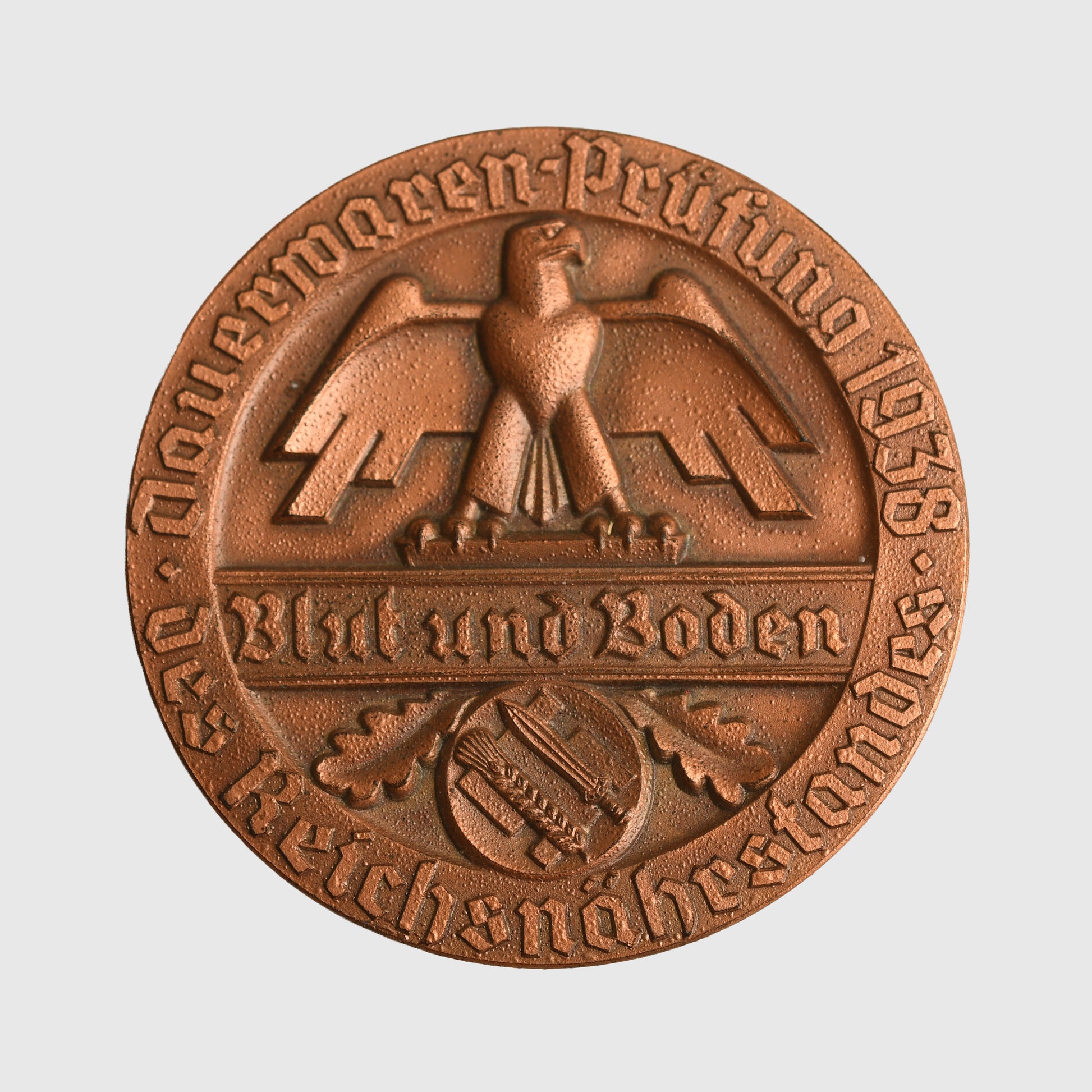 A mint unissued condition 5.5cm circumference heavy copper bronze medallion presented for the production of wine in 1938. Fitted into its presentation box, which is in mint condition and a bright silvered emblem of the organisation the ‘Reichsnahrstand’, to the exterior lid. All of the copper bronzed finish remaining to the award.
