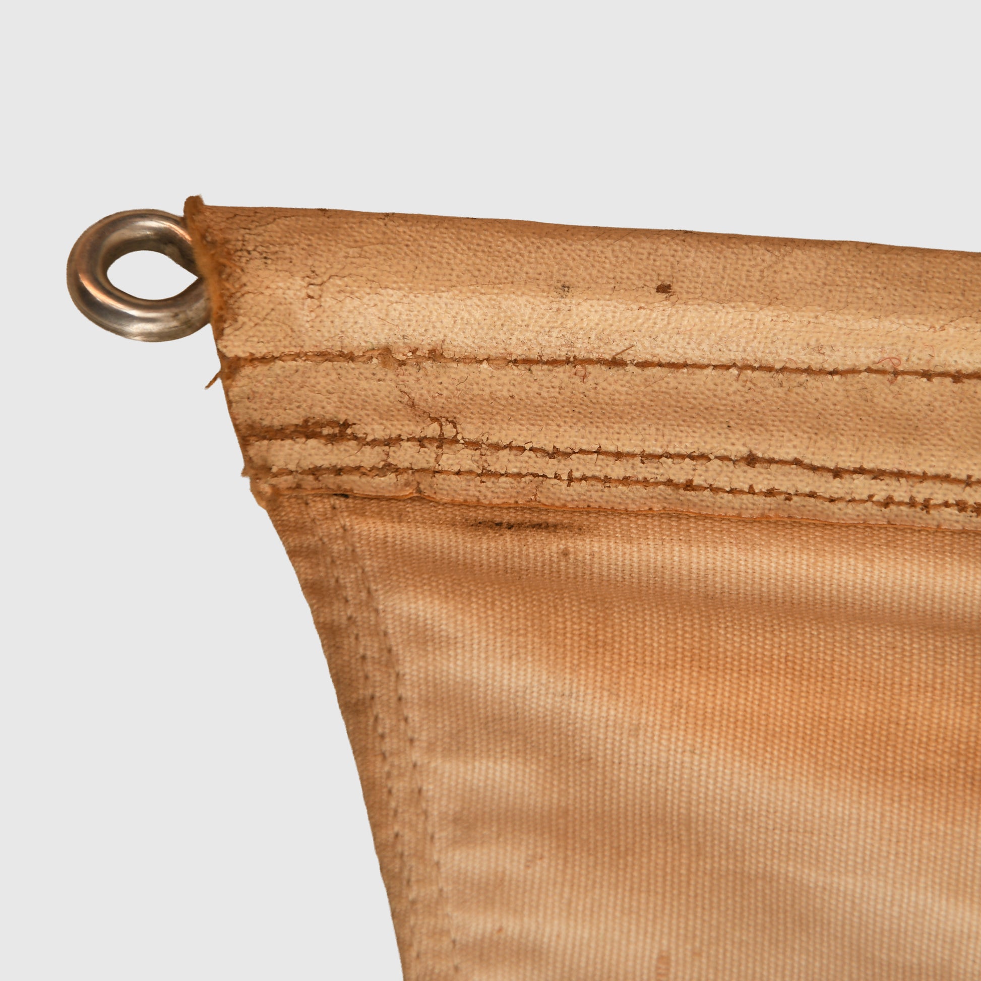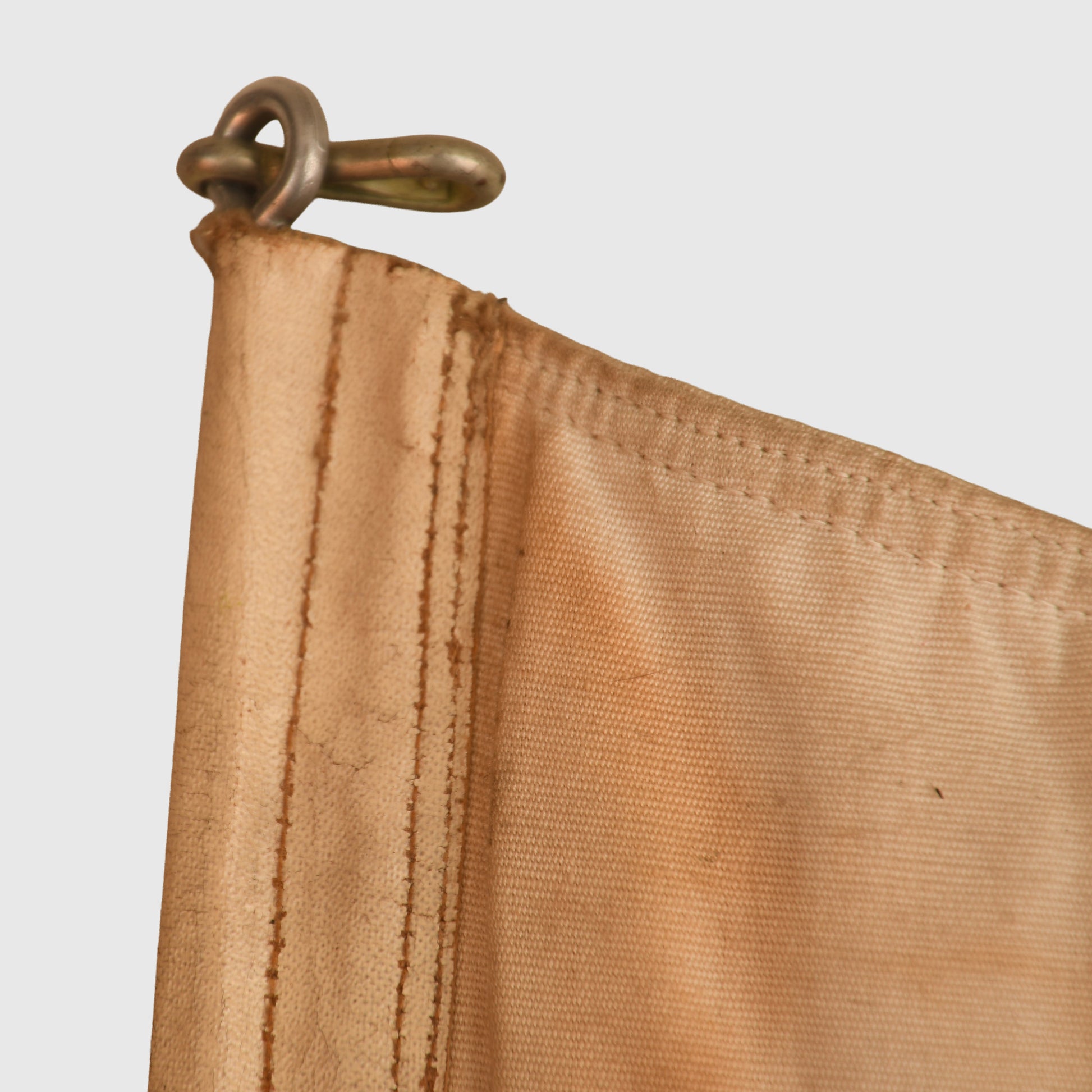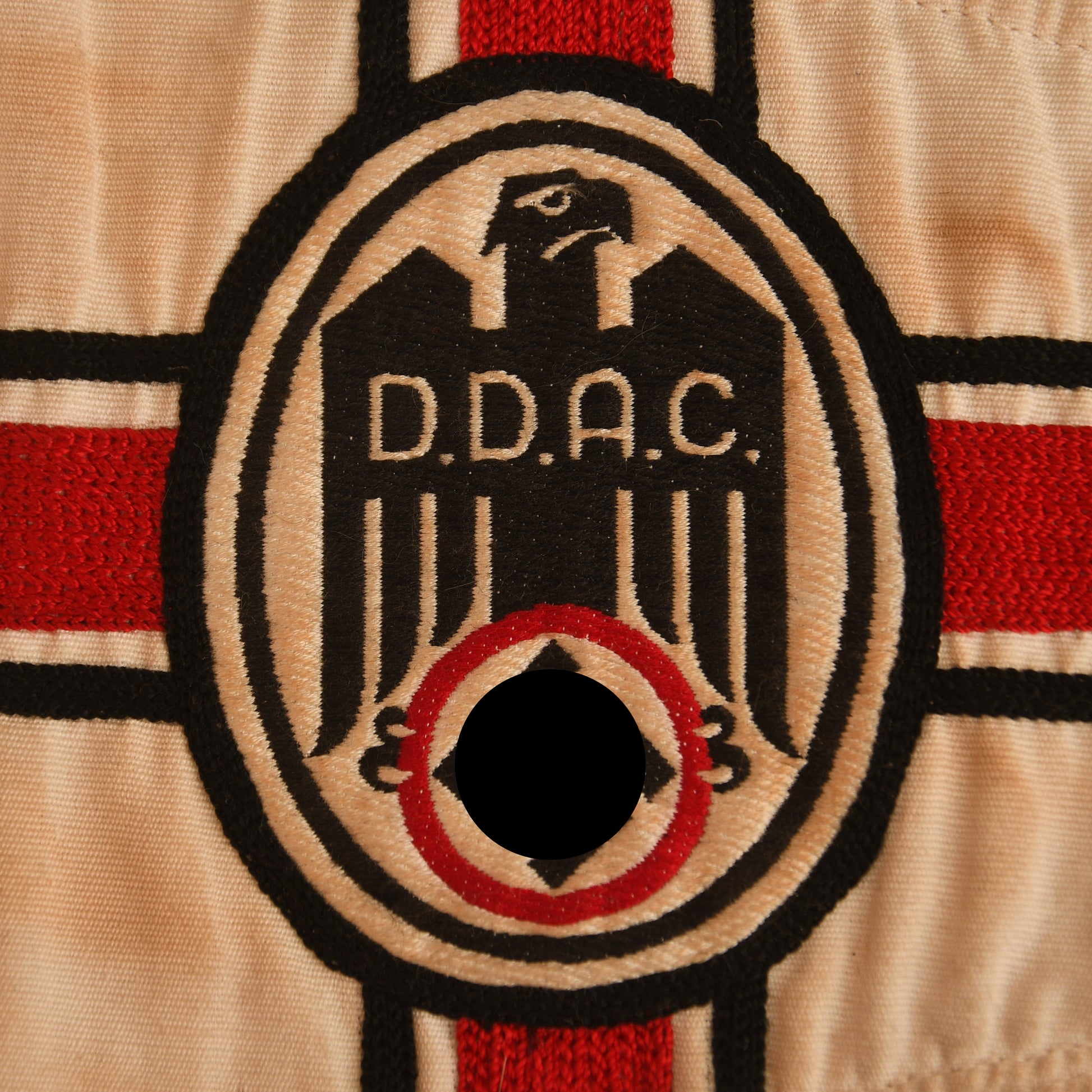 A well-constructed DDAC car pennant measuring 38 x 21 cm. The central logo features a machine-woven oval insignia of the DDAC, overlaid with finely machine-crocheted black, red, and white crossed motifs on a white field. Minor age staining is present. Complete with its original mounting rod and one hanging clip.