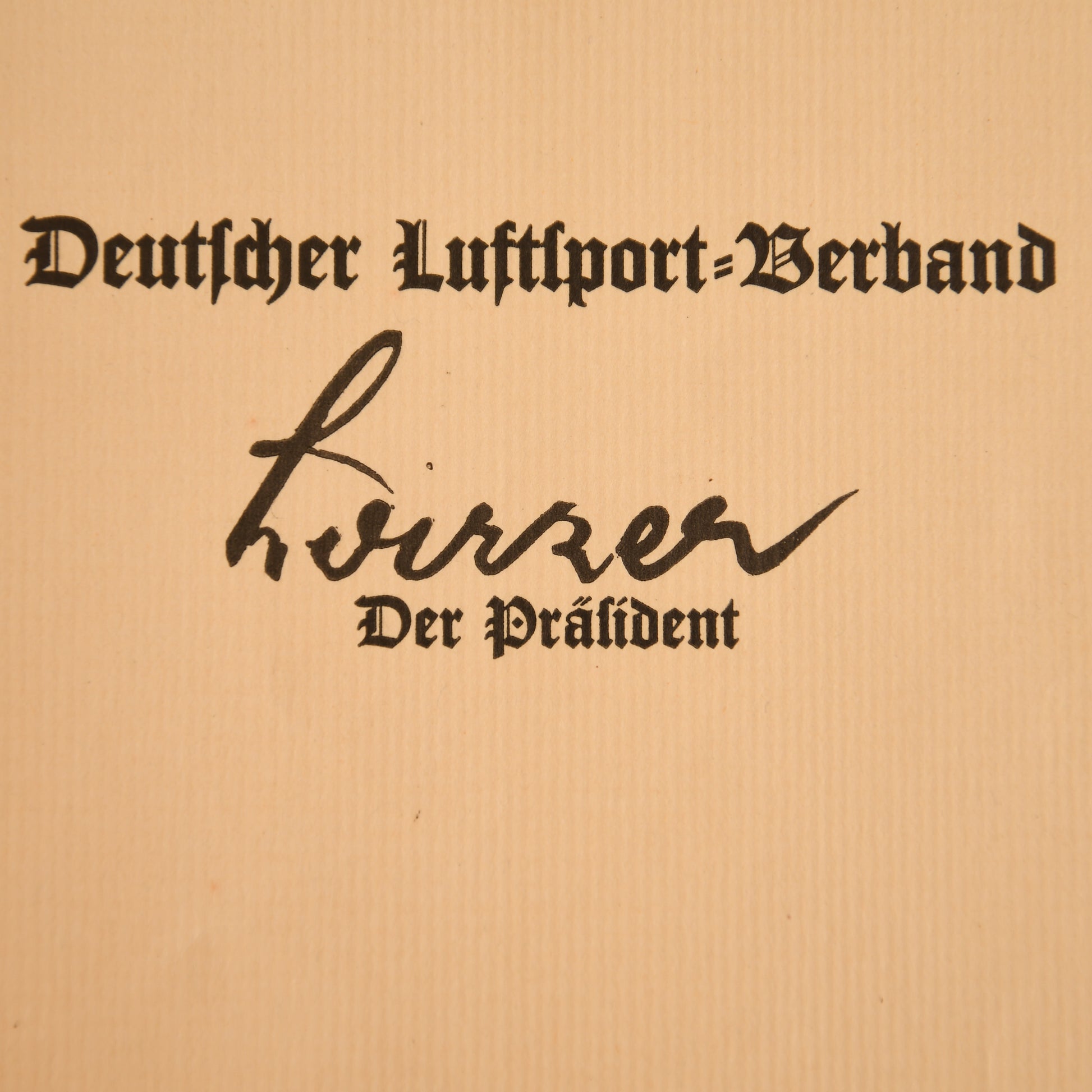 A highly impressive and beautifully presented document commemorating the founding of the Deutscher Luftsportverband (German Air Sports Association), the organisation that would later evolve into the Luftwaffe. Bound in rich brown leather, the cover features the DLV badge embossed in gold at the top corner, with matching gold titling along the lower edge.