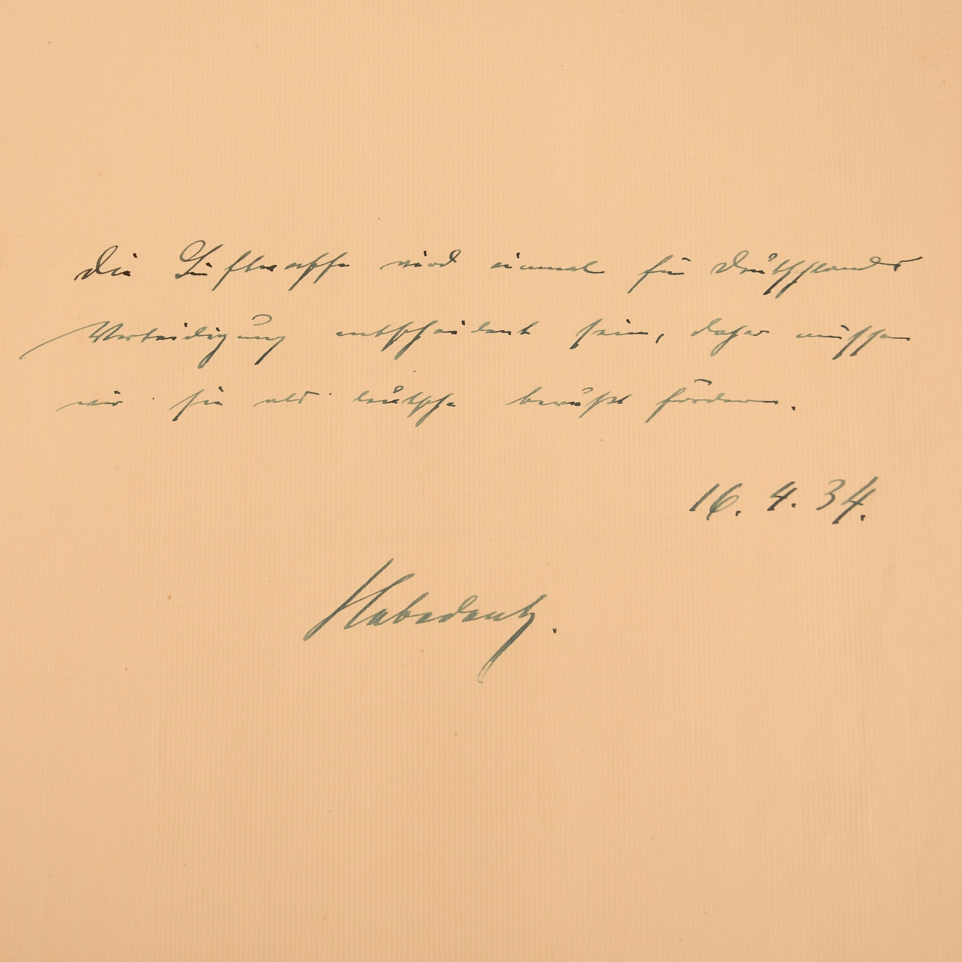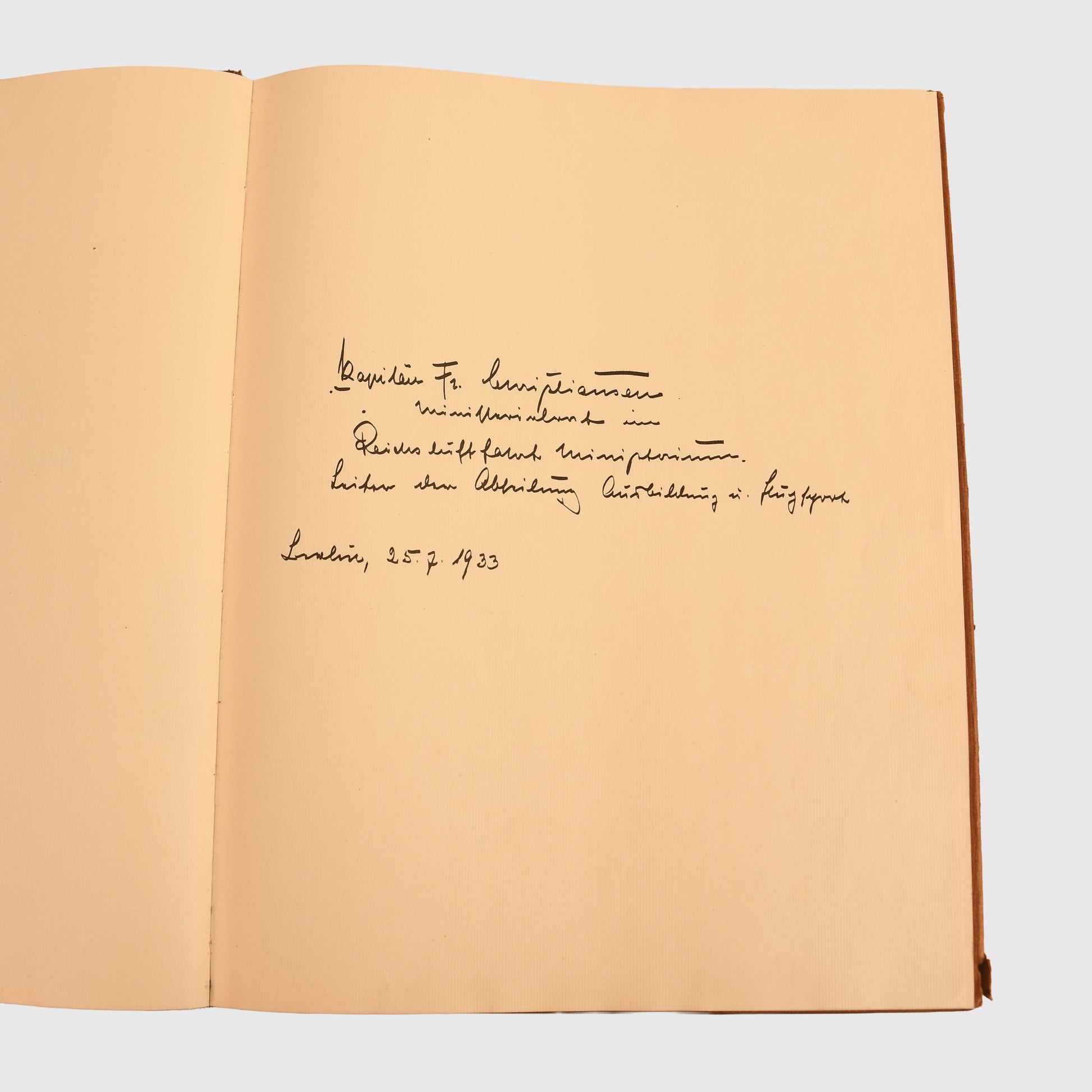 Inside, the document includes printed facsimile signatures of key figures such as Bruno Loerzer (1st President, Berlin, July 1933), President Paul von Hindenburg, Adolf Hitler, Hermann Göring, Erhard Milch, and five other senior officials of the period. The folder measures approximately 30cm x 37cm and retains its original stiff brown paper wrapping. A striking and historically significant presentation piece representing the early formation of Germany’s aviation organisation.