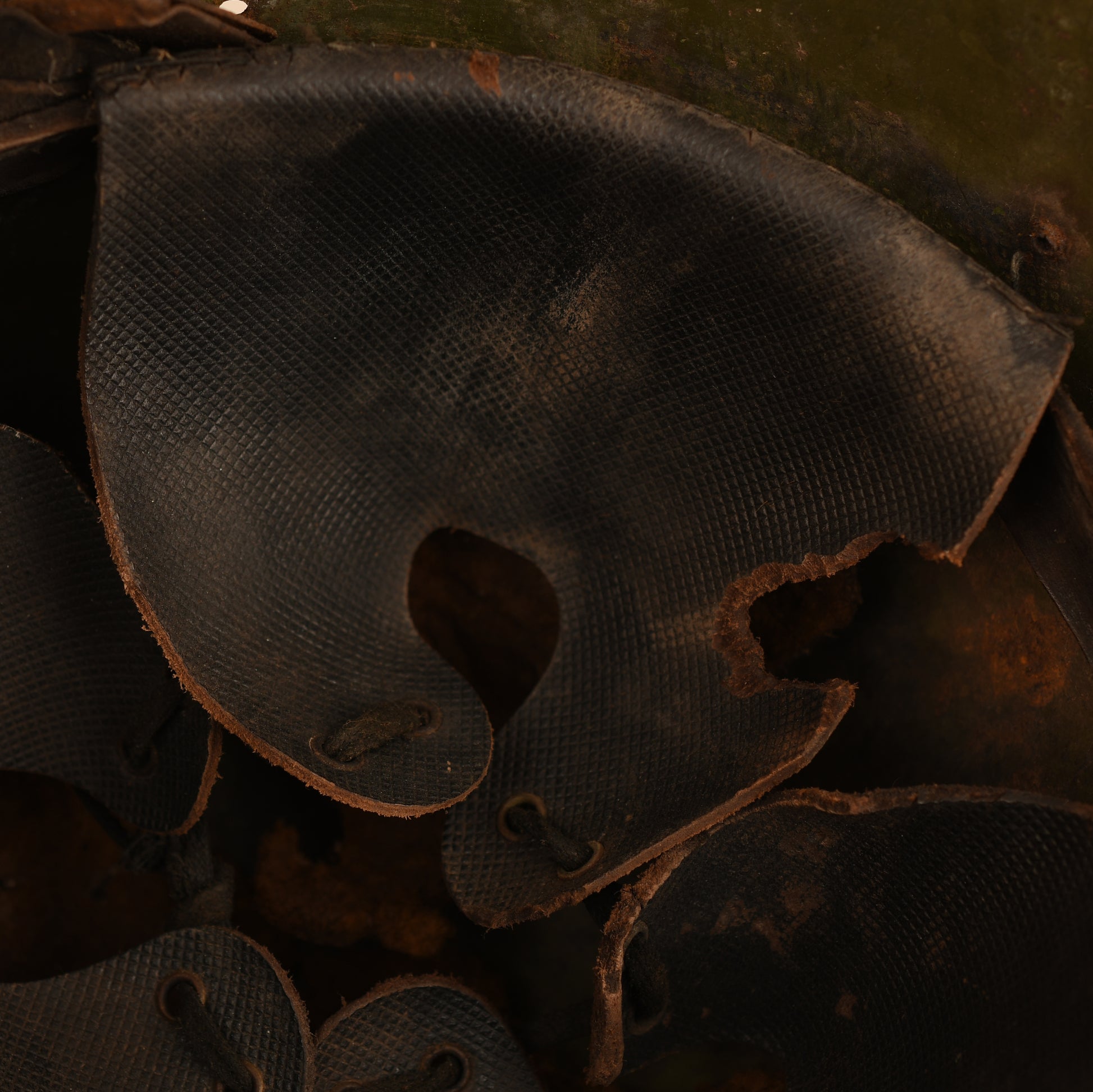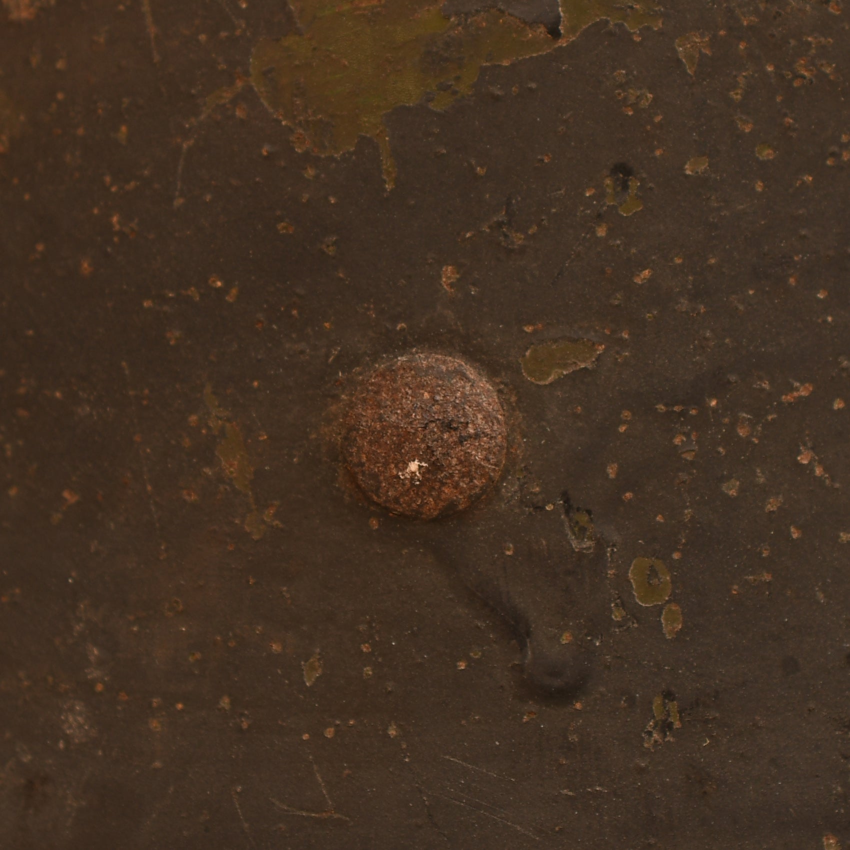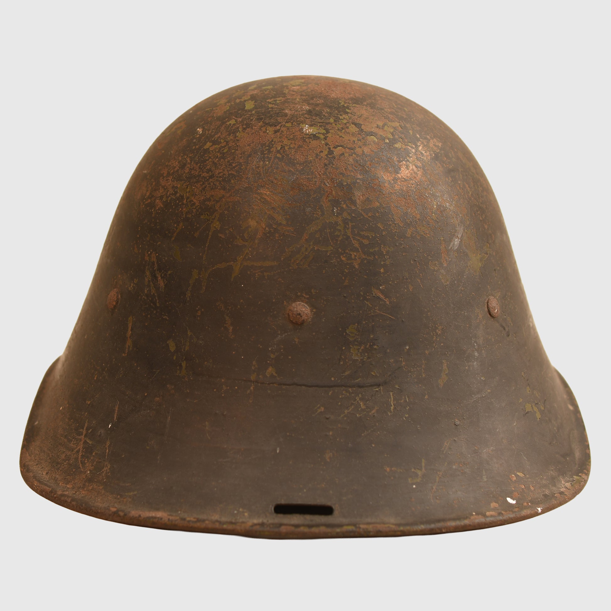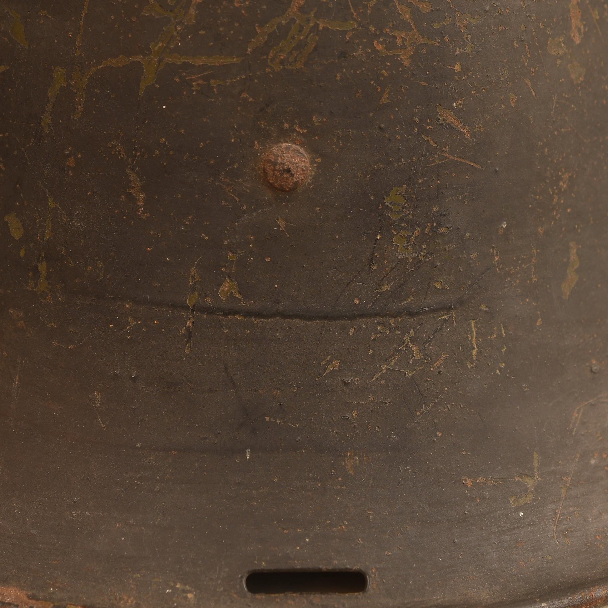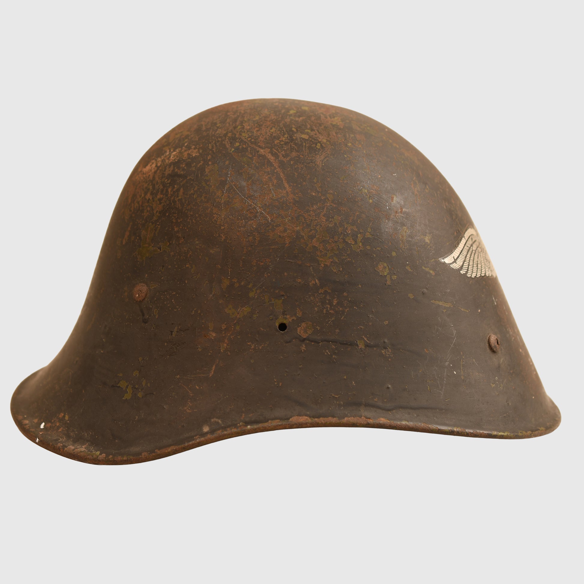 One liner-retaining rivet is missing on the left-hand side when viewed from the front. Helmets of this type, German-utilised foreign designs, are particularly interesting to collectors of Luftschutz and RLB equipment.