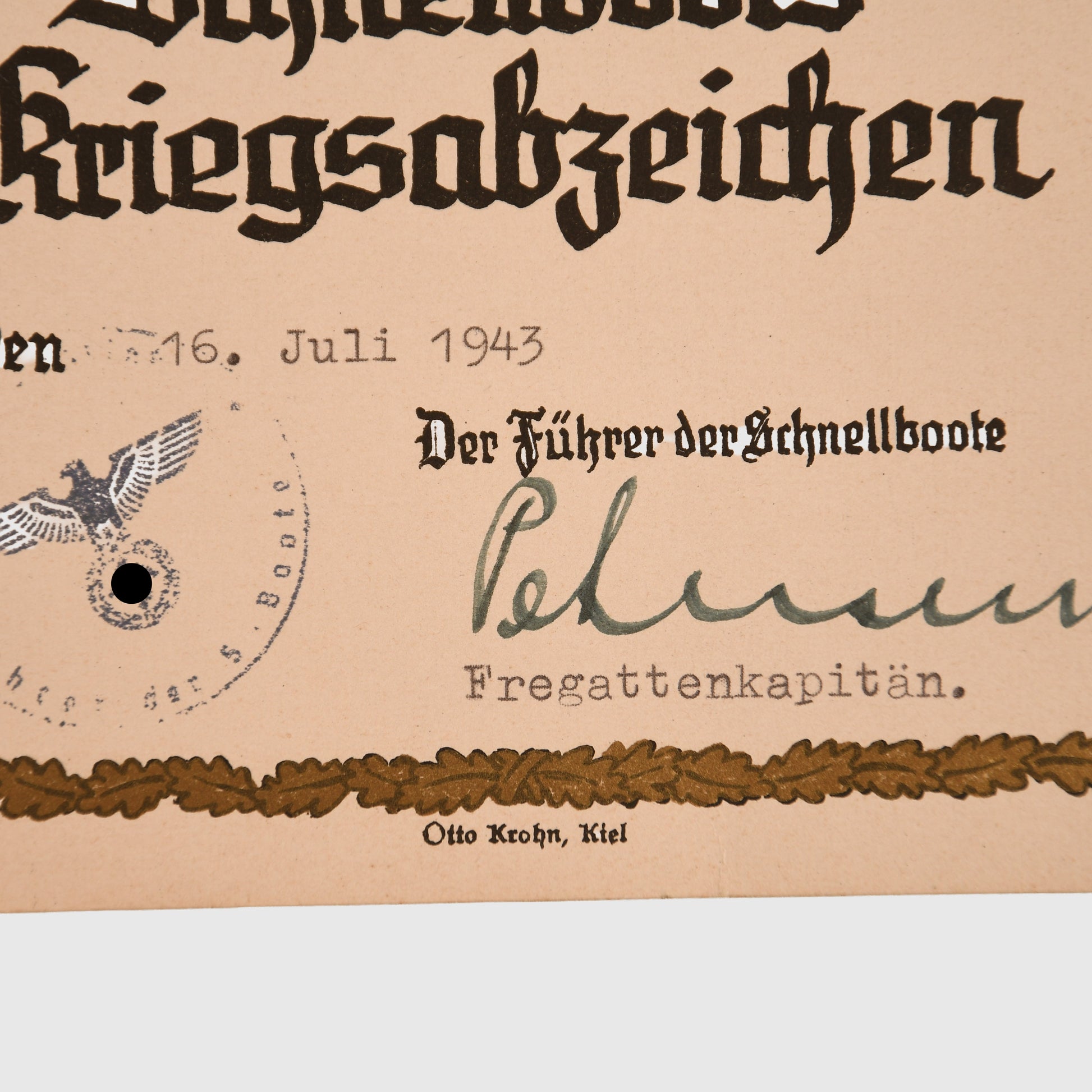 A rare and attractive grouping to Gefreiter Wilhelm Krause of the 1st Schnellboots Flottille. Includes a finely illuminated E-Boat badge citation in gold and silver print, dated 16th July 1943, bearing the signature of an unidentified junior officer. The document is folded once with a small paper clip mark to the top left corner.