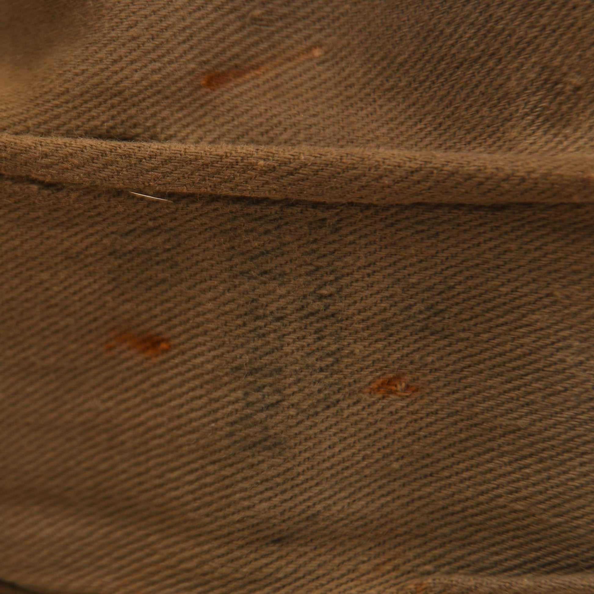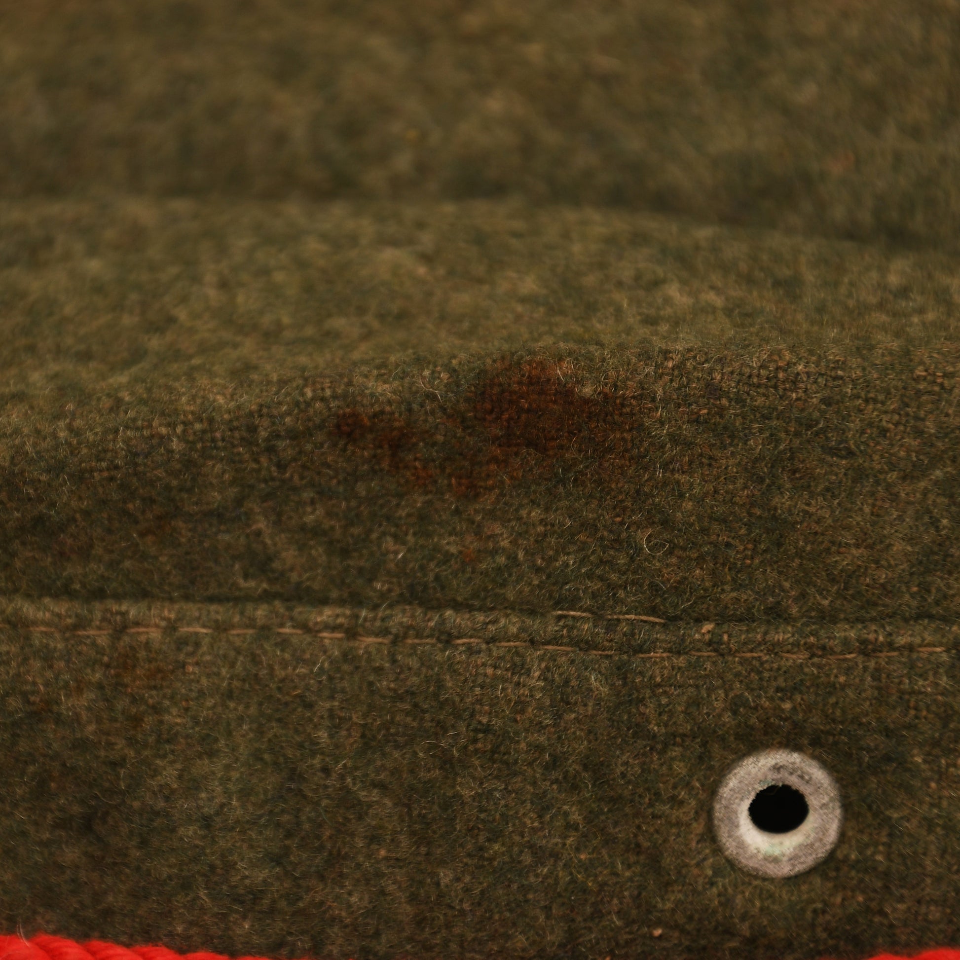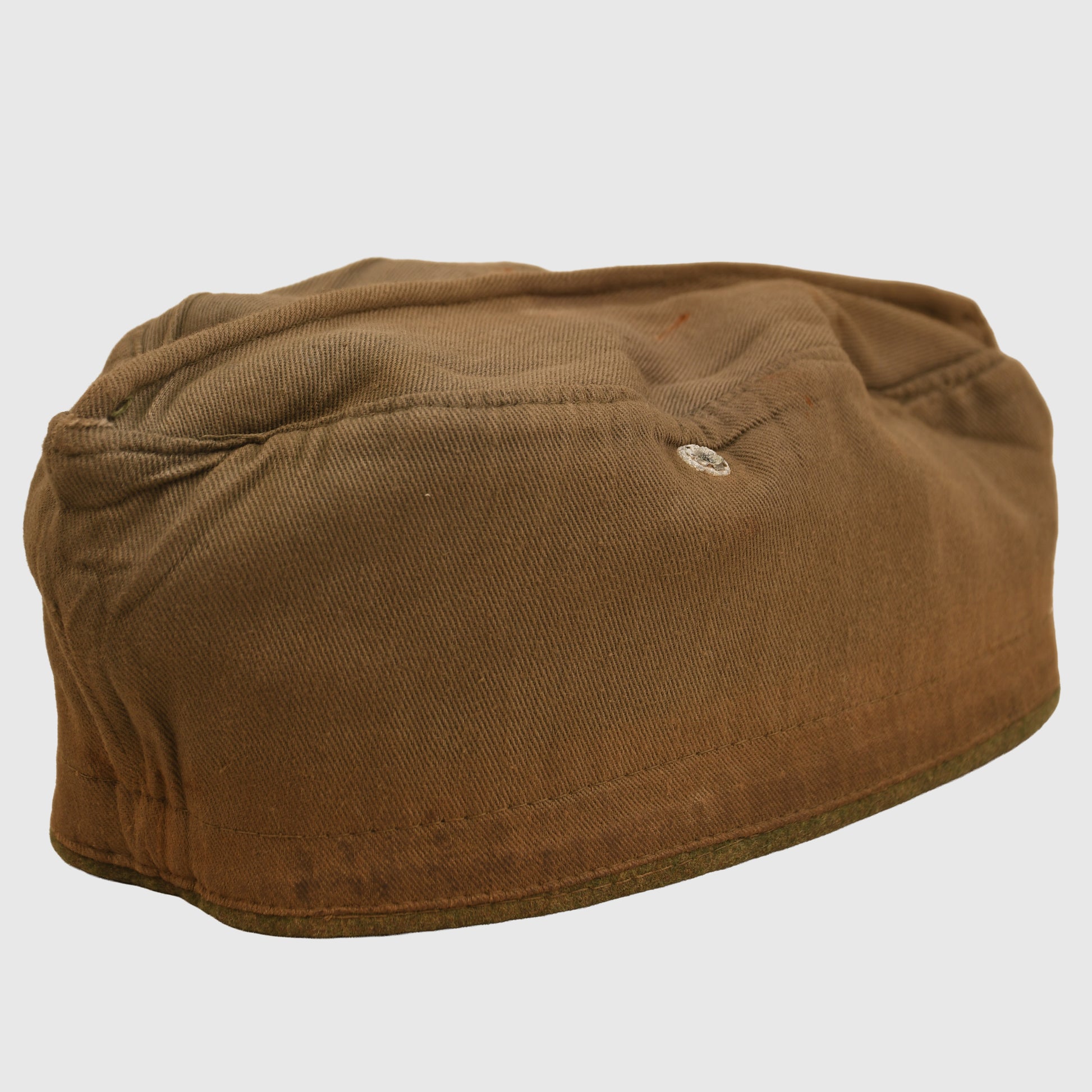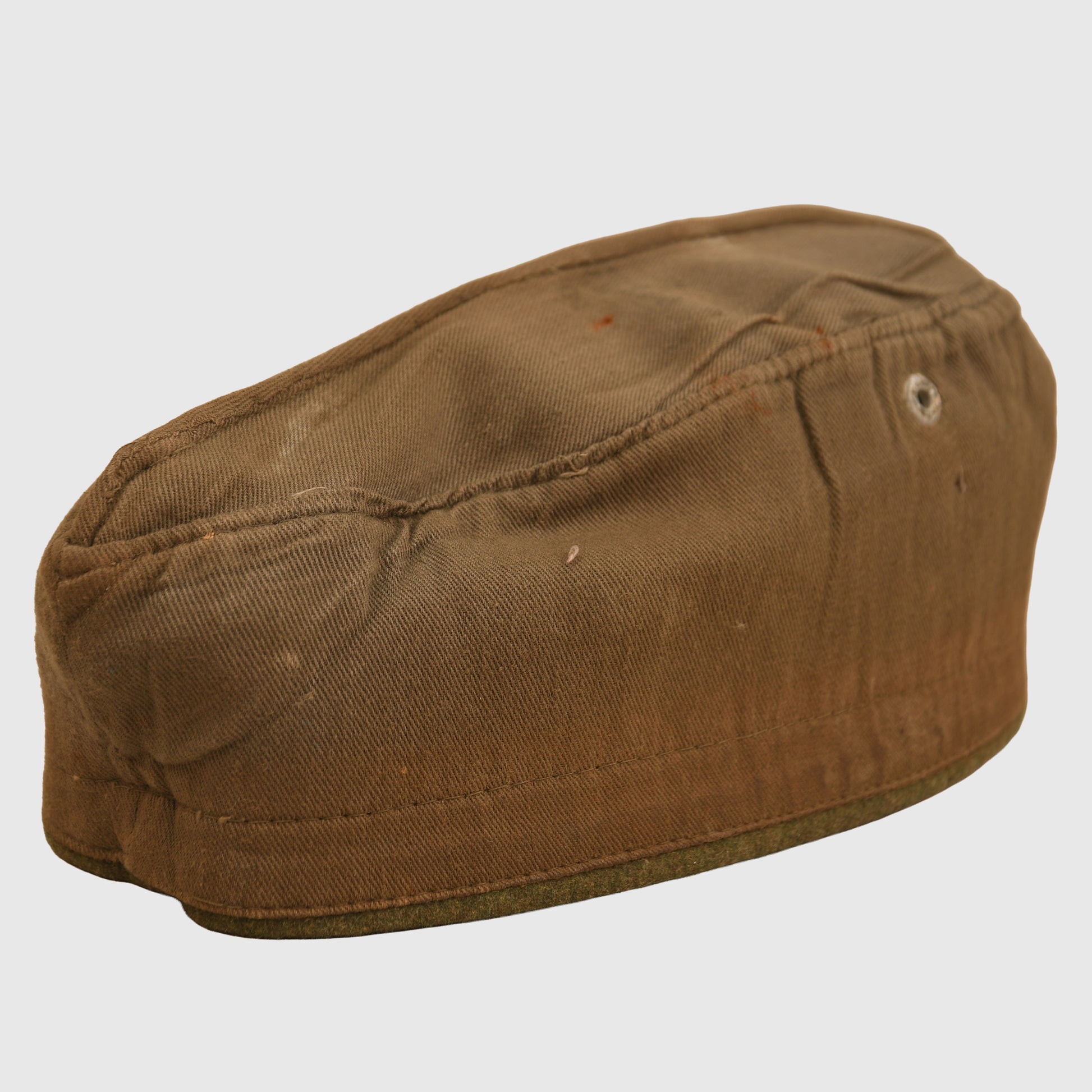A large size M.38 field grey overseas cap in standard configuration with a single air vent. Fitted with a grey-on-green Bevo woven national eagle and matching cockade, with a run of white inverted V waffenfarbe for infantry. The cap features an unusual addition of red cording around the full circumference, possibly associated with a Foreign Volunteer unit. Two small moth holes to the right of the white waffenfarbe and some thinning to the cloth nap. Interior stamped size 59 or 60 with faint remnants of a maker’s ink stamp. The brushed cotton lining shows considerable wear, and the zinc eyelets display some oxidation. A scarce and interesting example.