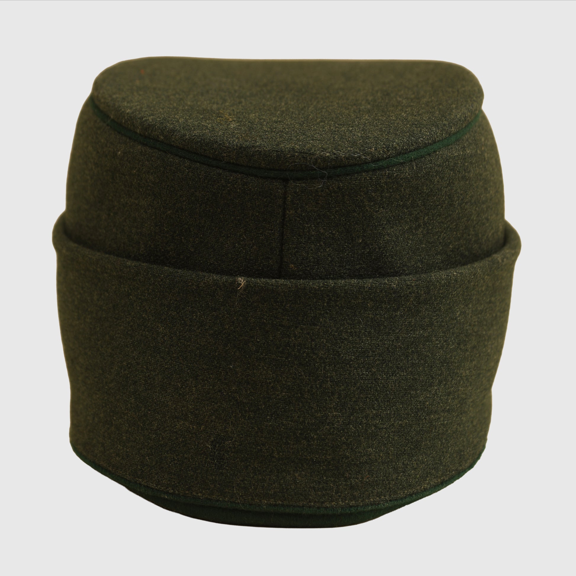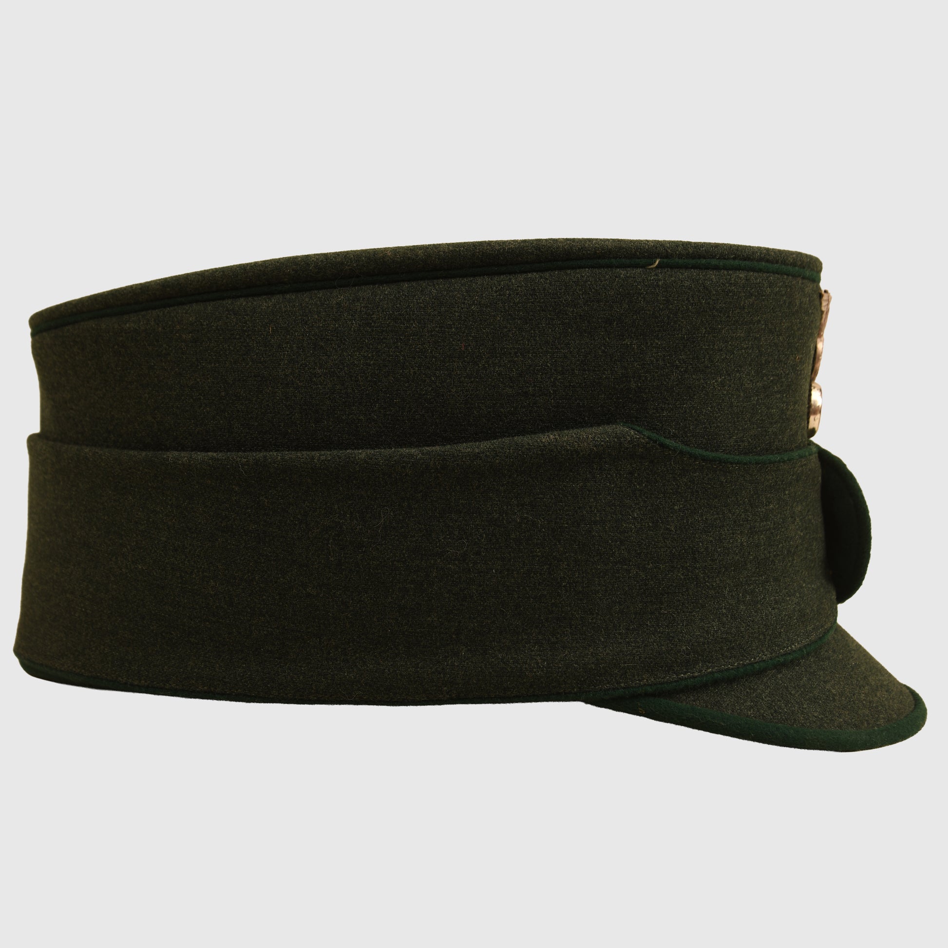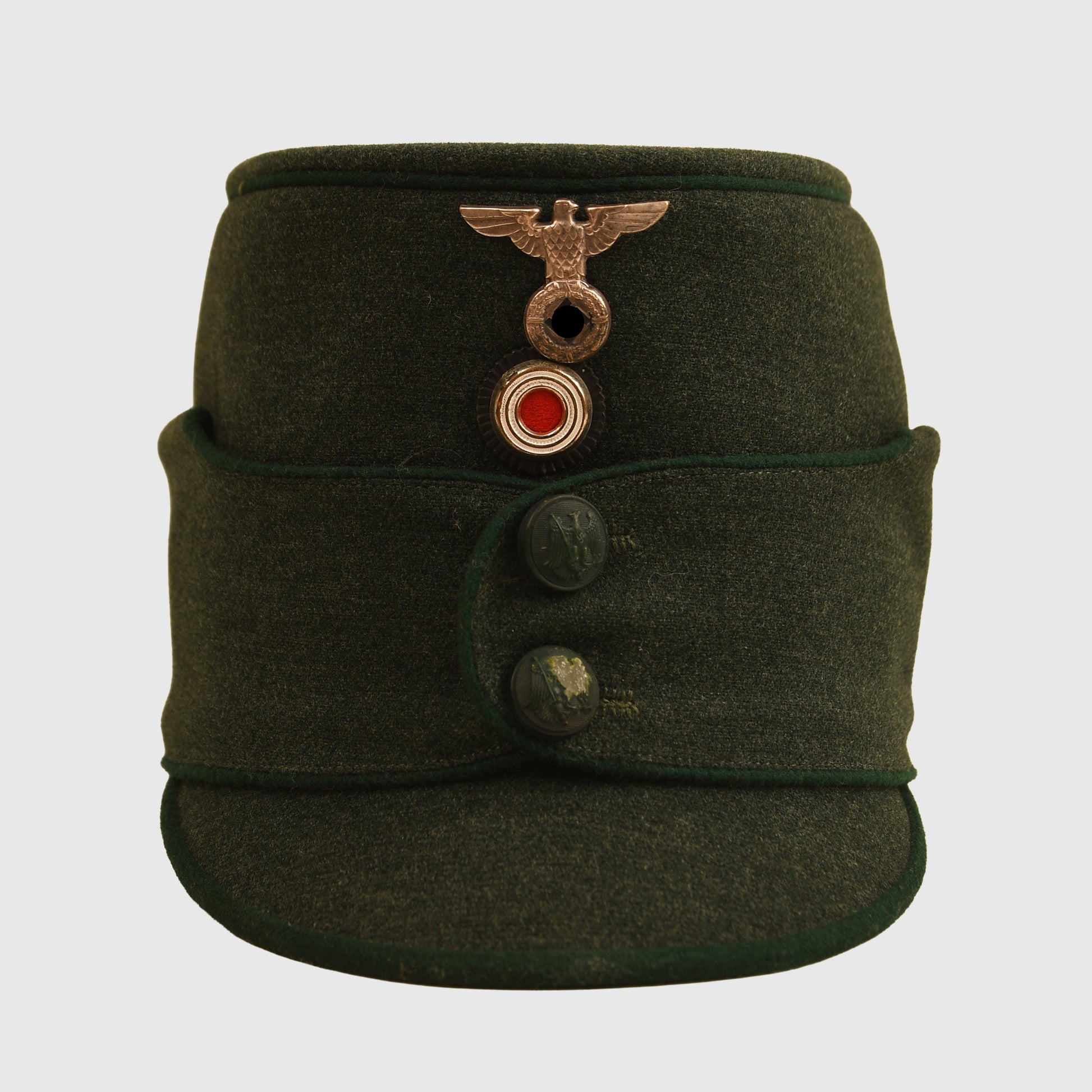An extremely scarce example of the Prussian Forestry Baschlikmütze, dating from 1934–35. Constructed in forestry green with darker green piping, this large size cap (approx. 59–60) remains in superb condition with no moth damage. The front is fitted with two Prussian eagle buttons with swastika centres, the lower button showing some surface abrasion. Complete with Prussian cockade and the M.29 SA-style political eagle. The light tan leather sweatband is intact, accompanied by a quilted, multi-stitched winter lining. Maker’s name ‘Cottbus’ is silver-blocked to the sweatband. A highly desirable and rare forestry service cap.