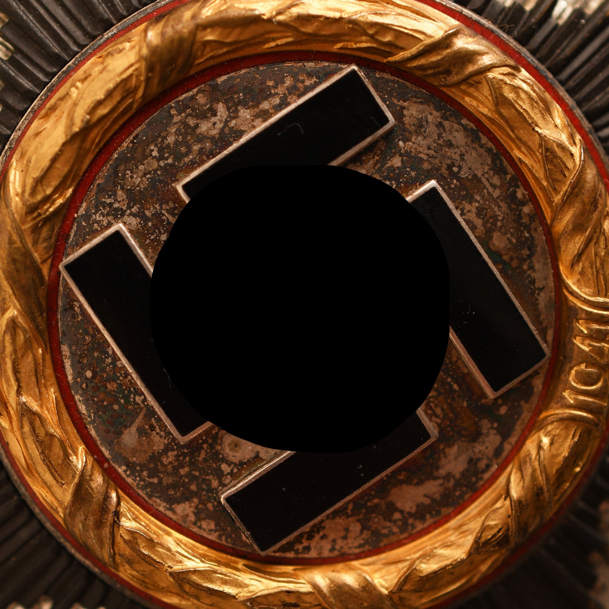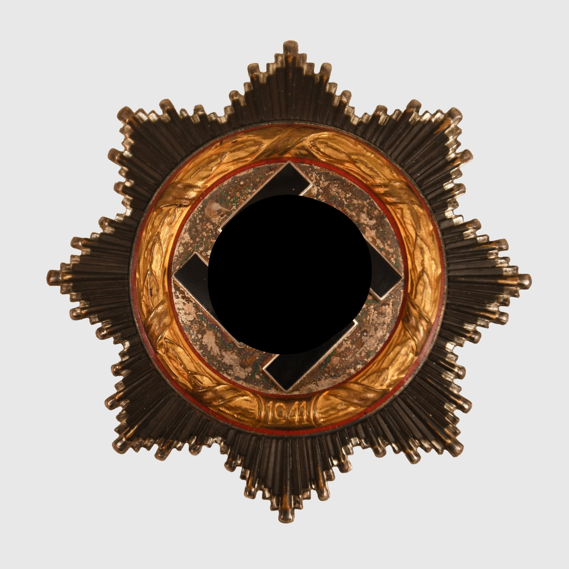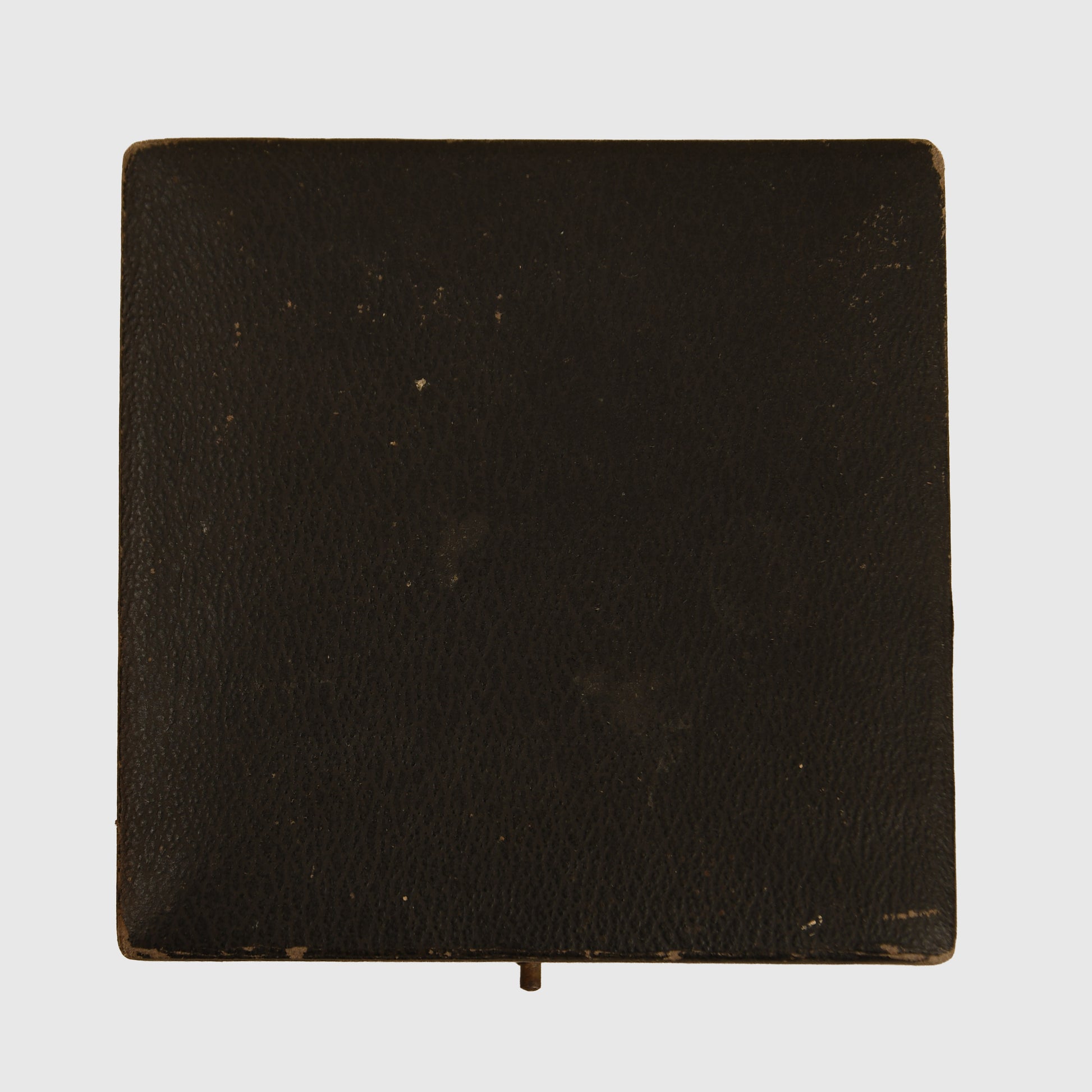 A fine example of a Zimmermann & Co. produced German Cross in gold, marked number ‘20’. The classic construction features four domed hollow rivets, a wide tapering pin, and original hook and hinge. The 1941-dated wreath retains good gilt, with excellent enamels throughout. All black finish remains on the rays, and virtually all silver finish to the star behind the rays is intact. The red enamel of the disc beneath the wreath is complete and undamaged. Fitted in its original gold-lined presentation box, showing minor scuffing to the edges and an impression of the wreath on the upper inner lid.