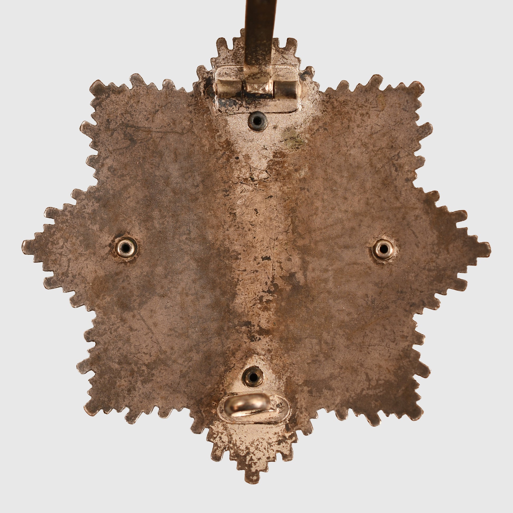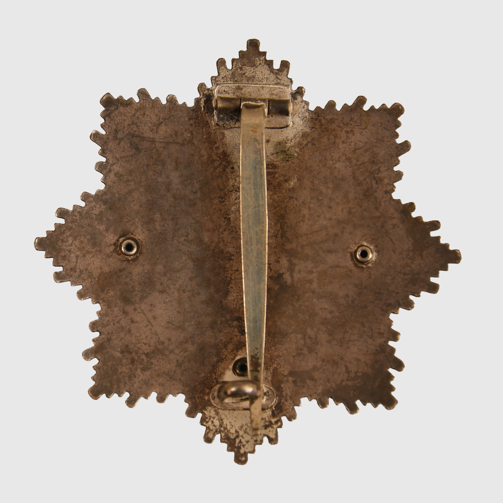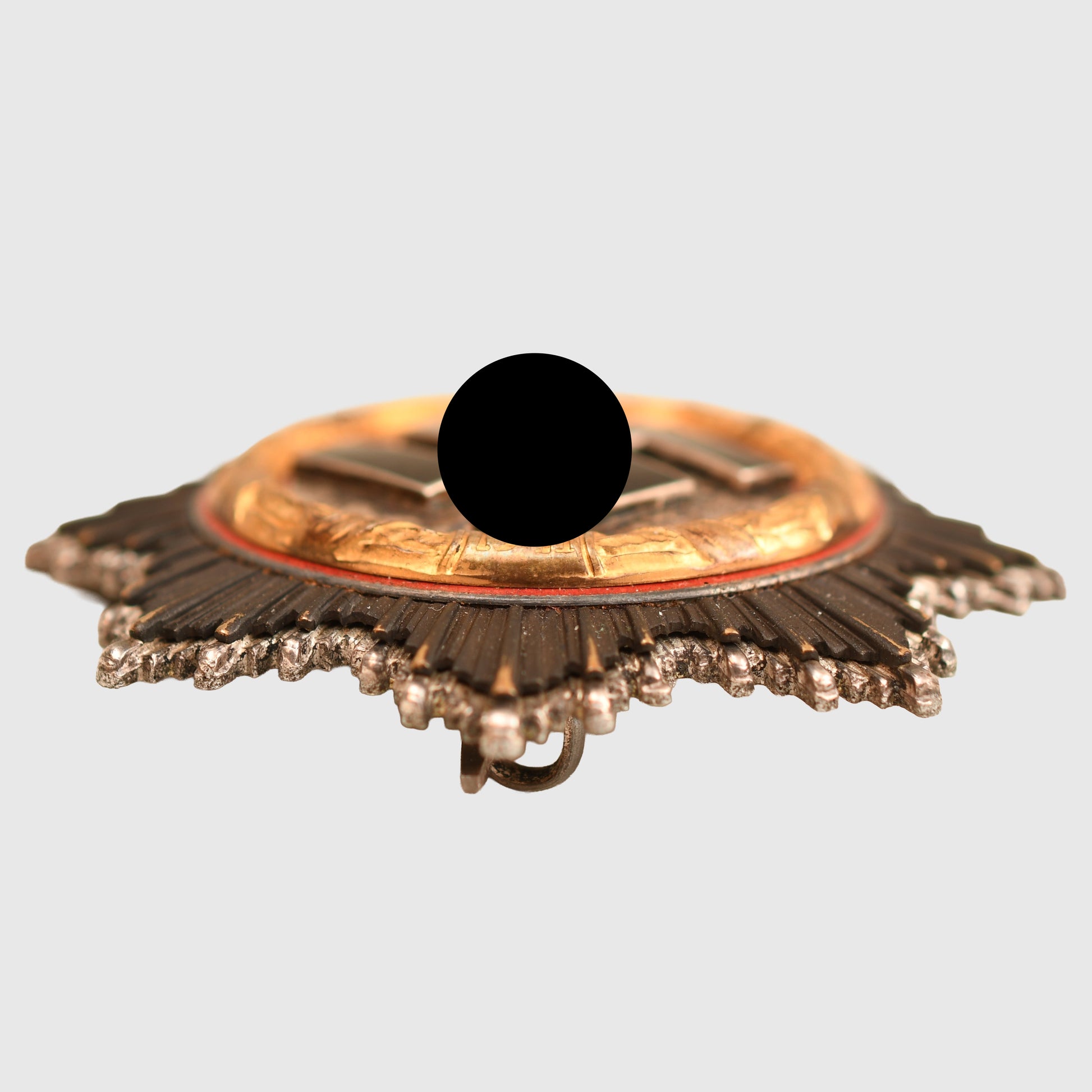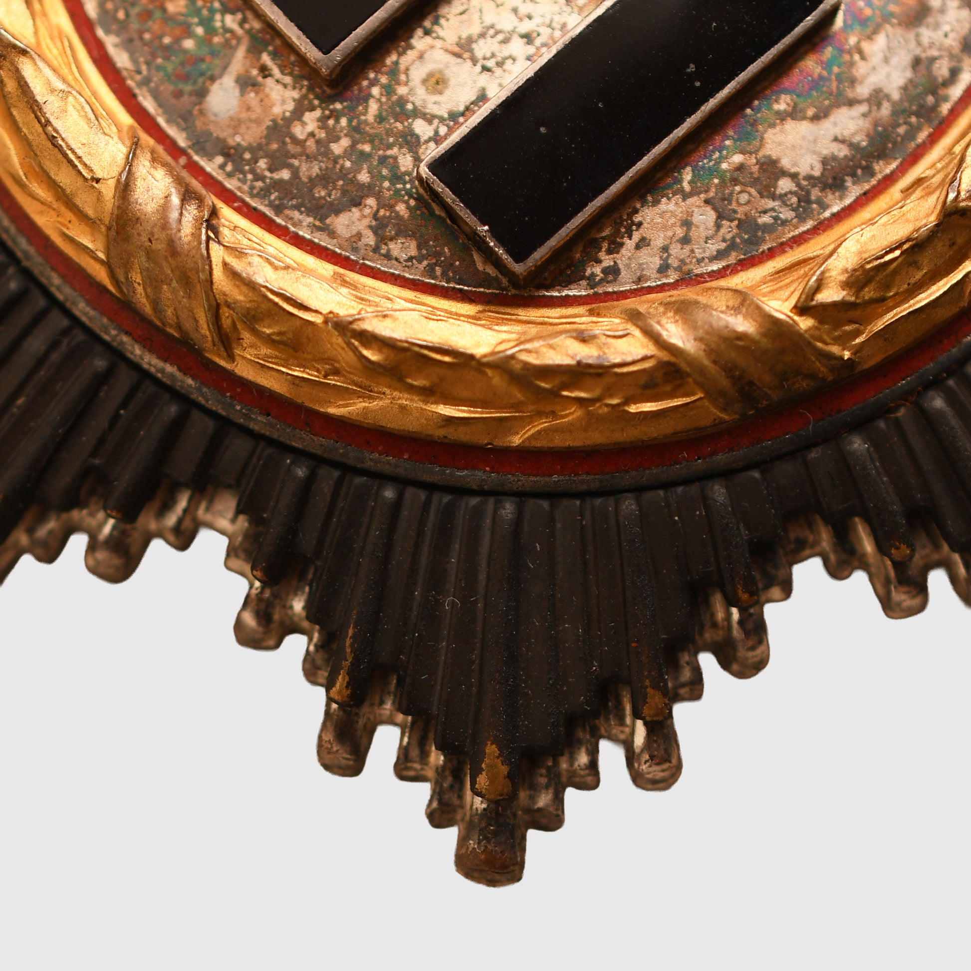 A fine example of a Zimmermann & Co. produced German Cross in gold, marked number ‘20’. The classic construction features four domed hollow rivets, a wide tapering pin, and original hook and hinge. The 1941-dated wreath retains good gilt, with excellent enamels throughout. All black finish remains on the rays, and virtually all silver finish to the star behind the rays is intact. The red enamel of the disc beneath the wreath is complete and undamaged. Fitted in its original gold-lined presentation box, showing minor scuffing to the edges and an impression of the wreath on the upper inner lid.