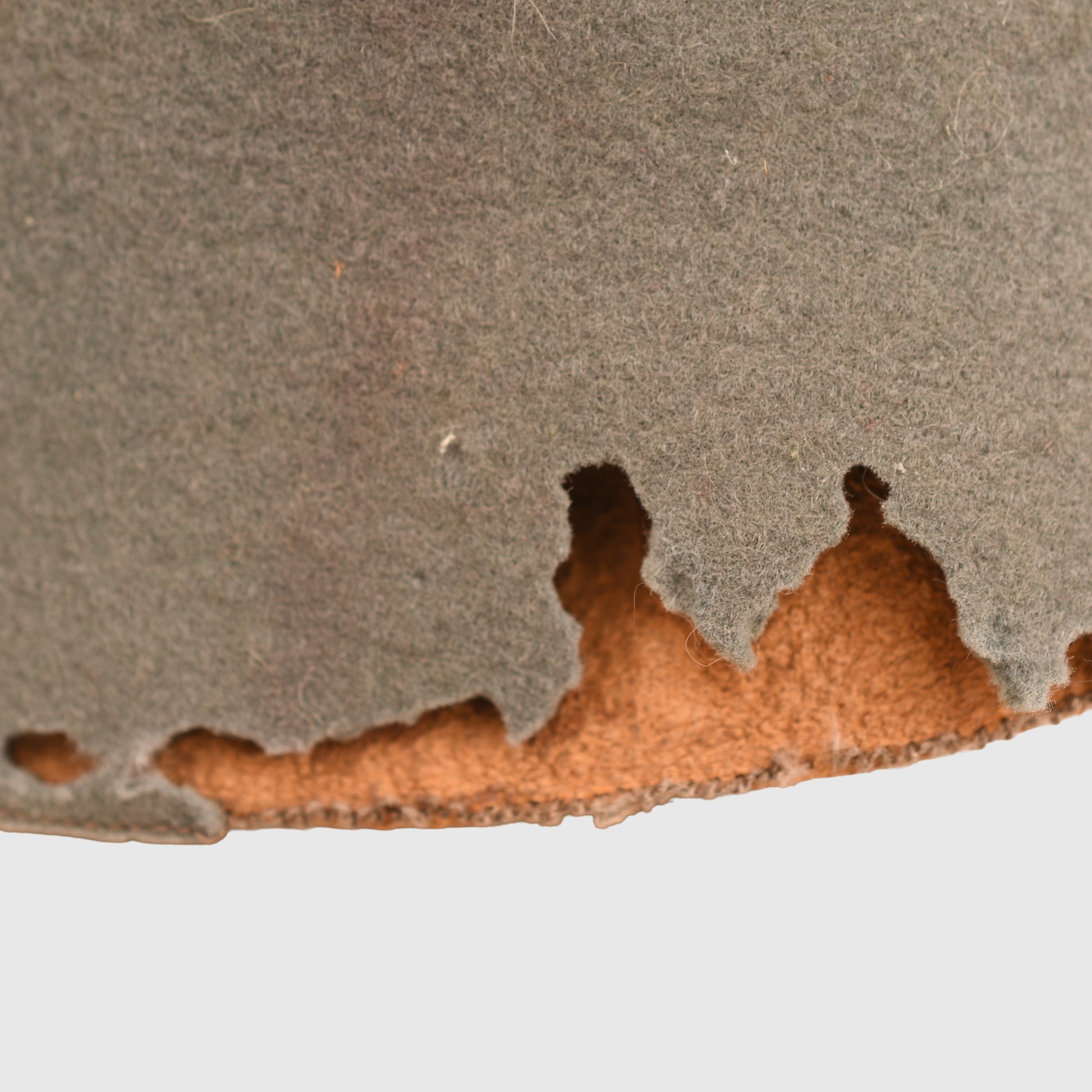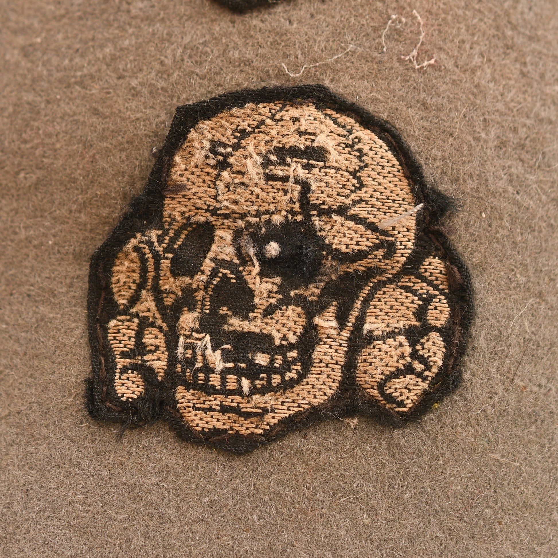 A scarce example of the field grey Waffen SS fez, the rarer of the two colours produced, worn by Muslim volunteers of the SS. Fitted with its original Bevo woven SS eagle and skull, both showing slight degradation. The fez retains its long tassel and untouched sweatband. Some minor moth nips are present to the front, with more notable moth damage to the rear side, but overall remains in nice condition.