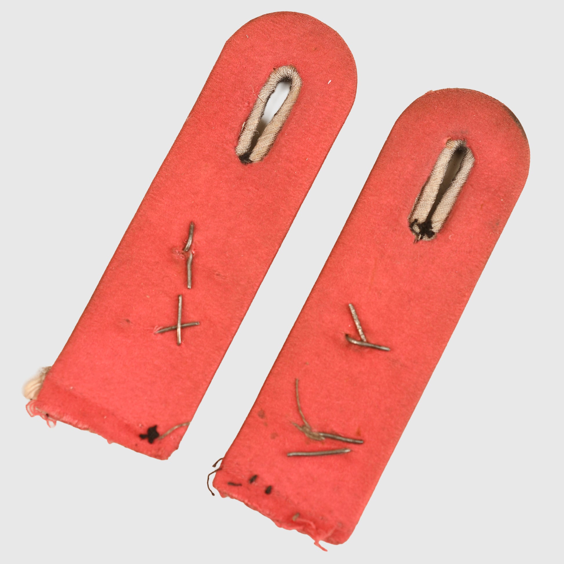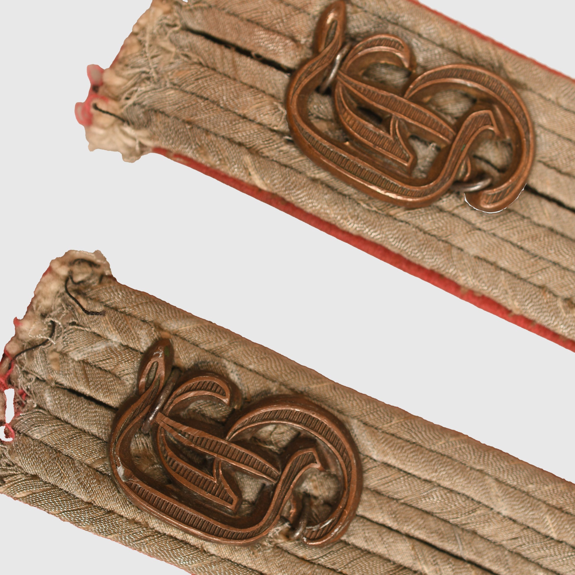The exterior silver wire shows a degree of oxidisation consistent with field wear and age. The intertwined GD cyphers are present on each board; these have been secured using soft wires passed through the body of the boards and over the cyphers, a period modification likely performed after the original attachment pins had sheared off. Examination of the material beneath the cyphers reveals clear impressions and consistent ageing, confirming that these insignias have been in place for a significant duration. The gilt finish on the cyphers has largely faded to the base metal.