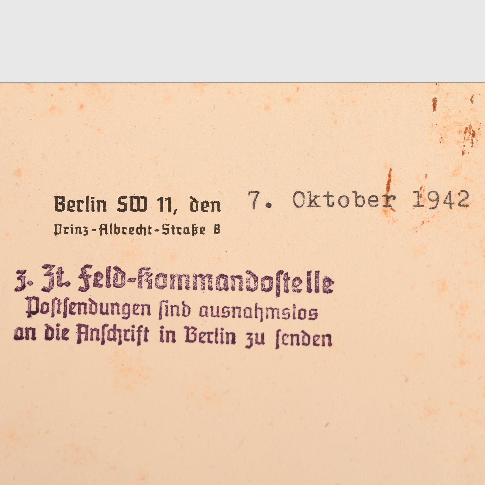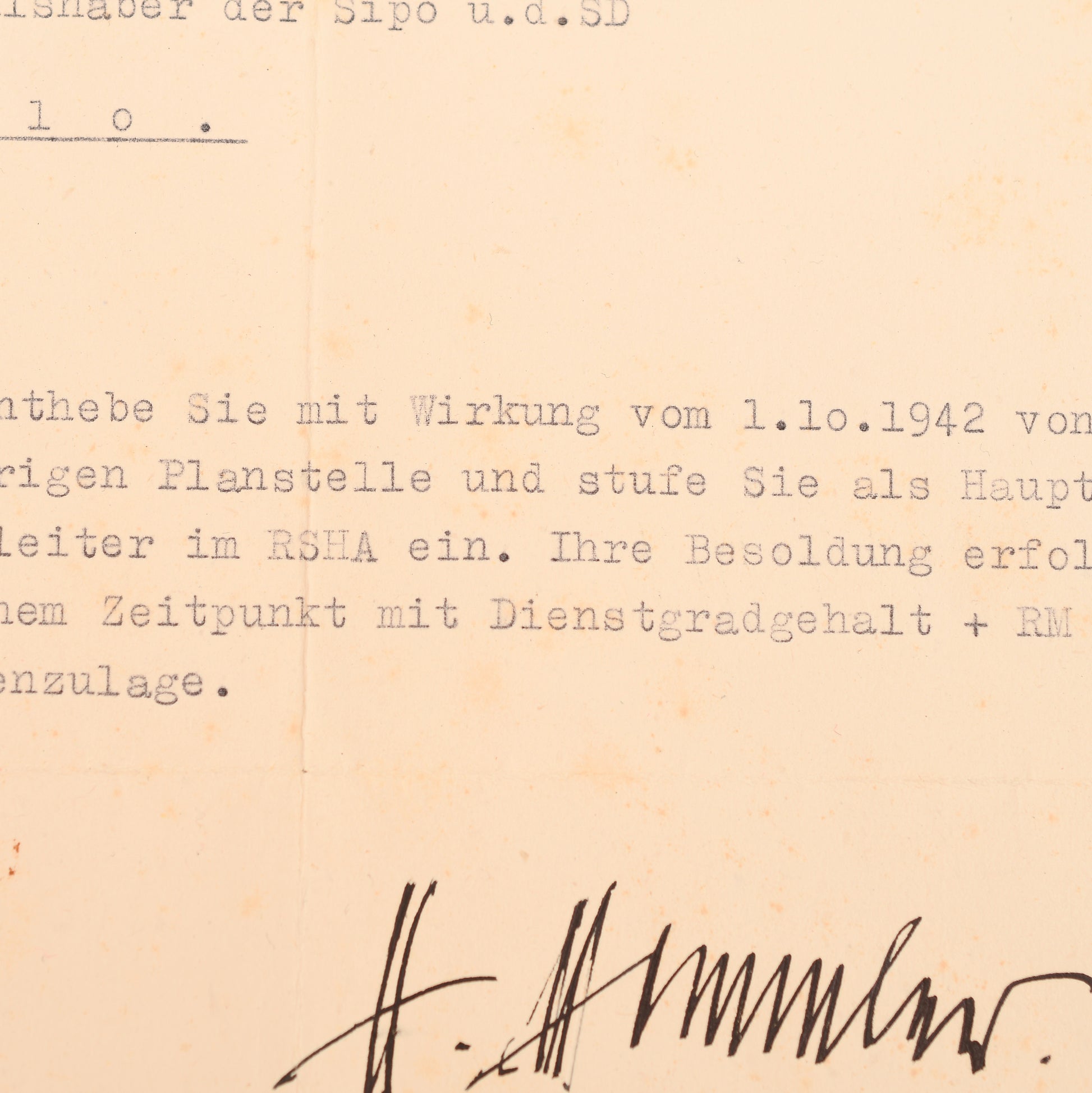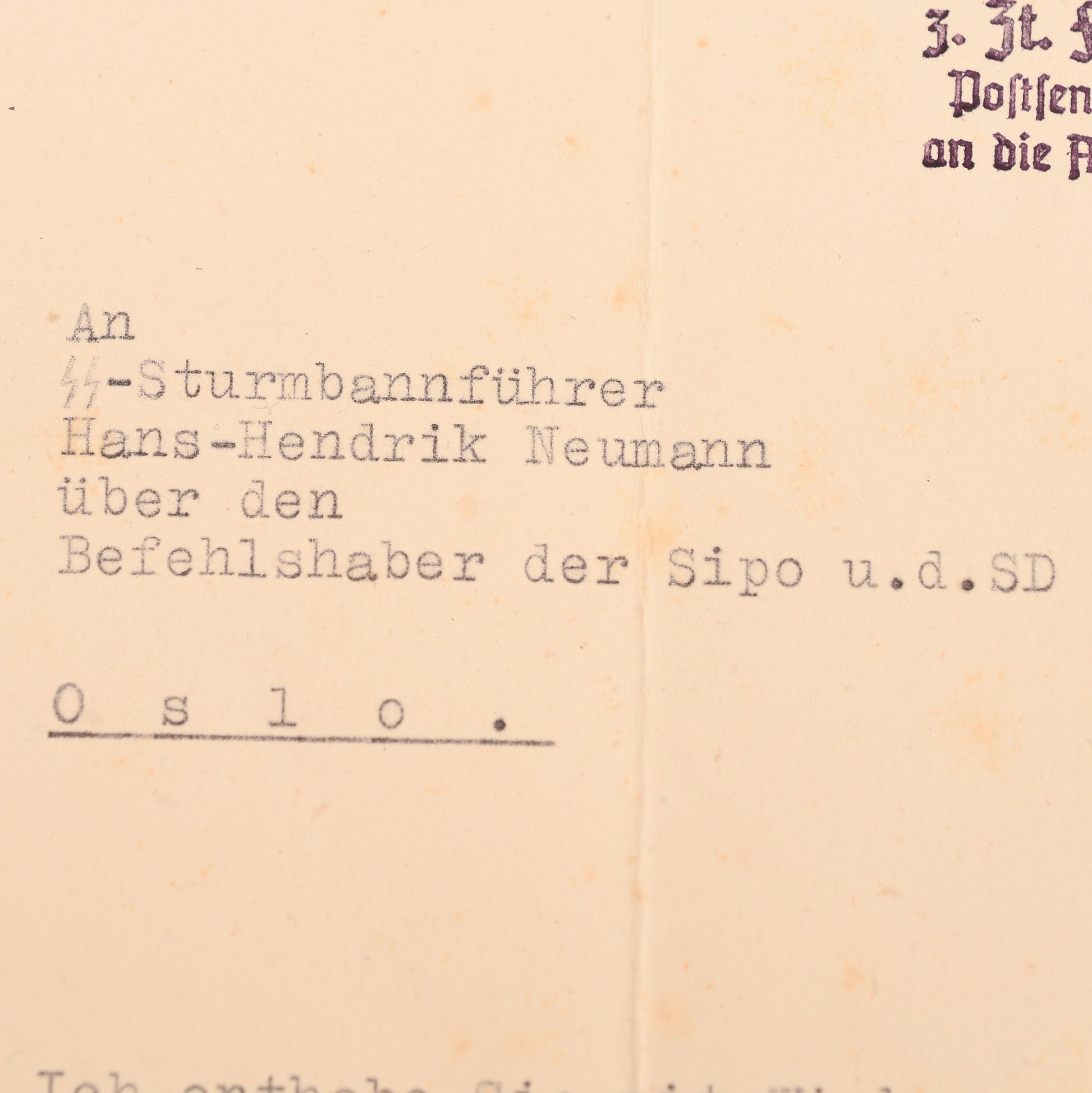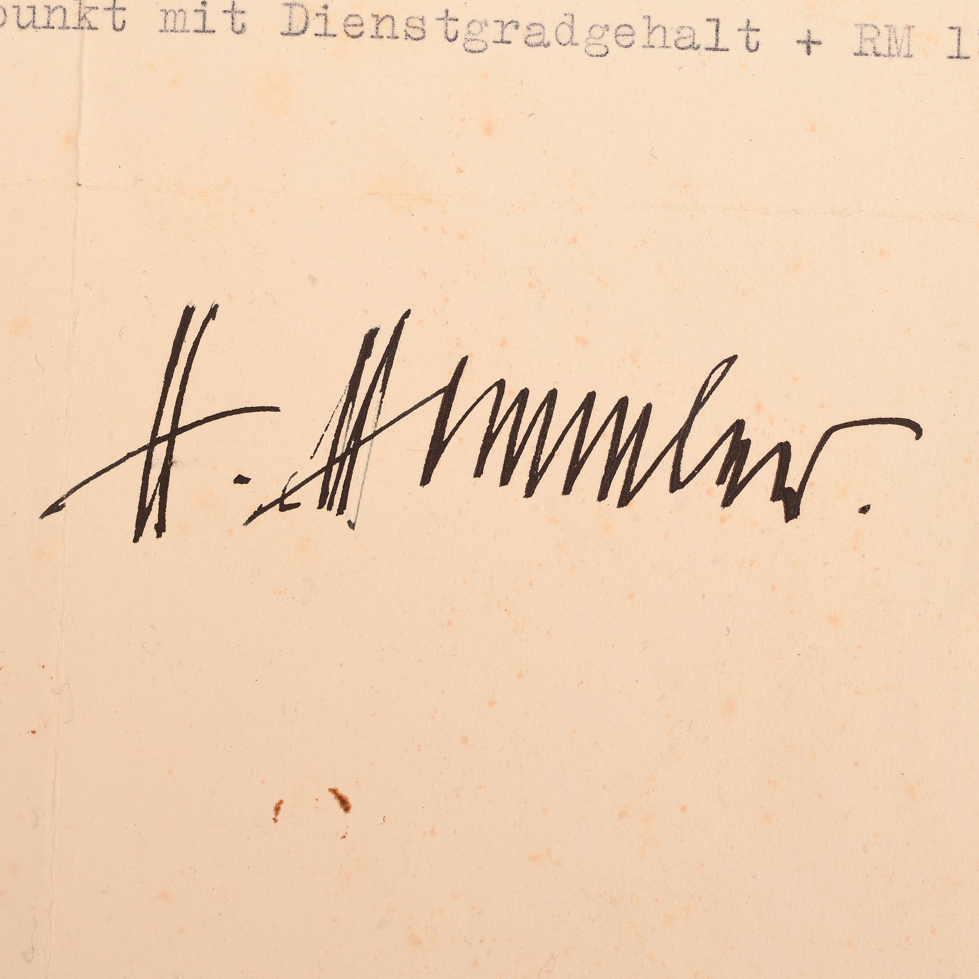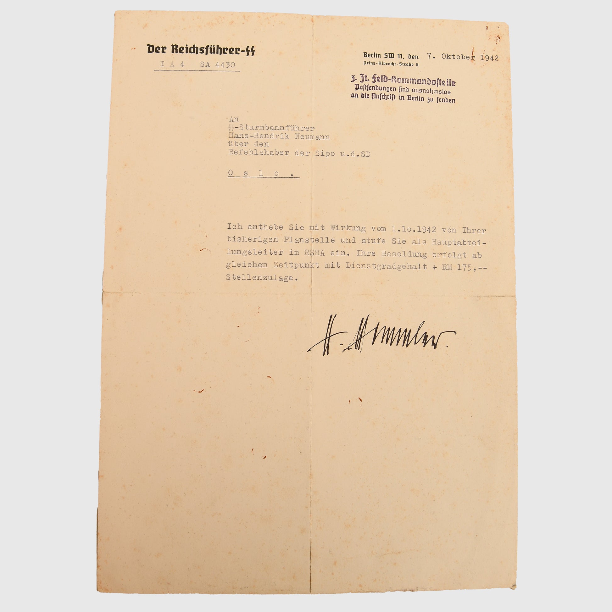 A rare A4 size document bearing the black printed heading ‘Der Reichsführer SS,’ dated 7th October 1942. This official communication is addressed to SS Sturmbannführer Hans-Hendrik Neumann, who served under the Commanding Chief of the Sipo. In the letter, Himmler informs Neumann, stationed in Oslo, Norway, of a significant increase in his wages. The piece is signed in full pen by Himmler, featuring his unmistakable and highly identifiable script.