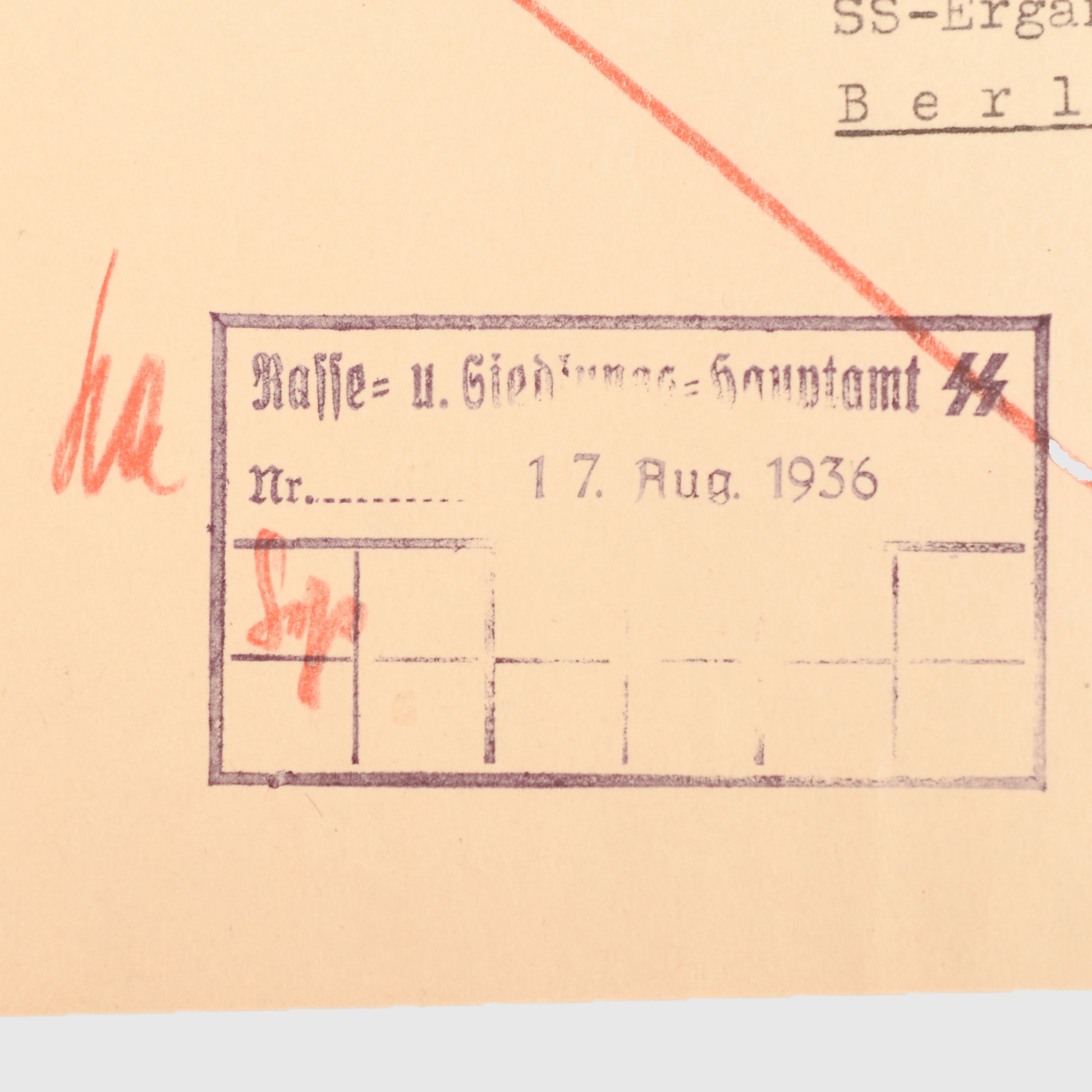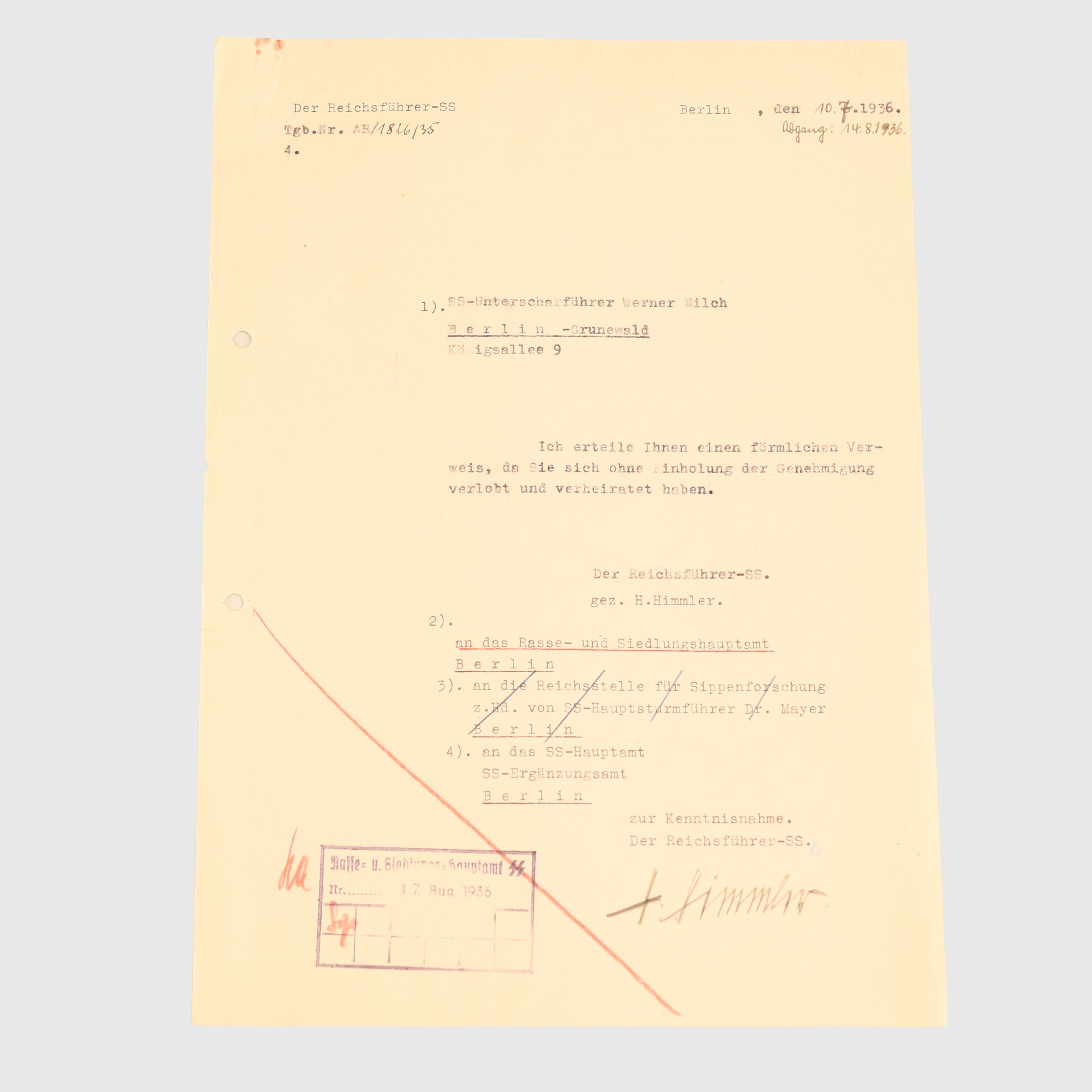 A4 sheet, punch-holed for filing with a rusty paperclip mark to the upper left-hand side, on the type-headed paper of Reichsführer SS, dated ‘10th April 1936 Berlin’. The letter was sent to SS Unterscharführer Verner Milch, also living in Berlin. Himmler is reprimanding Milch for getting engaged and married without permission. The letter is addressed to the ‘Race and Resettlement Office’ for the SS. Long, typical H.Himmler signature to the lower right hand side with the over-stamp on 17th August 1936 on receipt of the letter at the Race and Resettlement Office.
