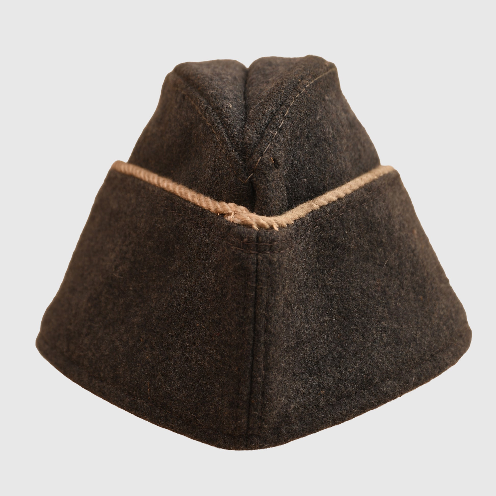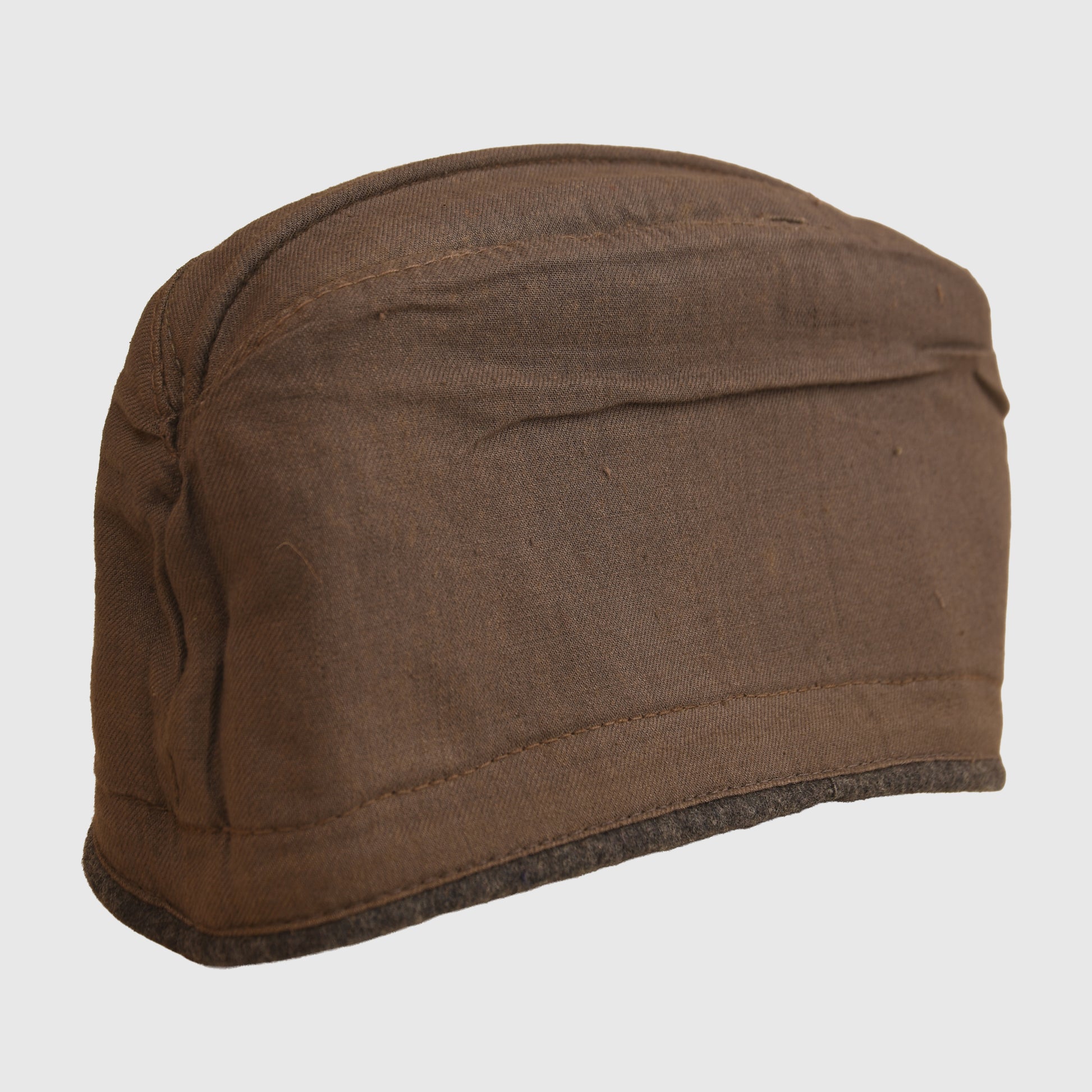 A nice condition cap, possibly size 56–57, made in standard enlisted ranks material. The nap is generally good, with only minor moth tracking visible. White twisted cord piping to the side curtains identifies it as a Hermann Goering Division piece. Fitted with the correct machine-embroidered Luftwaffe eagle and national cockade. The interior retains its original ribbed lightweight cotton lining in Luftwaffe blue-grey.