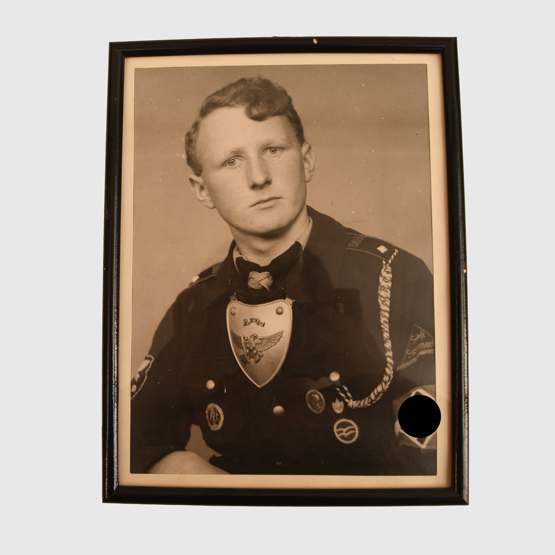 A striking and exceptionally rare photograph of a Hitler Youth member, measuring 18 x 23 cm, presented framed. The image depicts a boy from the South Stiermark unit serving as the standard-bearer, proudly wearing his standard-bearer’s gorget, arm patch, and all other period insignia. A vivid and historically significant representation of Hitler Youth regalia.
