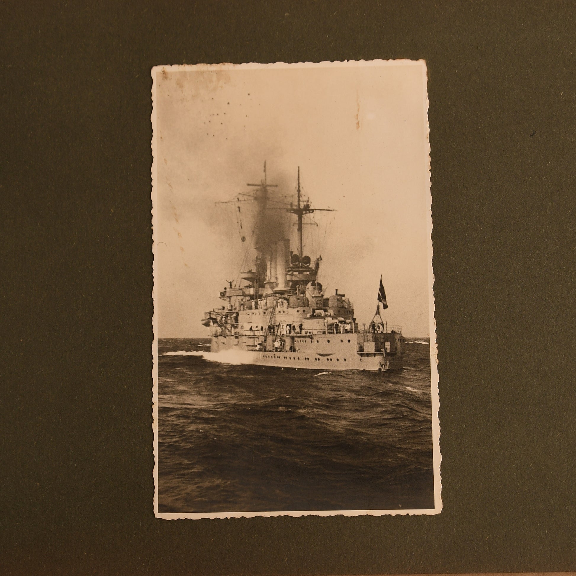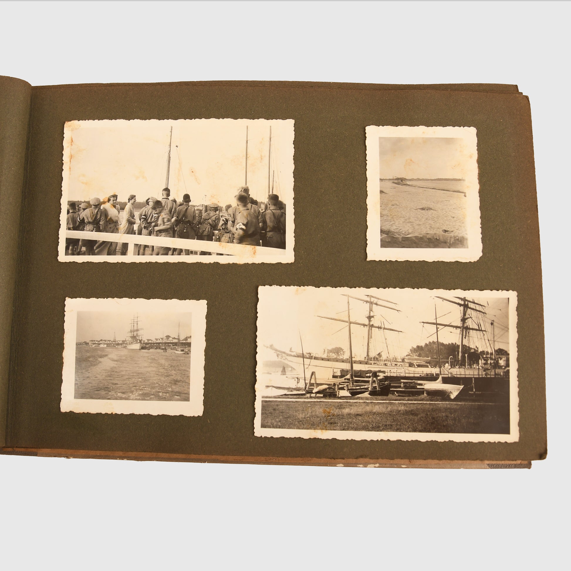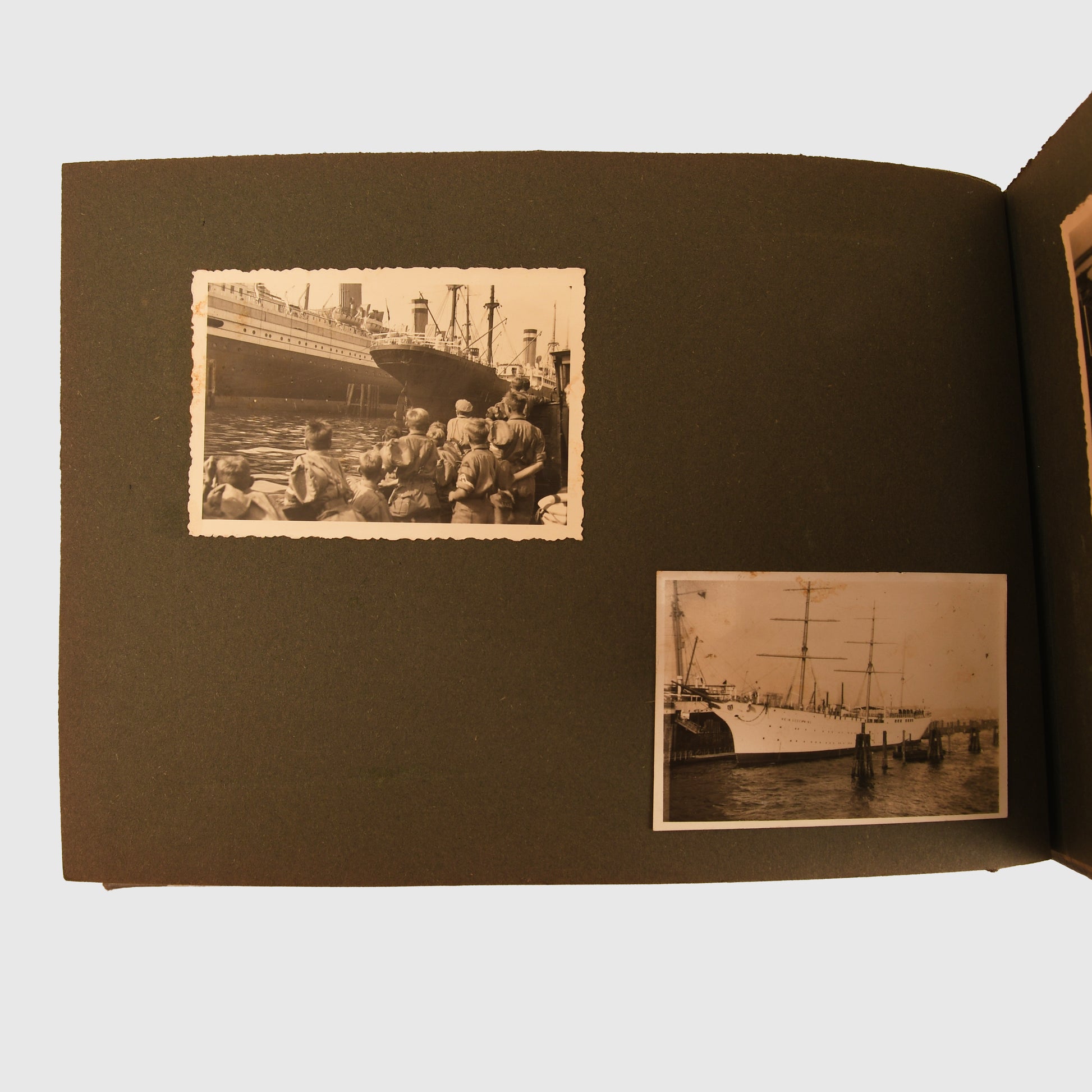 Also included is a small RAD exercise booklet, a fully completed Ahnenpass belonging to Alfred Jenson, a 1938 booklet on Hitler Youth uniforms and structure with black-and-white illustrations, and a 150-page annotated Hitler Youth service book. A black-and-white Landjahr book is present, alongside a photograph album with 122 images showing group parades, camp activities, tent erection, sail training, training aboard ships, close-up uniform details, and views of larger German naval vessels.
