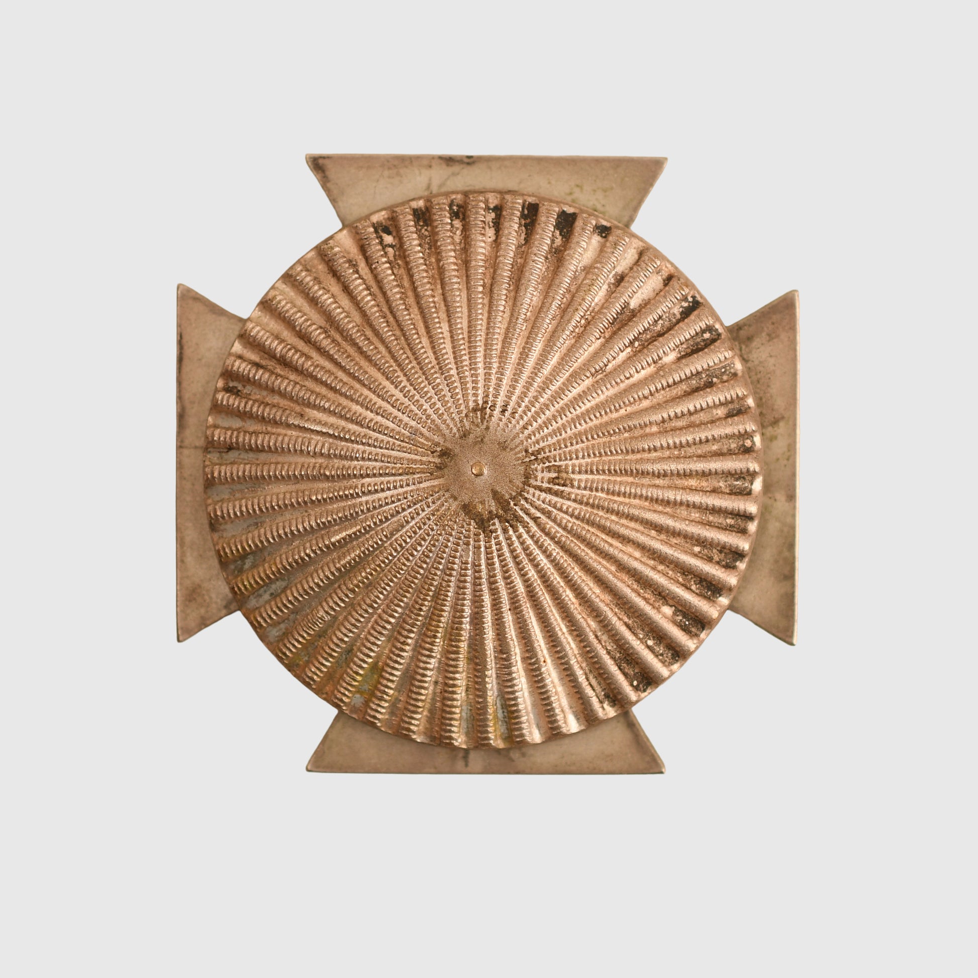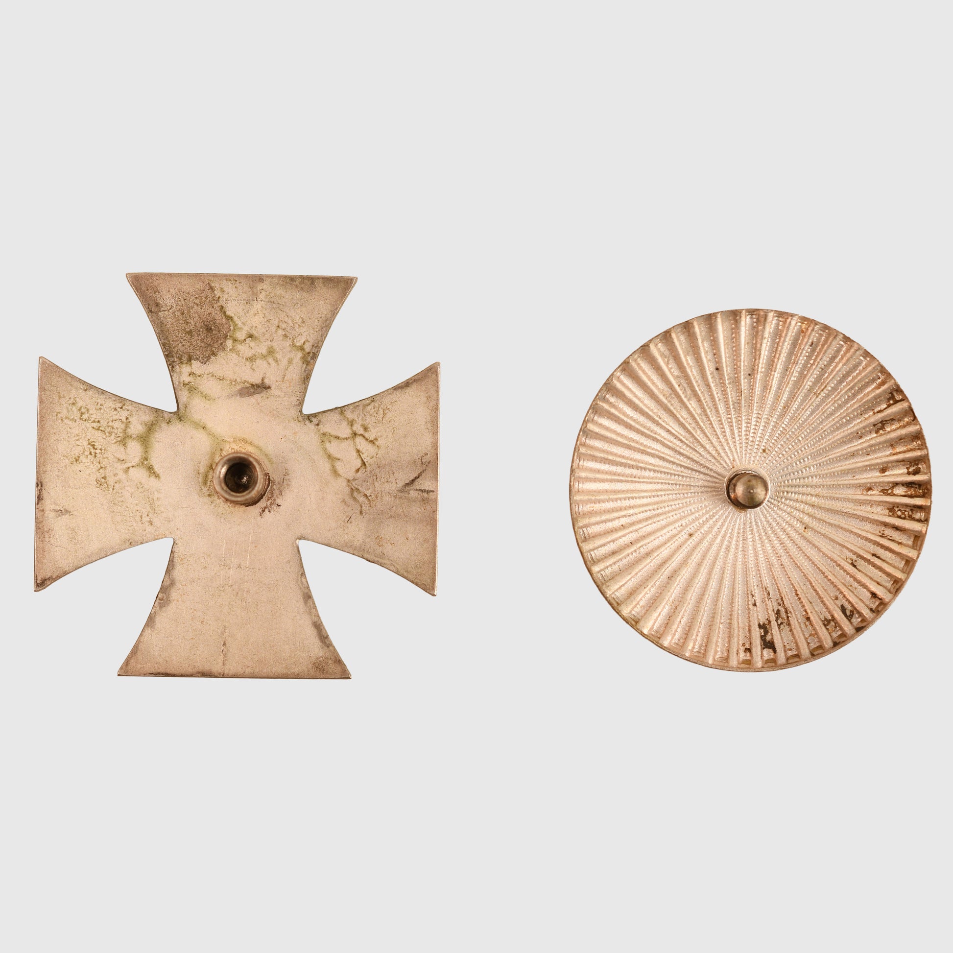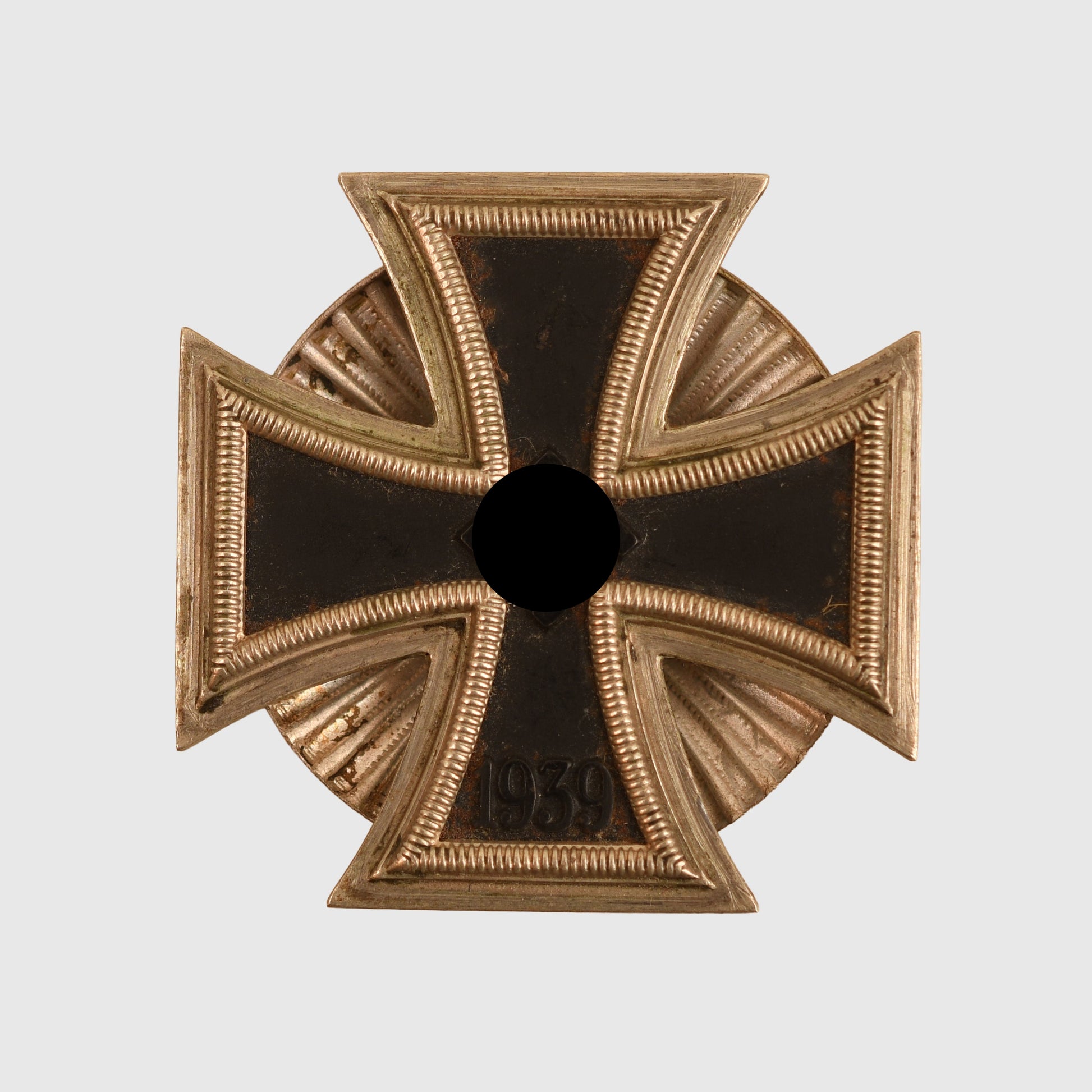 A good, clean example of the Iron Cross First Class. The central core shows a few light rust spots where it meets the outer frame. The reverse retains its original female screw-threaded post, accompanied by the double-sided ridged disc back with its central male screw thread. A solid and well-preserved example of this desirable award.