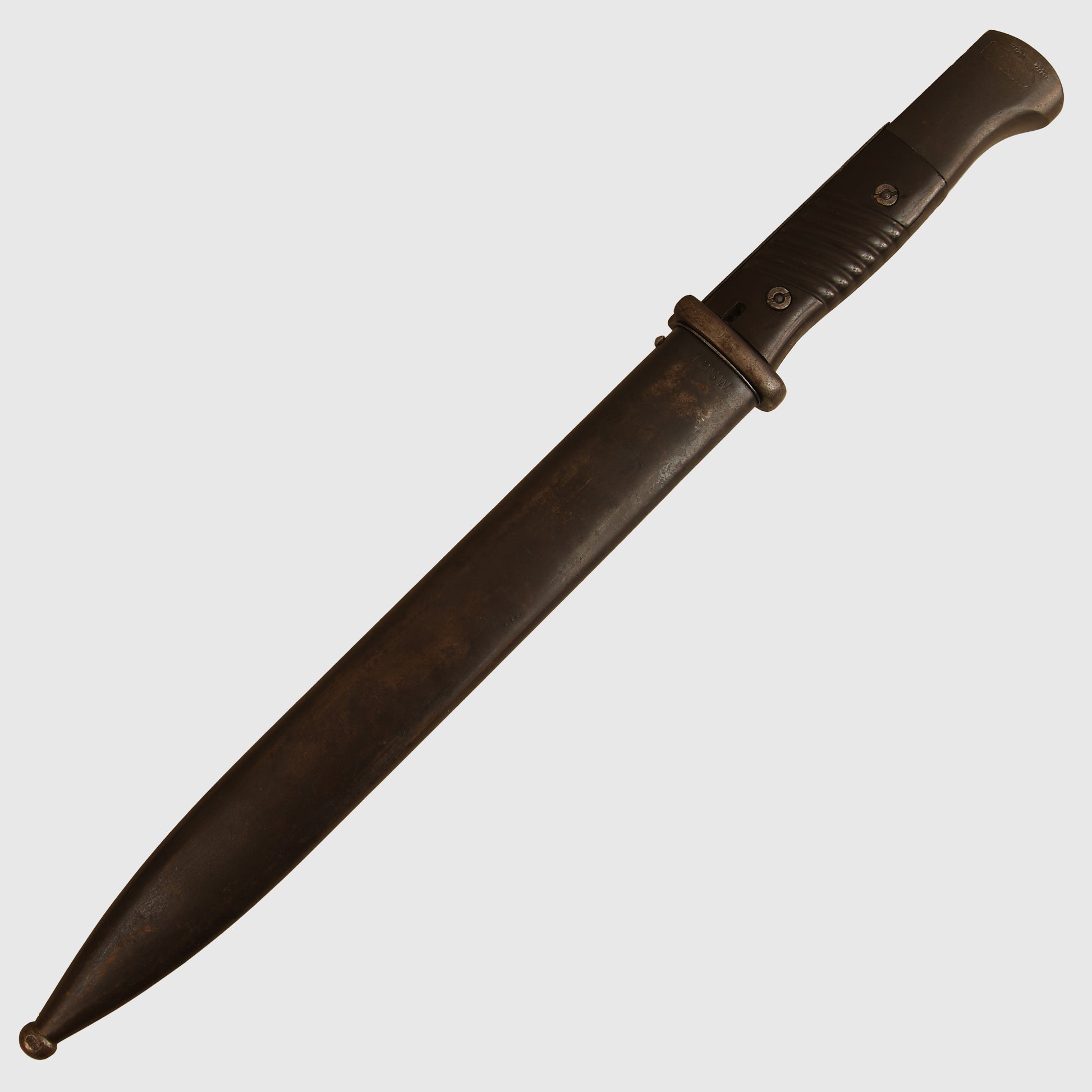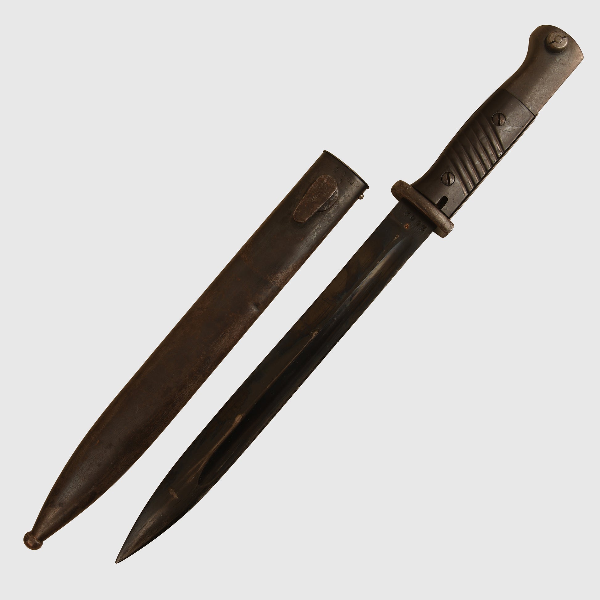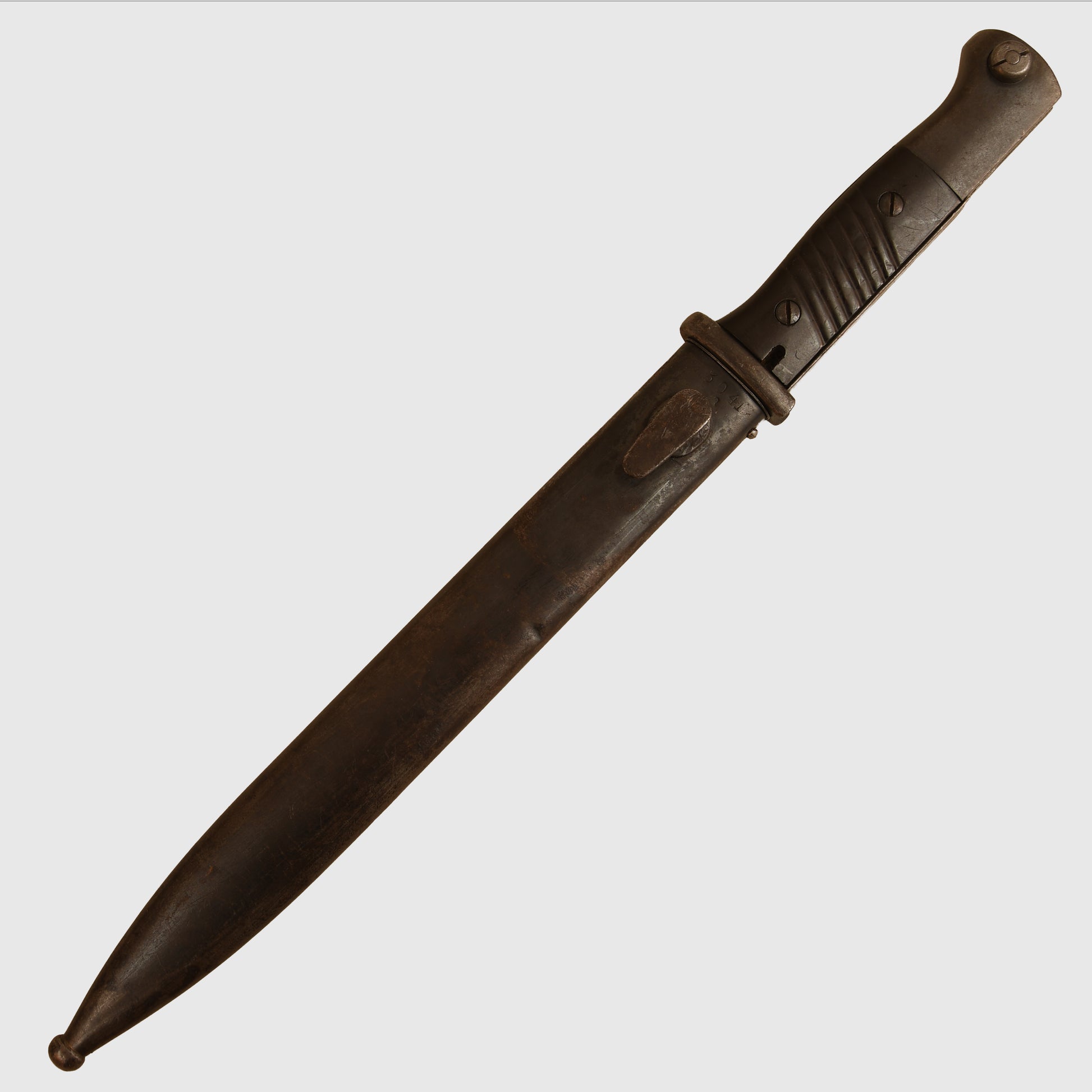 A well-preserved K98 example with matching number 3041 to both the item and its scabbard. The surface retains all original bluing, marked ‘ab’ on the item and ‘41 ASW’ on the scabbard. The Bakelite grips are undamaged. Twin Waffenamt stamps are present on the upper pommel, with light indentations to the backstrap consistent with historical use. The lower ball of the scabbard and the sprung-loaded rifle retaining mechanism are also Waffenamt stamped.