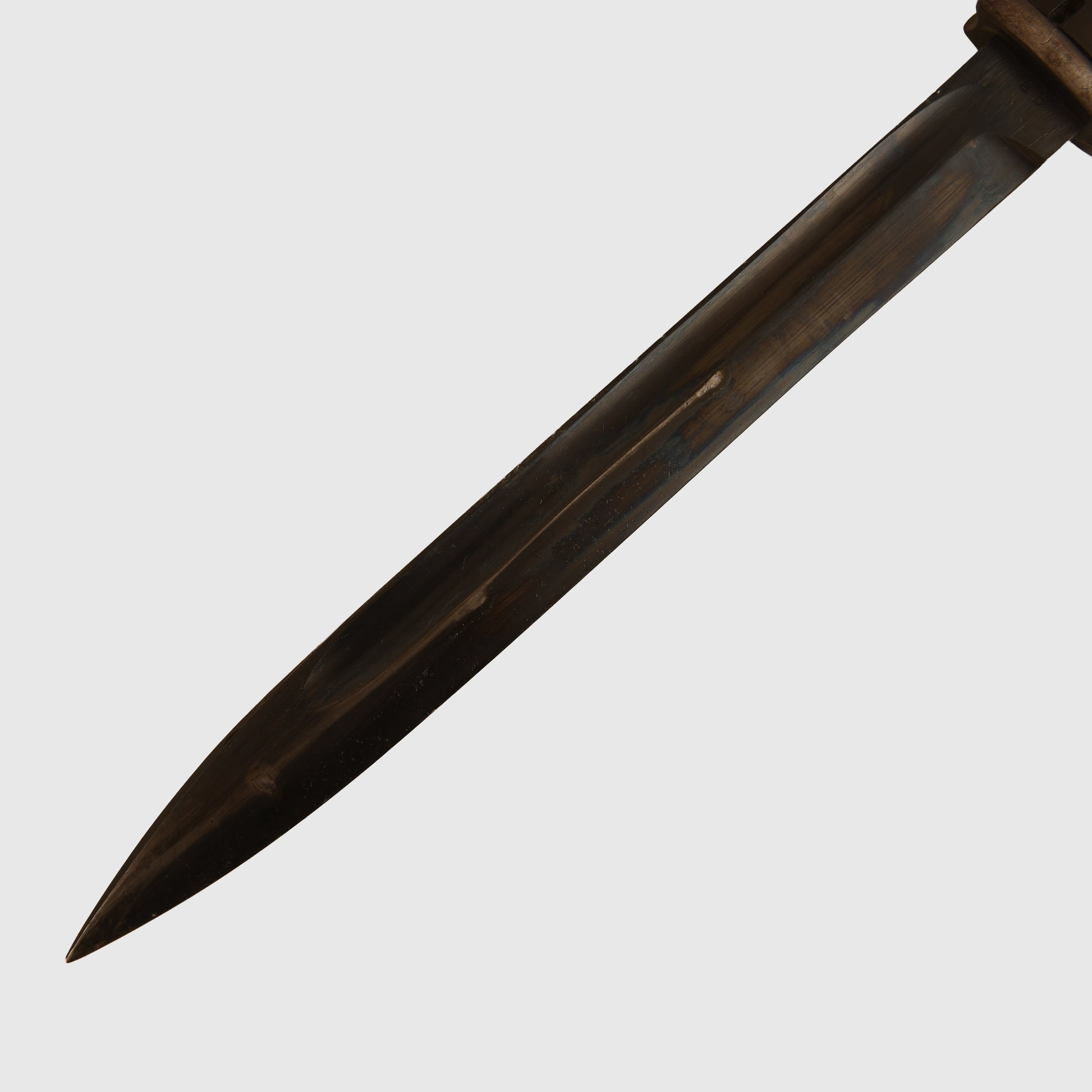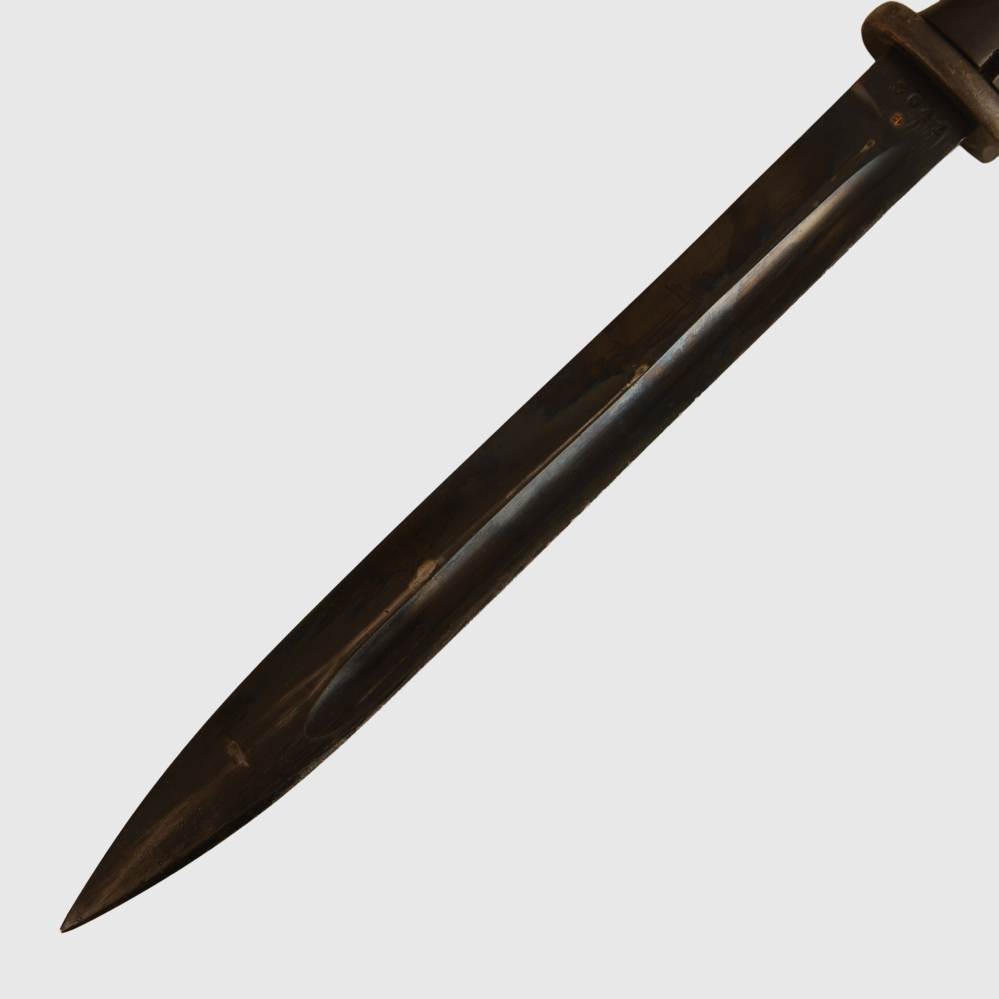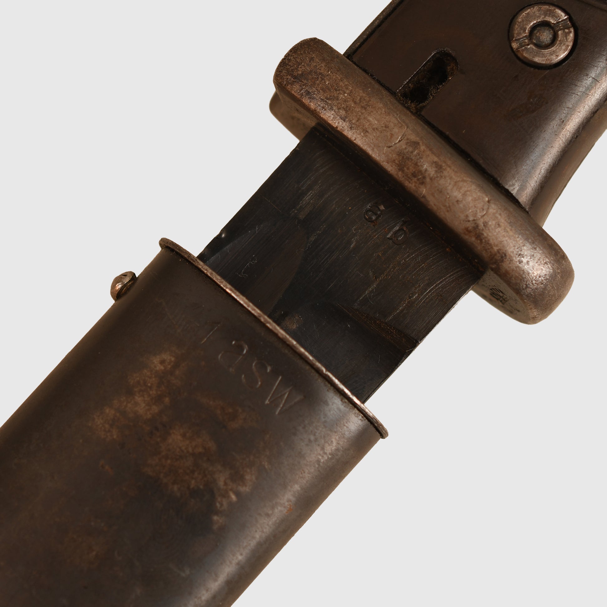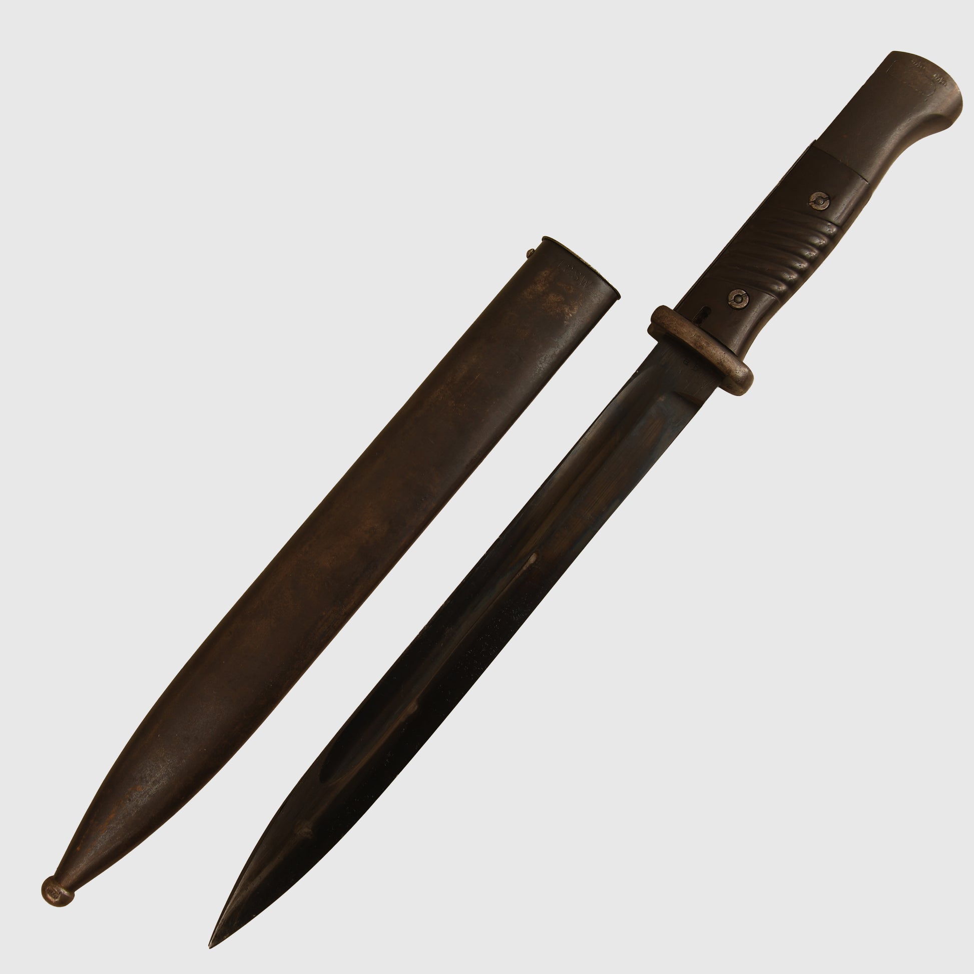 A well-preserved K98 example with matching number 3041 to both the item and its scabbard. The surface retains all original bluing, marked ‘ab’ on the item and ‘41 ASW’ on the scabbard. The Bakelite grips are undamaged. Twin Waffenamt stamps are present on the upper pommel, with light indentations to the backstrap consistent with historical use. The lower ball of the scabbard and the sprung-loaded rifle retaining mechanism are also Waffenamt stamped.