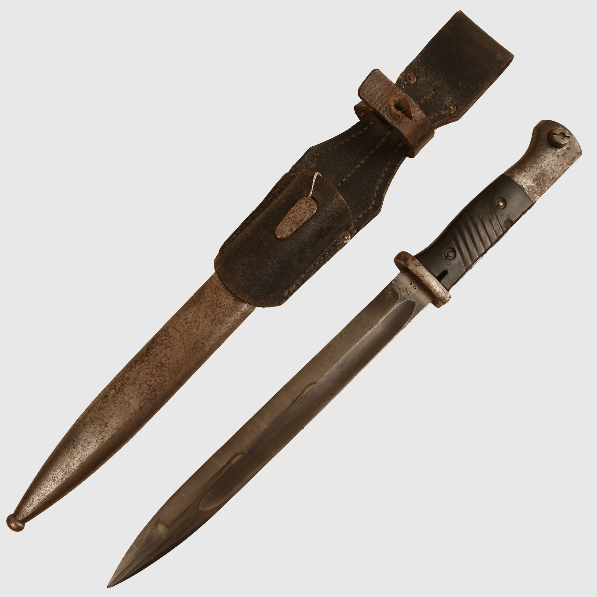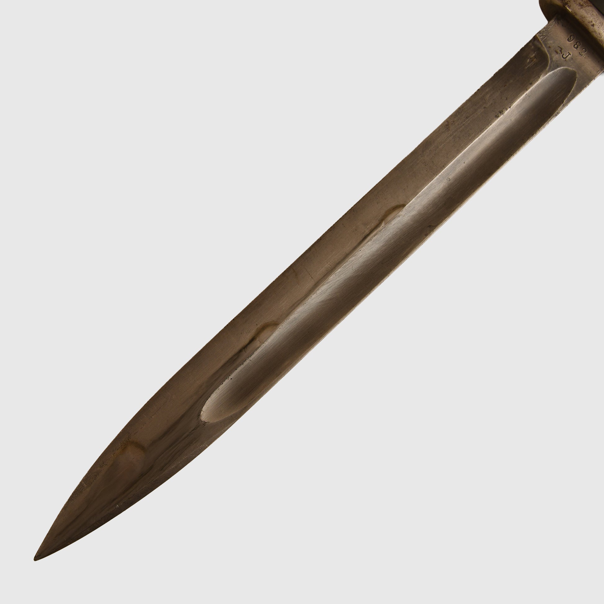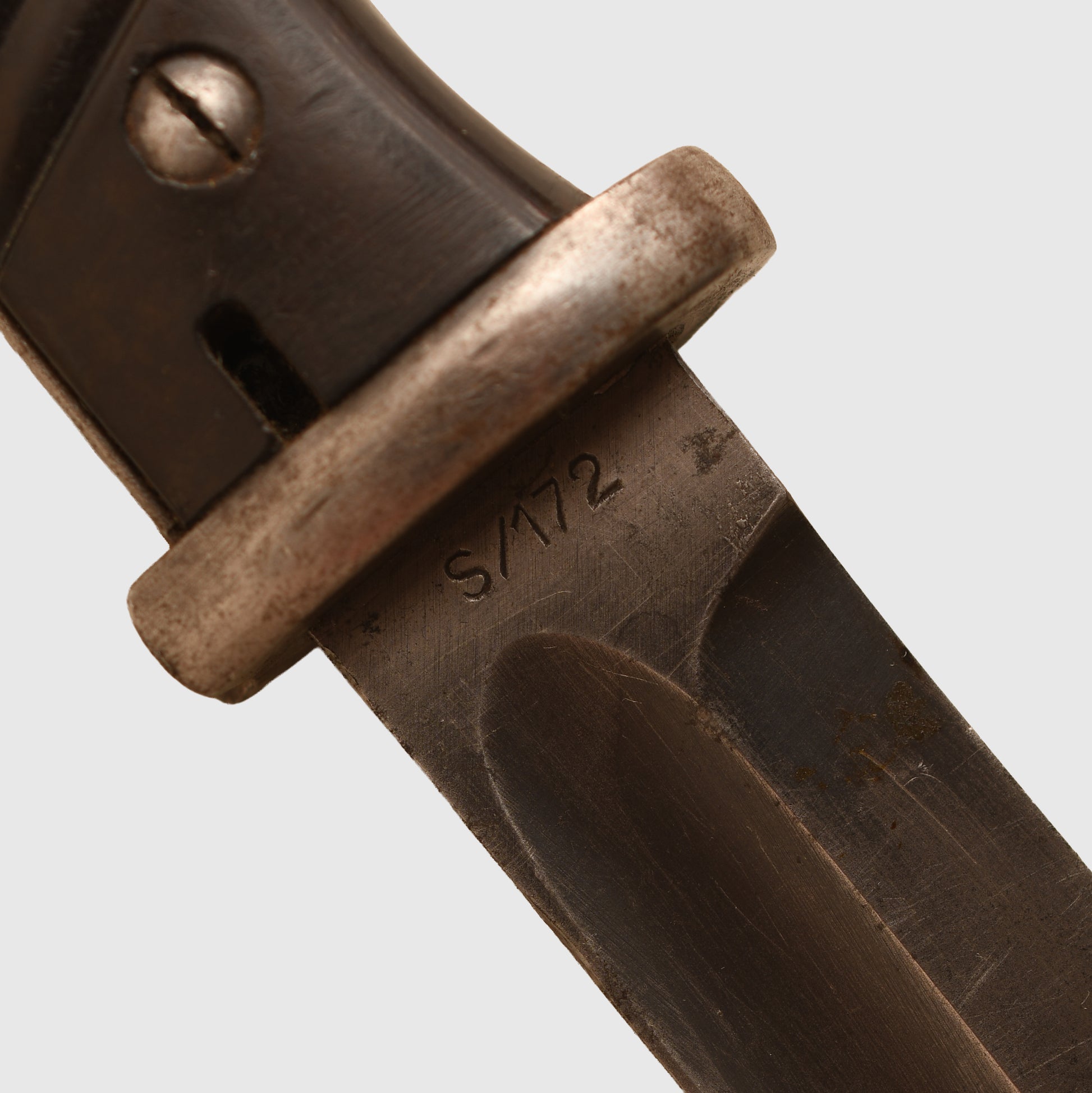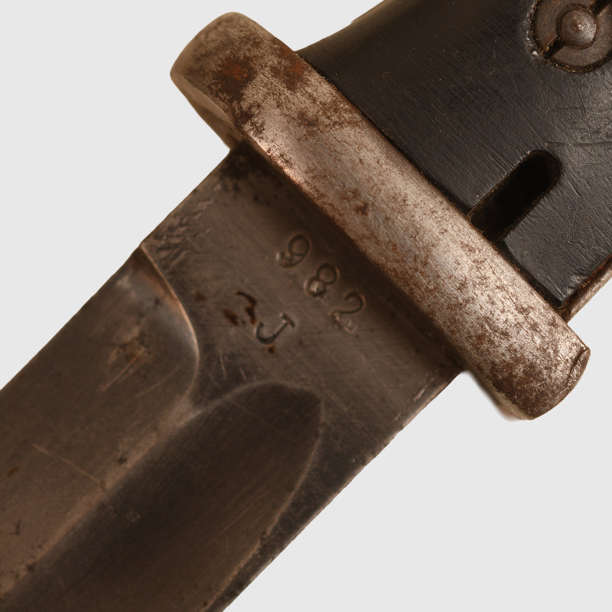 A very clean and matched number example, marked ‘S/172’ with number ‘982J’ on the reverse side, corresponding with the scabbard. Bakelite grips show minor thinness in the grooves. Double Waffen Amt stamped to the upper pommel. Rifle retaining button functions correctly, with some indentations to the backstrap. The scabbard is undamaged and free of dents, though the blued finish has worn. Complete with its RB numbered leather frog, including the hilt retaining strap.
