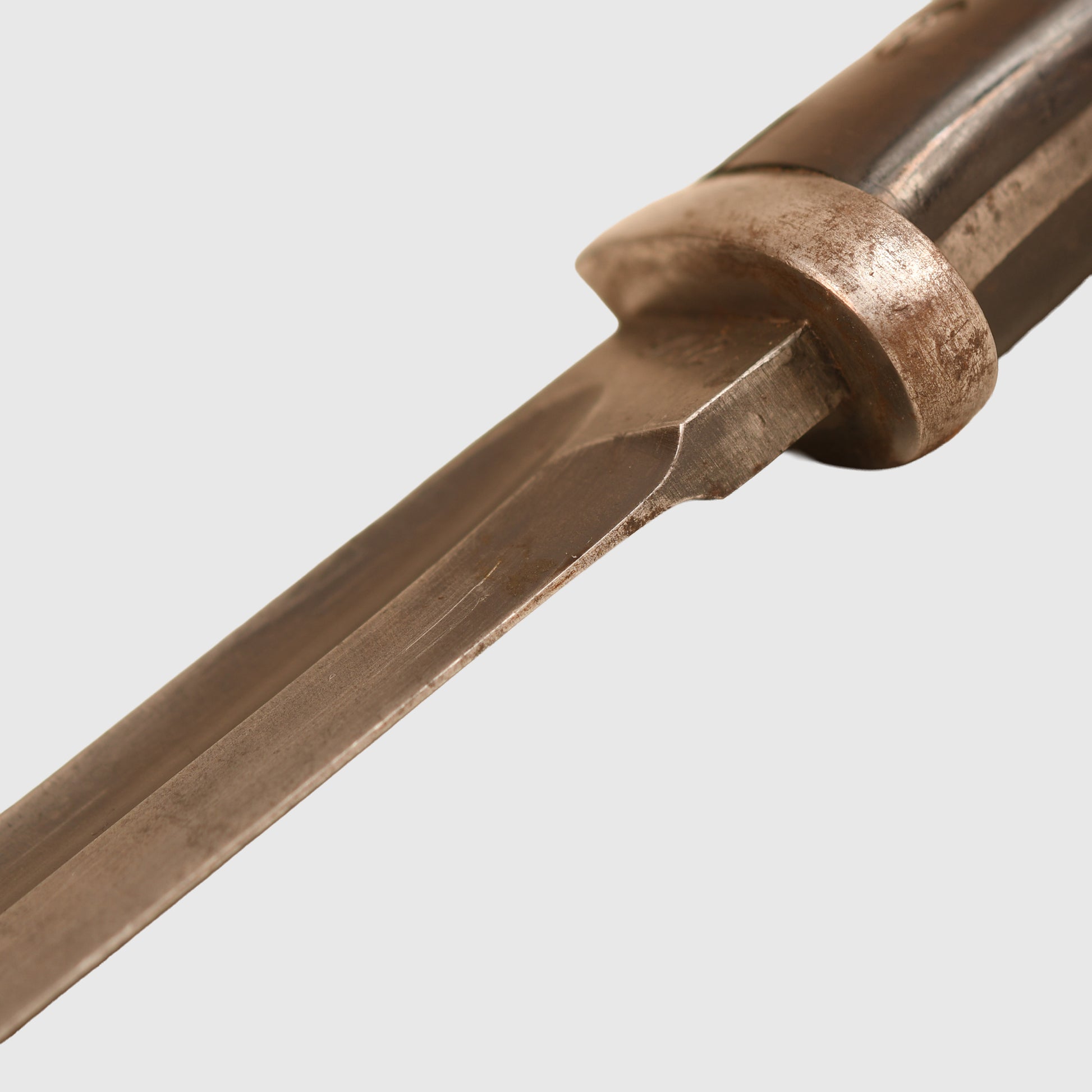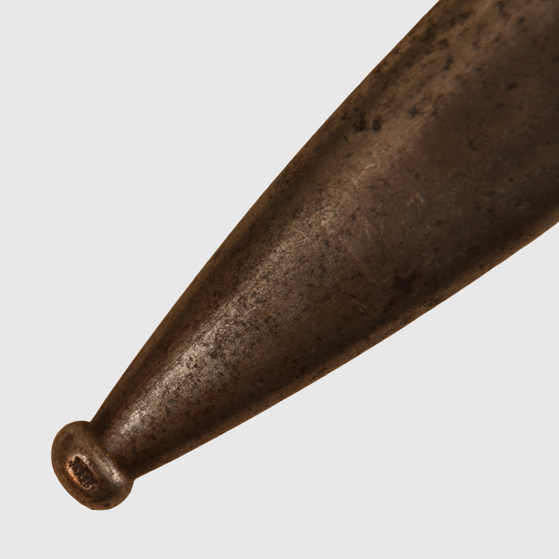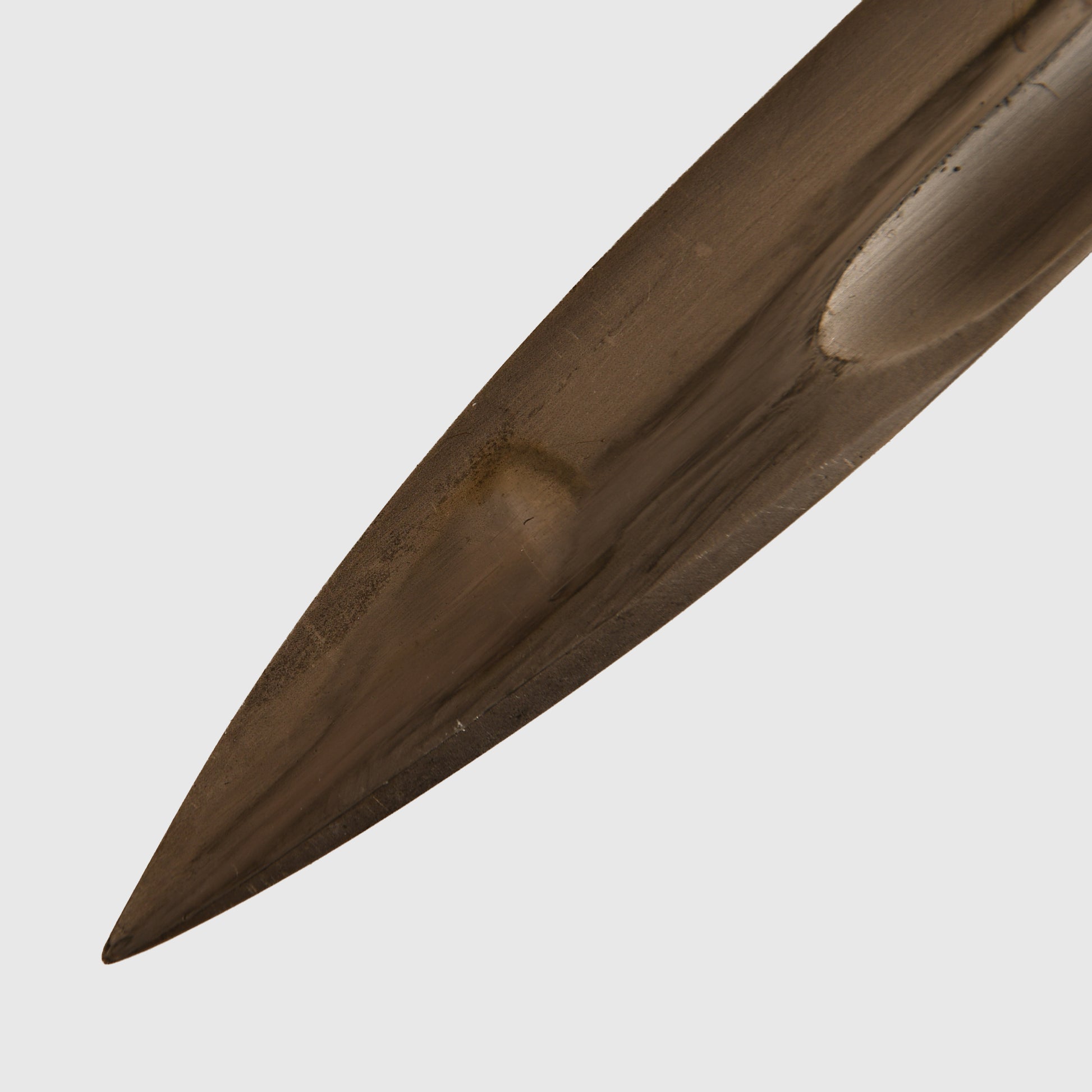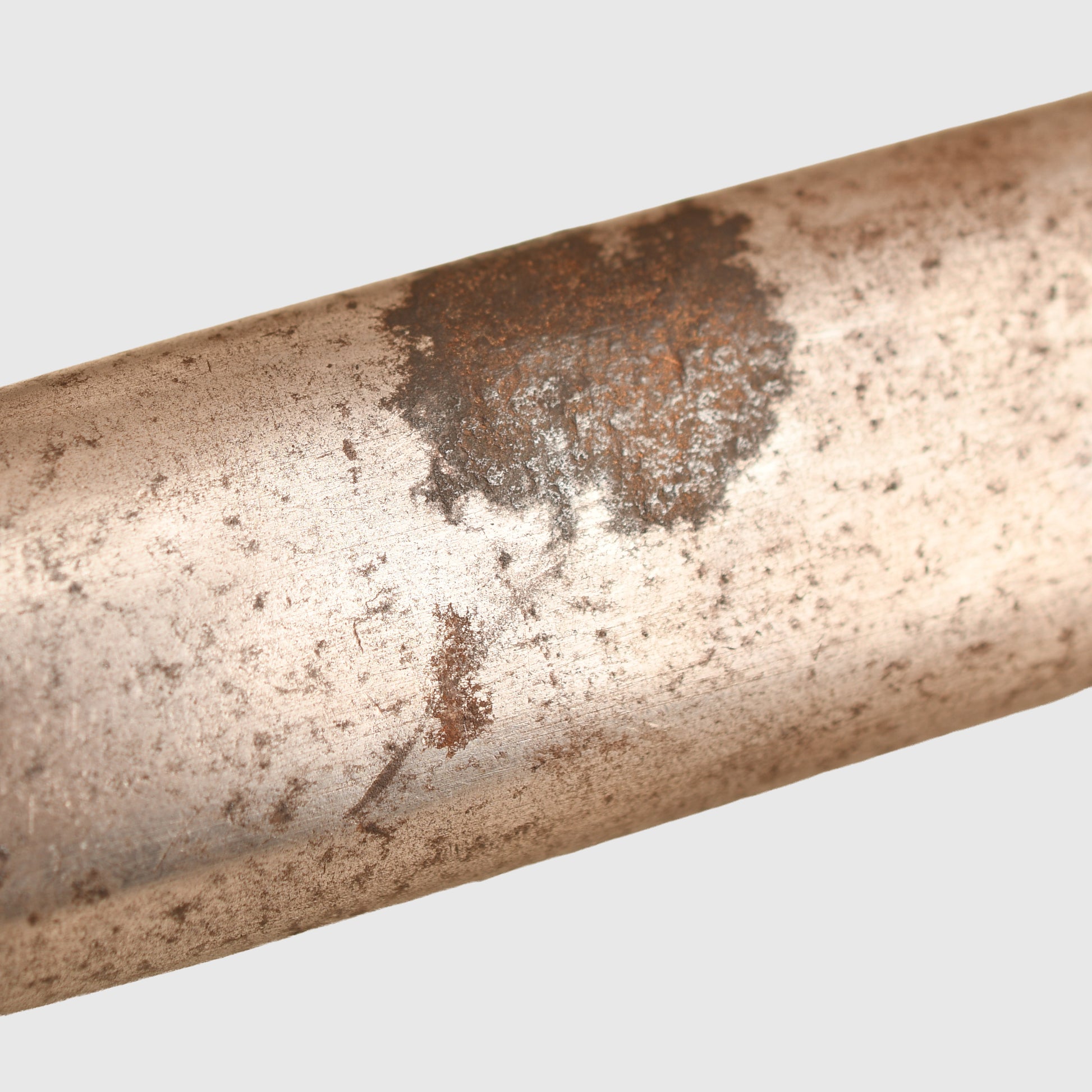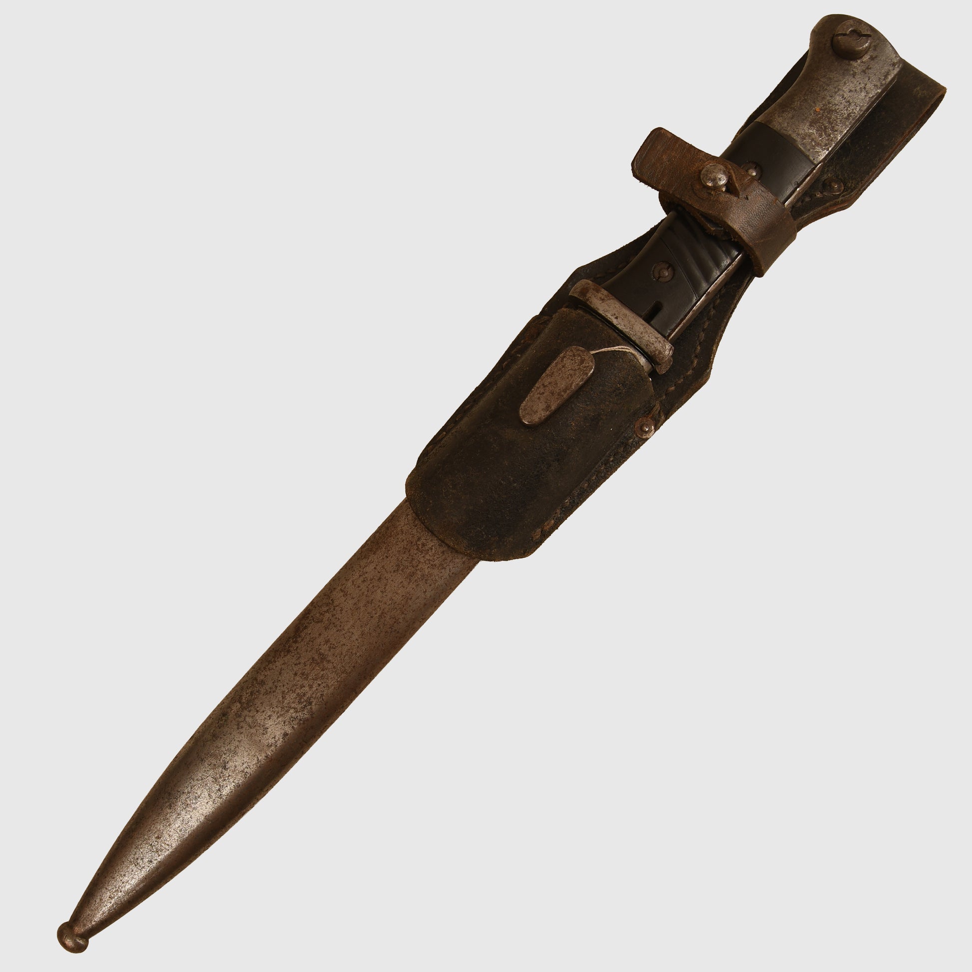 A very clean and matched number example, marked ‘S/172’ with number ‘982J’ on the reverse side, corresponding with the scabbard. Bakelite grips show minor thinness in the grooves. Double Waffen Amt stamped to the upper pommel. Rifle retaining button functions correctly, with some indentations to the backstrap. The scabbard is undamaged and free of dents, though the blued finish has worn. Complete with its RB numbered leather frog, including the hilt retaining strap.