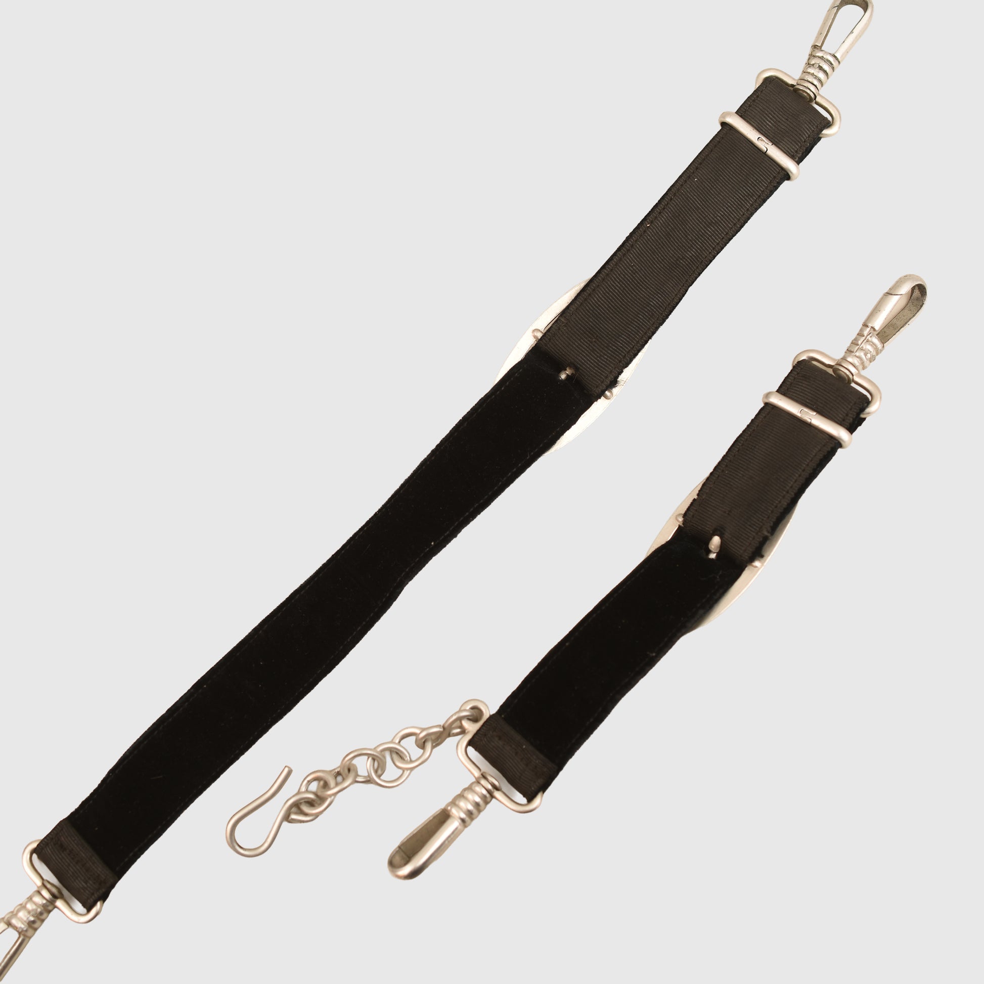 A very nice stamped aluminium matched pair of Naval Administration Service dagger straps. All of the fittings in white aluminium. The brocade is perfect with its small chain. All of the sprung loaded clips present and working correctly.