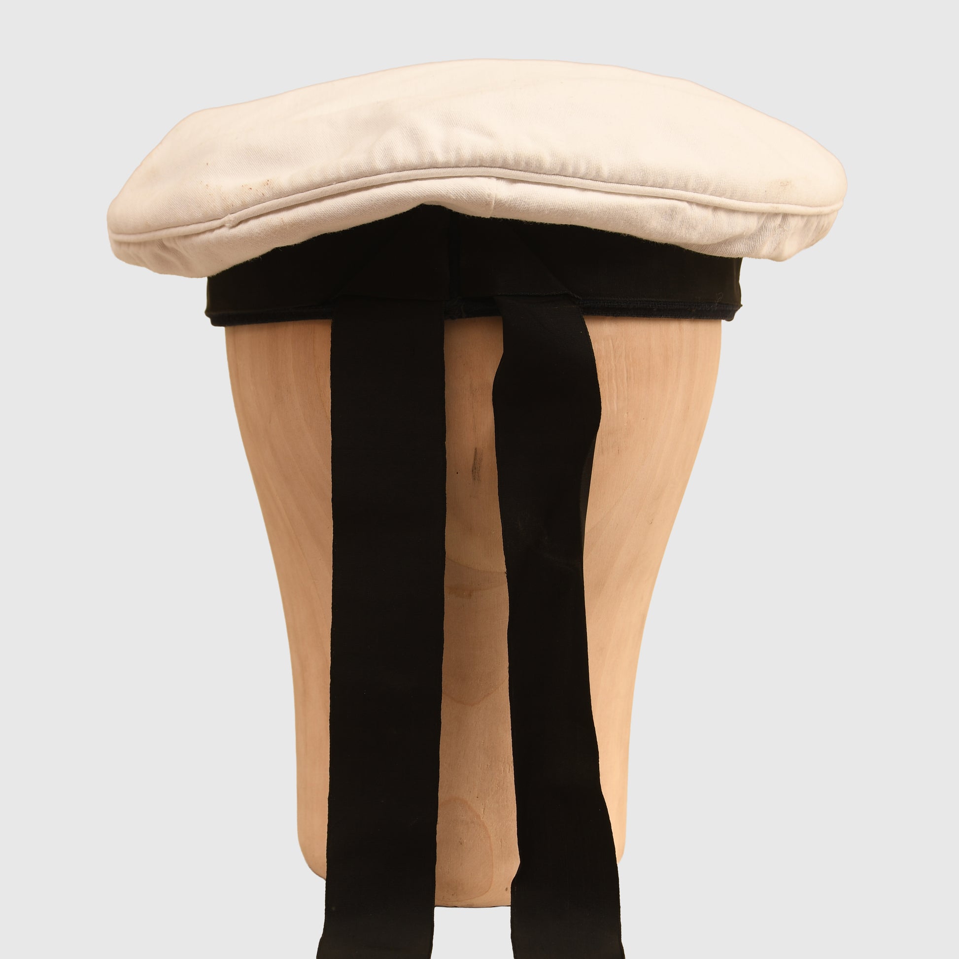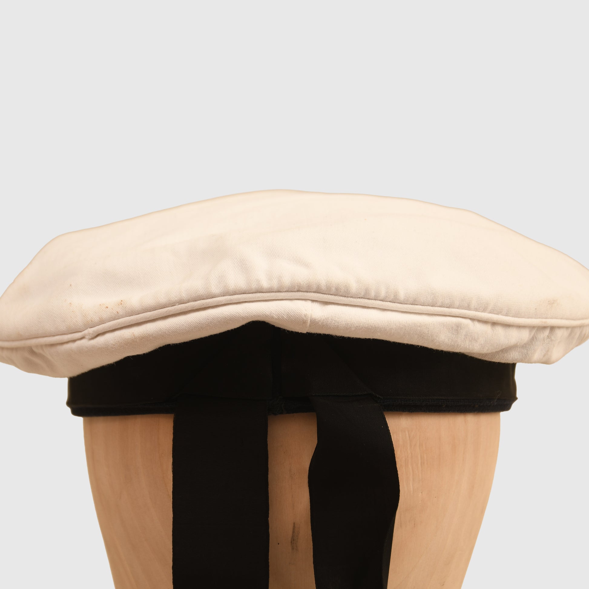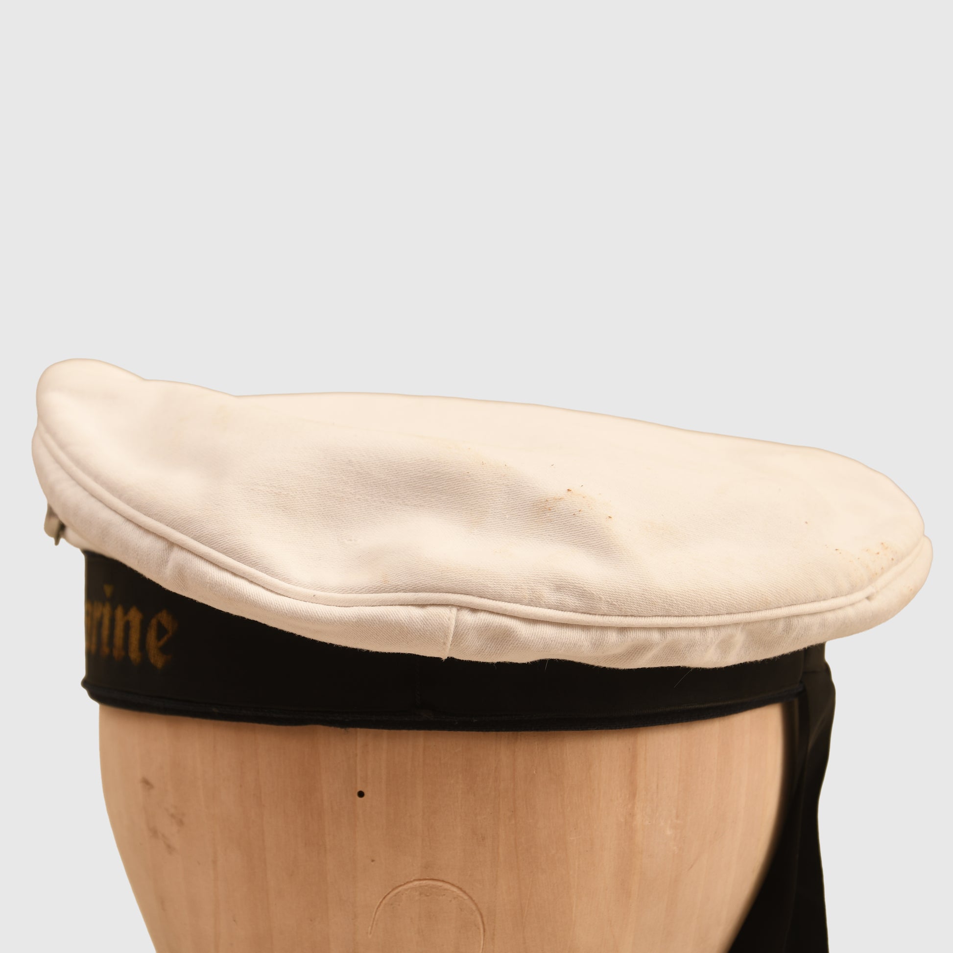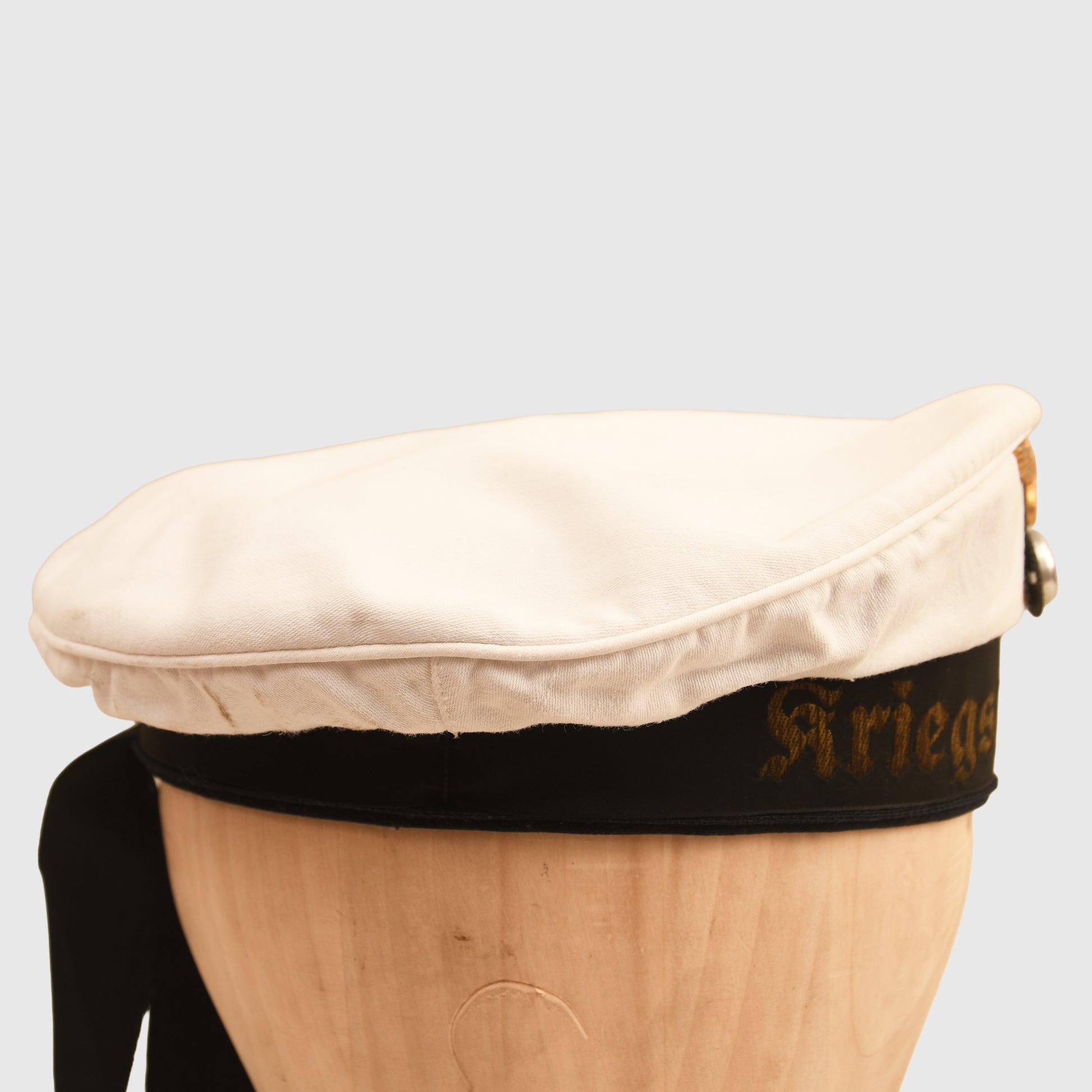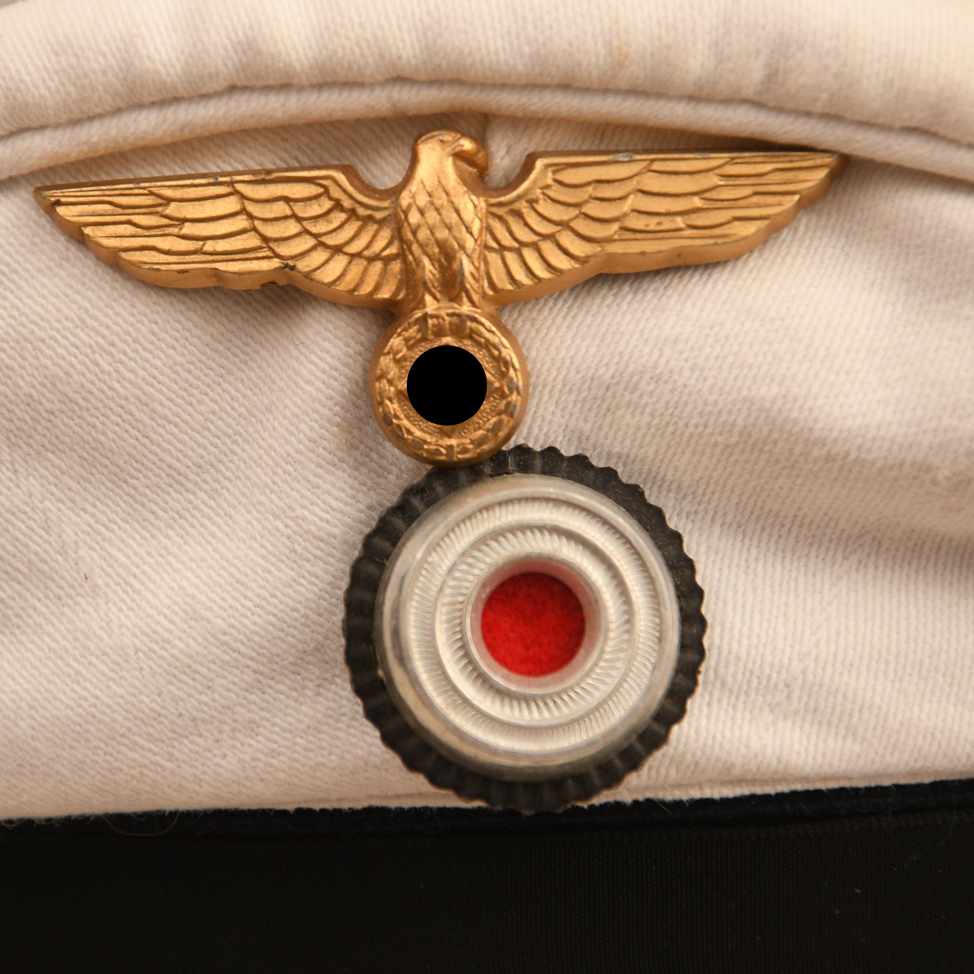 A complete white summer uniform belonging to Obermatrose Wilhelm Ziegler, killed at Sebastopol, Russia, on 7 May 1944 during a massive Russian attack with aerial support. Ziegler was born in Upper Silesia in 1915 (now part of Poland). The set comprises a white top deck cap in excellent condition, possibly size 56, with separately applied Kriegsmarine eagle, swastika, and cockade. The interior features a standard red-on-white embroidered naval label with the name “Ziegler.” Full-length Kriegsmarine cap tally with tails intact, mid-tan leather sweatband showing minor wear, and gold rayon inner lining with faint traces of a retailer’s silver block beneath the centre celluloid lozenge (cracked in one place). White naval summer shirt with Ostsee markings and a second label “Ziegler,” black ink-stamped B.A.K. 1936 date, complete with neck piece, Bevo woven blue-on-white eagle, and drivers badge to the left sleeve. Accompanied by matching white summer trousers with corresponding labels and Ostsee numbers.