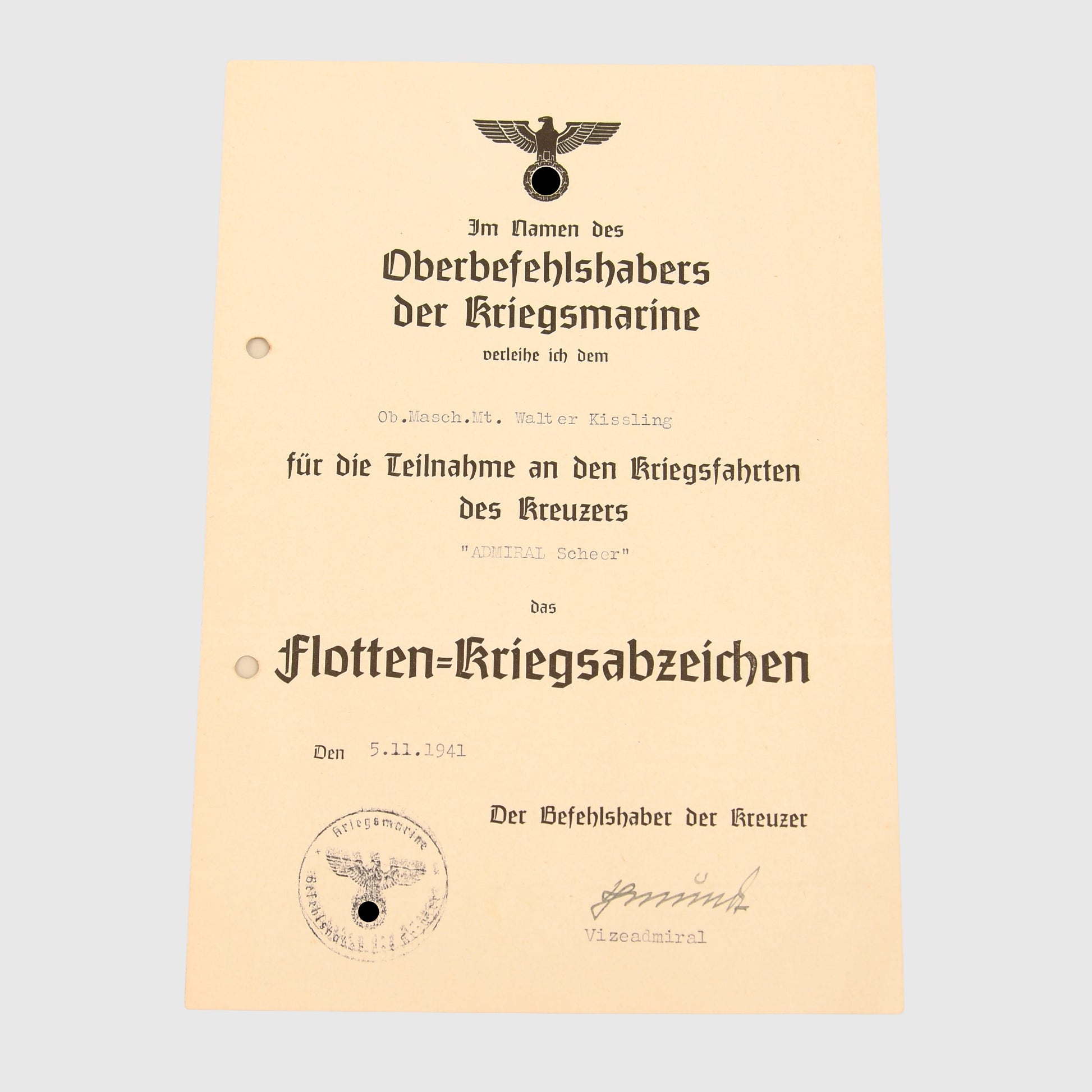 A nice condition, slightly larger than A5 size citation for the High Seas Fleet Badge to Walter Kissling, an obermaschinenist serving on the cruiser Koln, with an ink signature of Vice Admiral Schmundt, together with some background research. Folded once, punch-holed for filing.