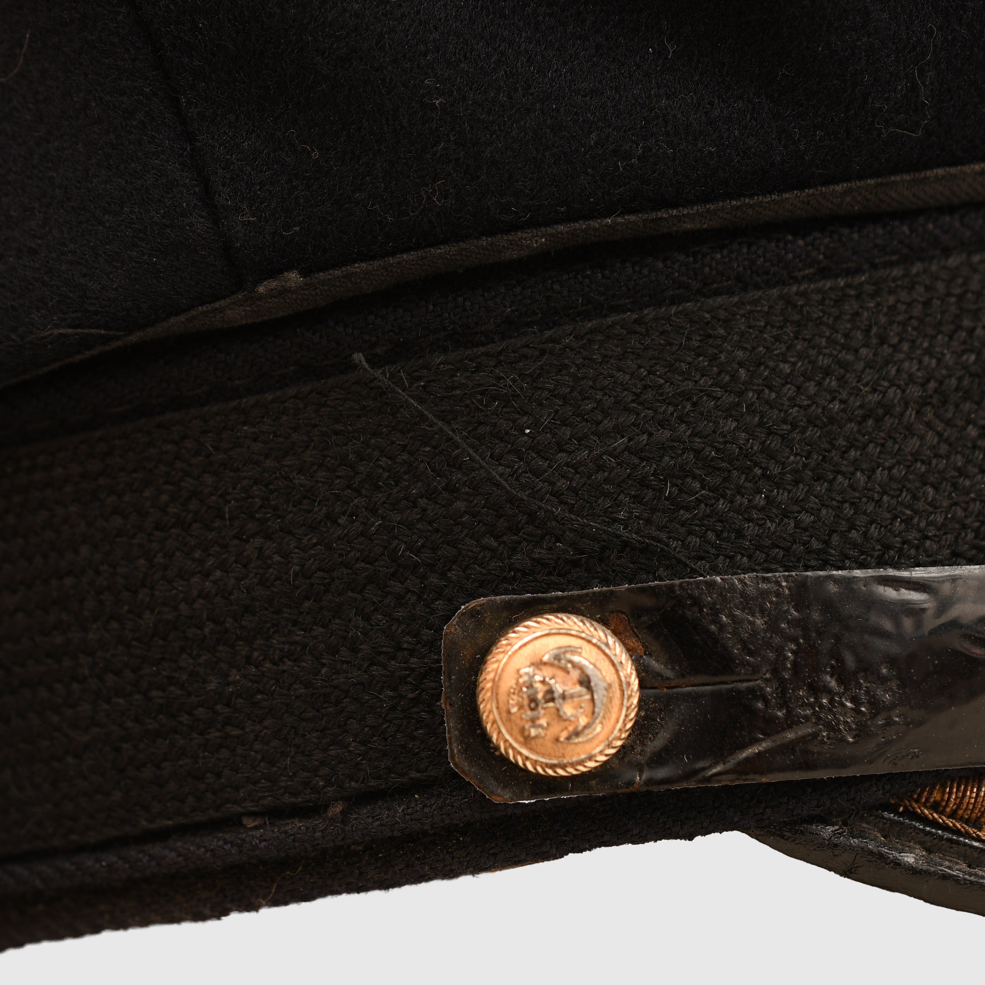 The front features a gold wire national eagle with gold wire rank braiding, and a gold wire woven central cockade, which has naturally oxidised to a greenish tone. The cap is fitted with its correct naval officers strap secured by twin gilded side buttons.