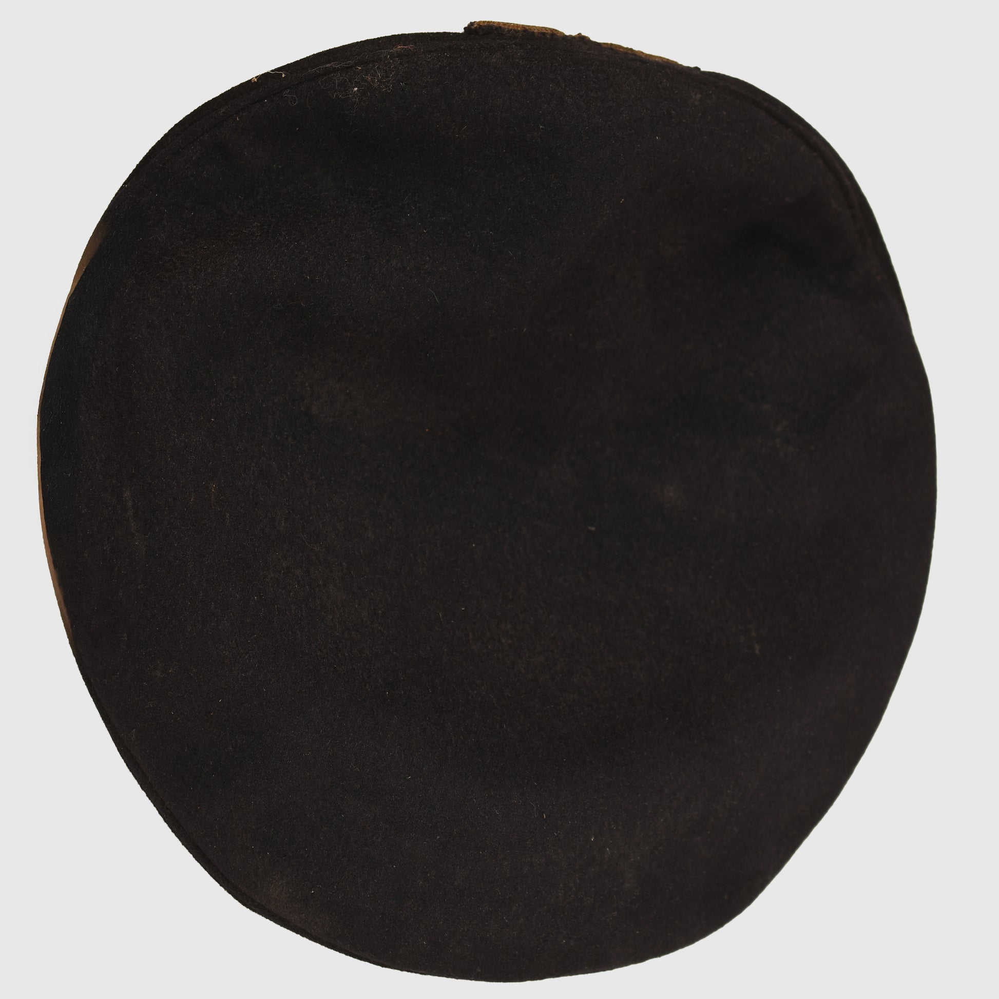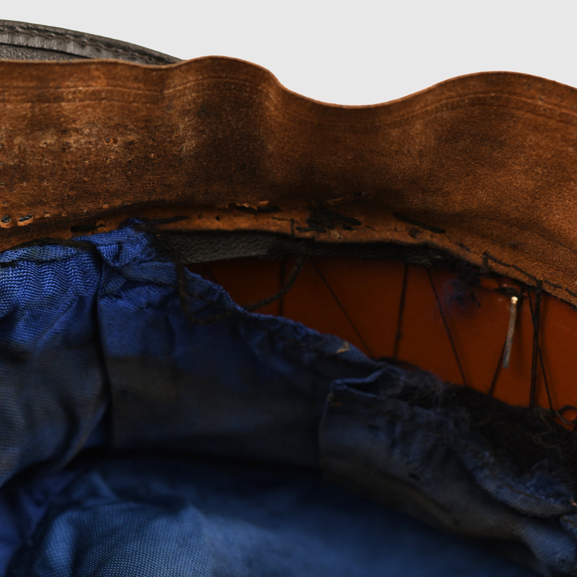 To the interior, the light tan leather sweatband shows signs of considerable wear but remains intact. The inner lining of mid-blue rayon is complete, with slight hair grease staining to the upper crown, reflecting period use; notably, the crown was never fitted with a protective celluloid lozenge.