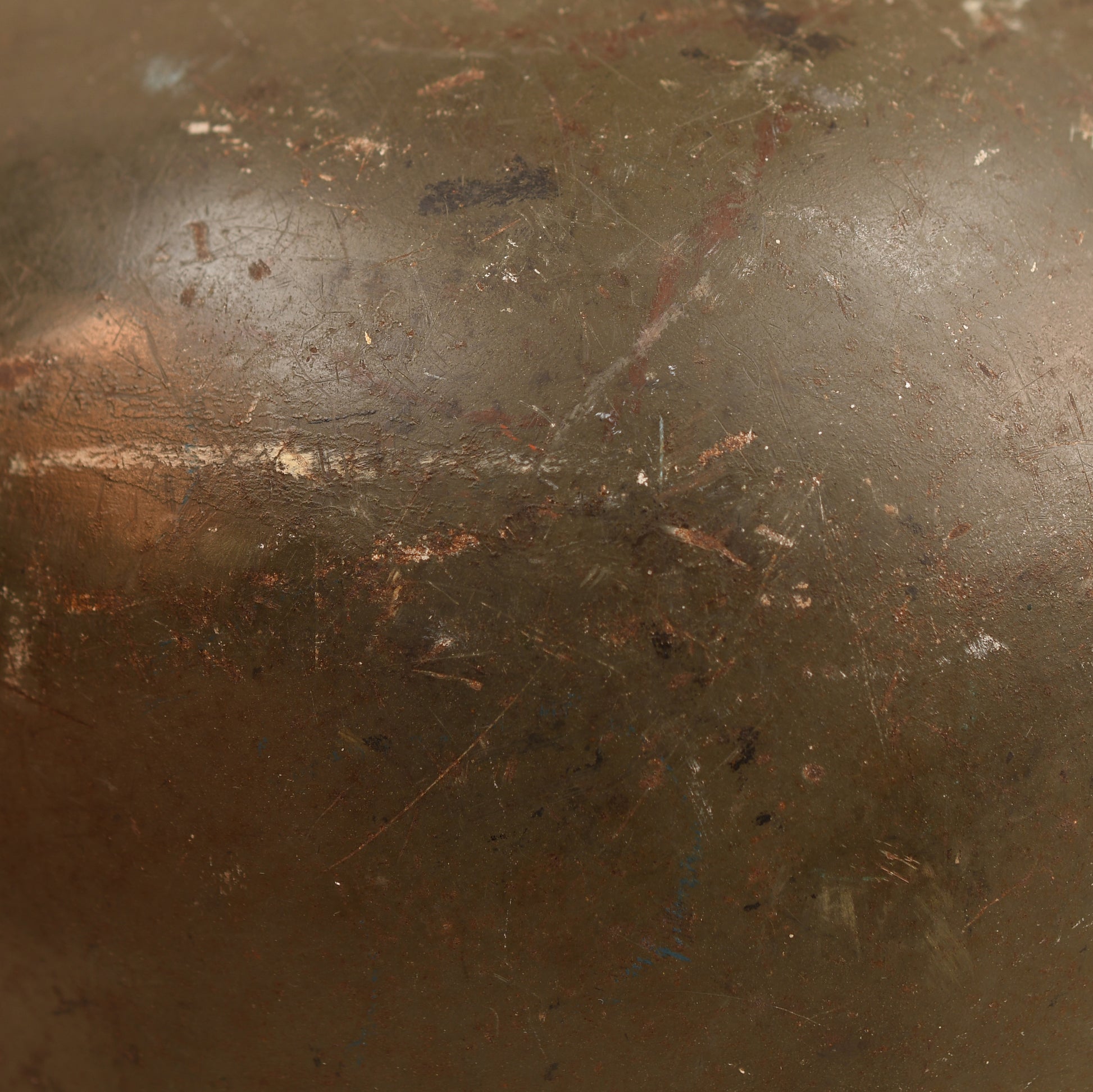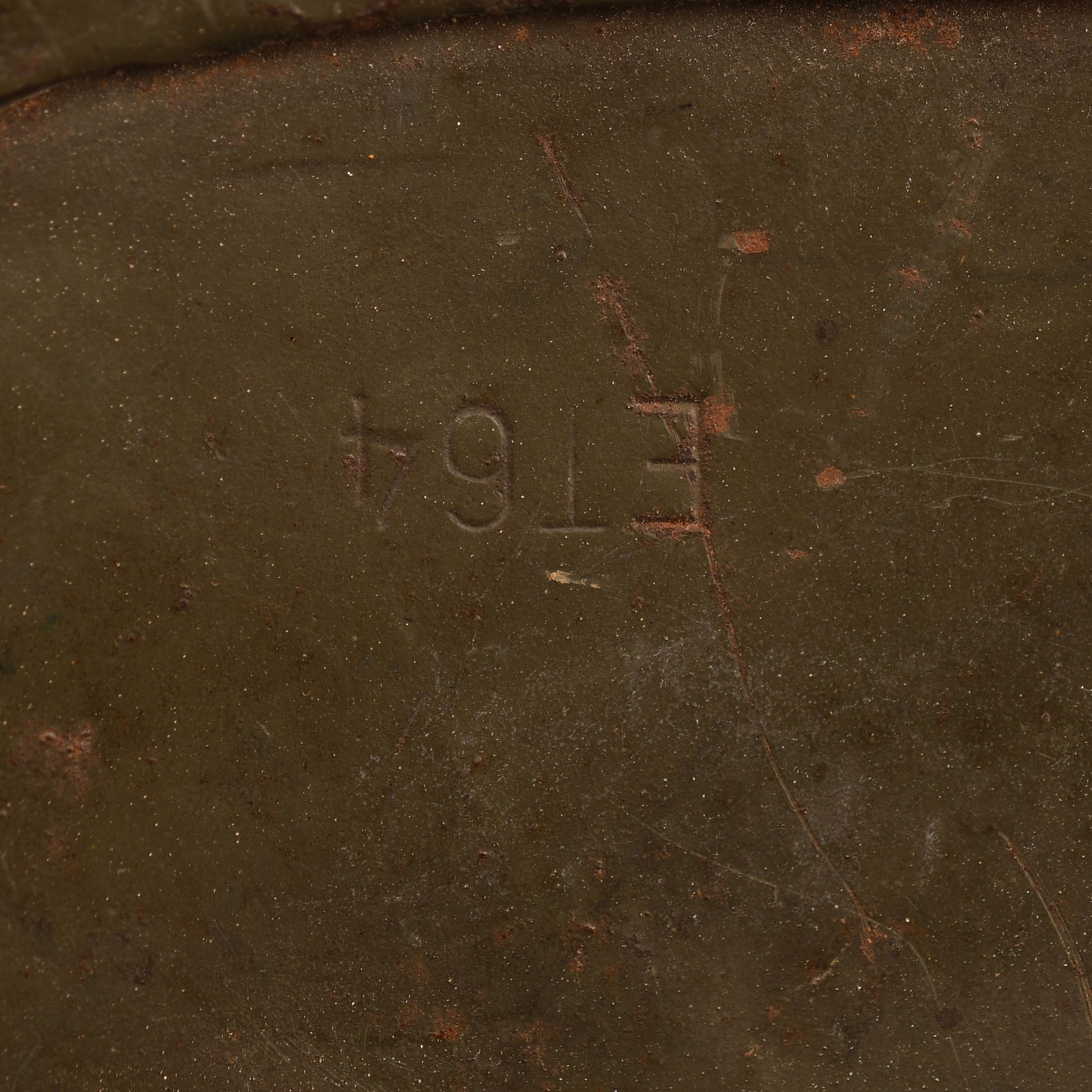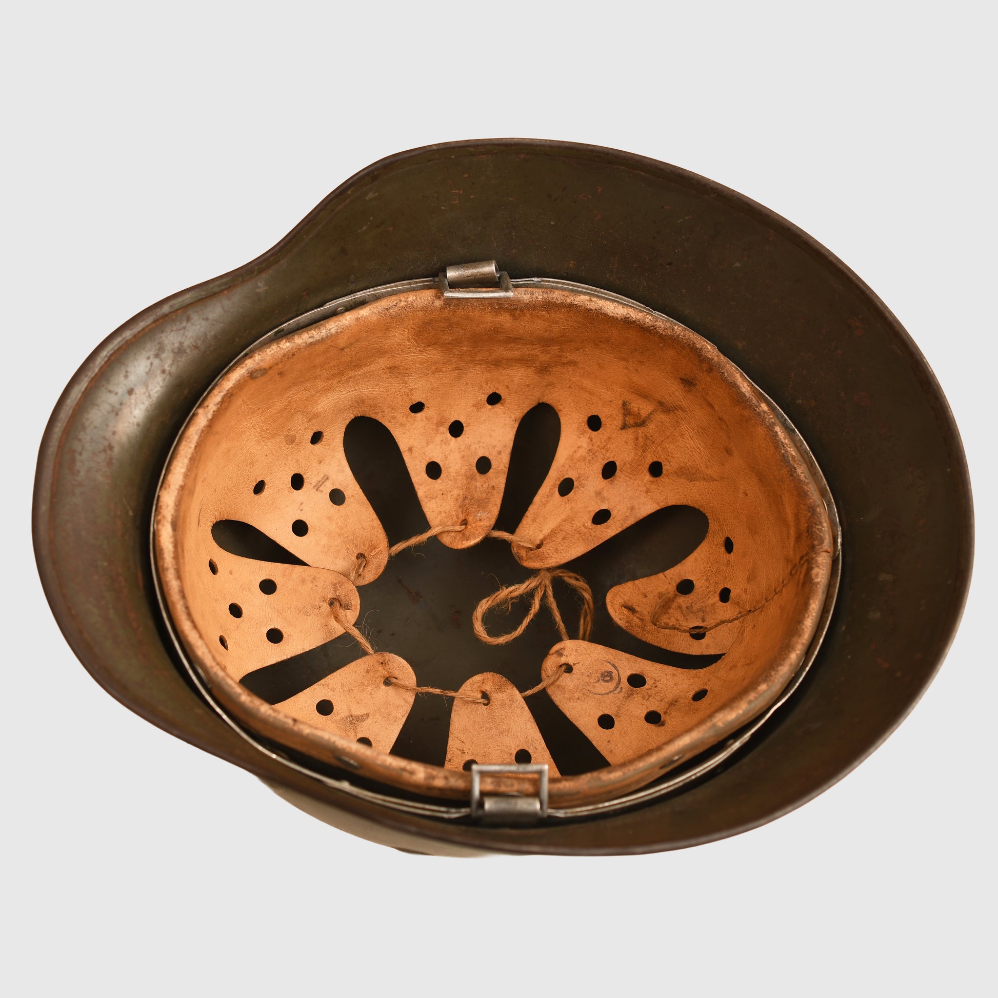 A historically interesting M35 Kriegsmarine helmet, originally issued as a double decal under pre-1940 regulations. The single decal has been removed in accordance with 1940 regulations, leaving a faint outline visible. Shell stamped ET64, retaining much of its original apple green finish with some minor abrasions. The gold Kriegsmarine eagle shows light wear but remains clearly visible. The interior liner, stamped size 56, retains much of its original light tan colour, complete and supple, with the original drawstring intact.