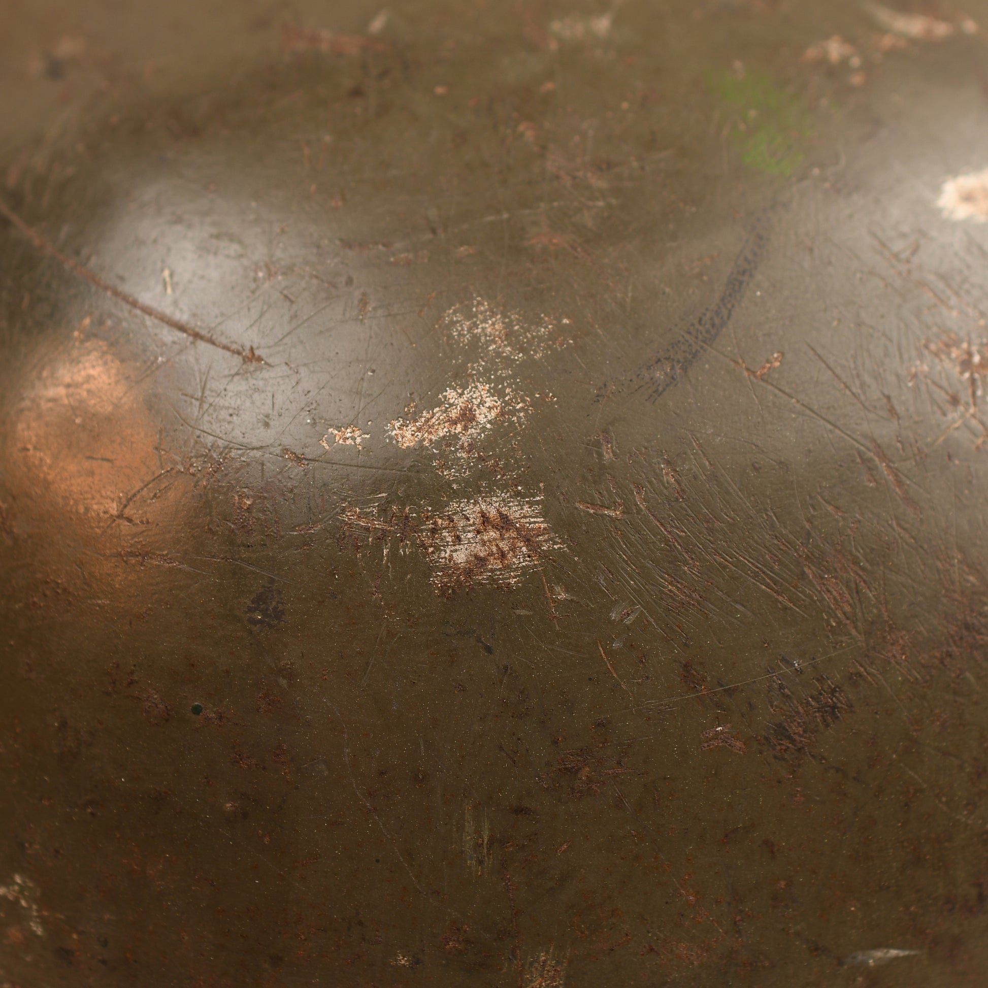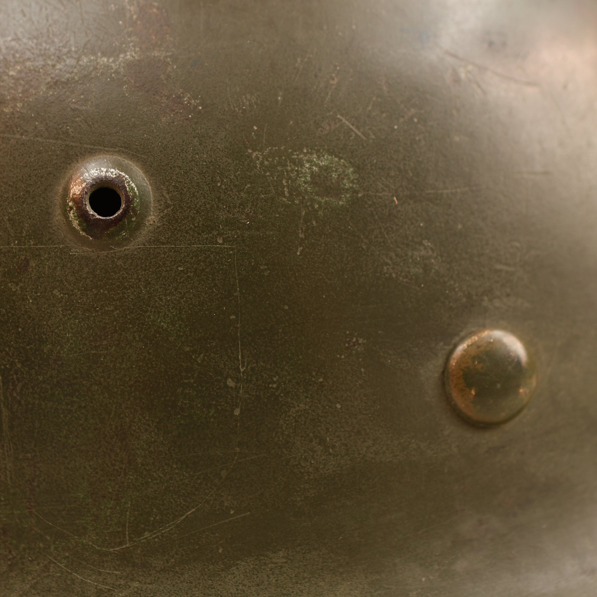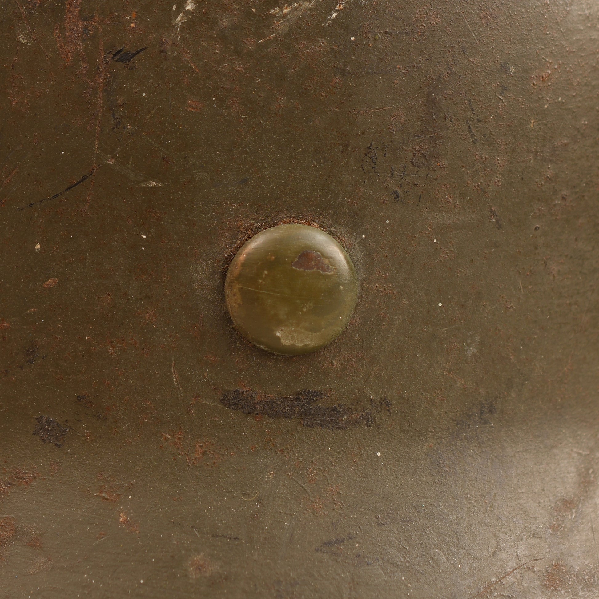 A historically interesting M35 Kriegsmarine helmet, originally issued as a double decal under pre-1940 regulations. The single decal has been removed in accordance with 1940 regulations, leaving a faint outline visible. Shell stamped ET64, retaining much of its original apple green finish with some minor abrasions. The gold Kriegsmarine eagle shows light wear but remains clearly visible. The interior liner, stamped size 56, retains much of its original light tan colour, complete and supple, with the original drawstring intact.
