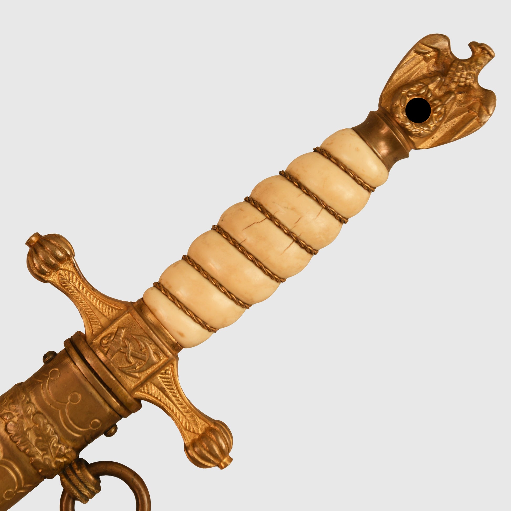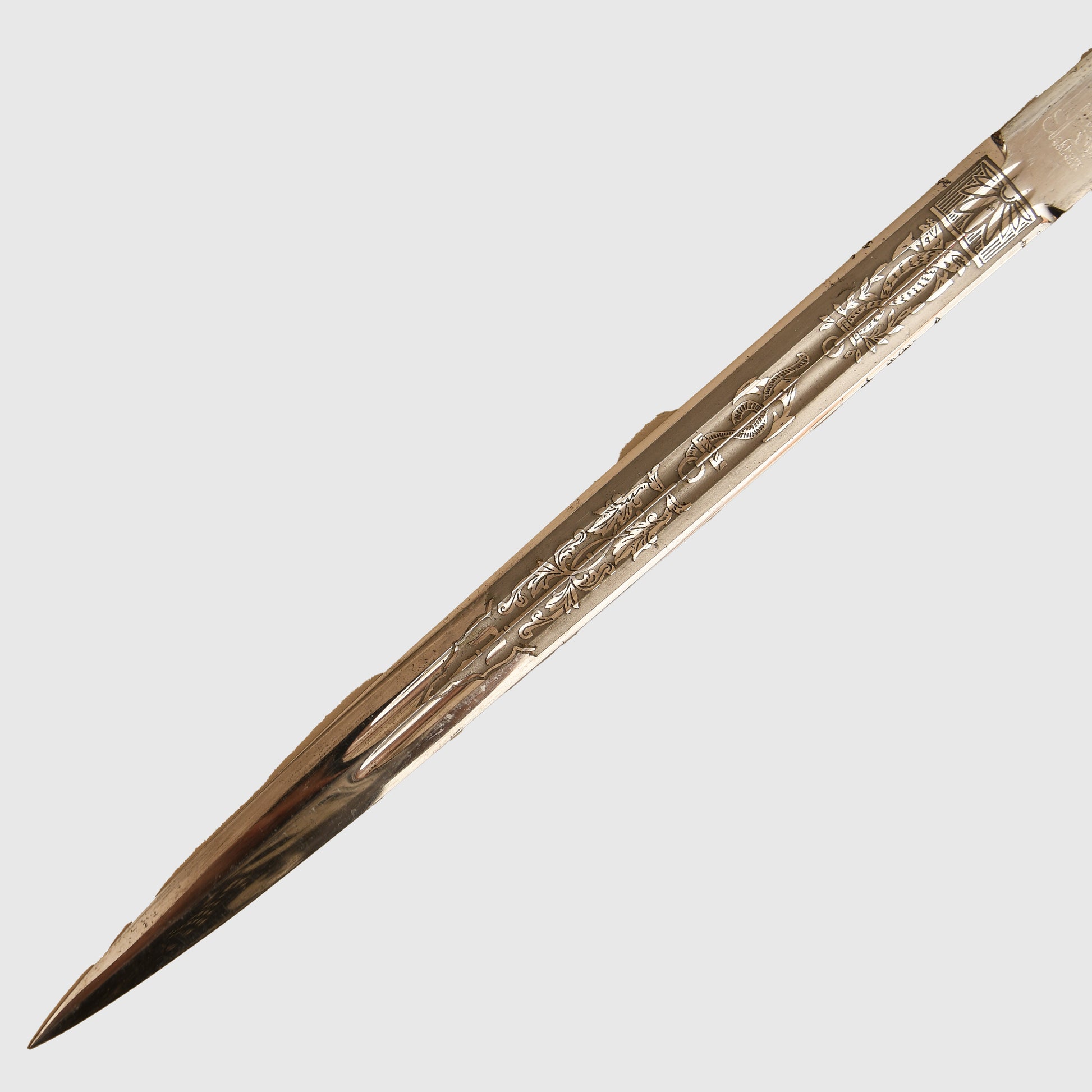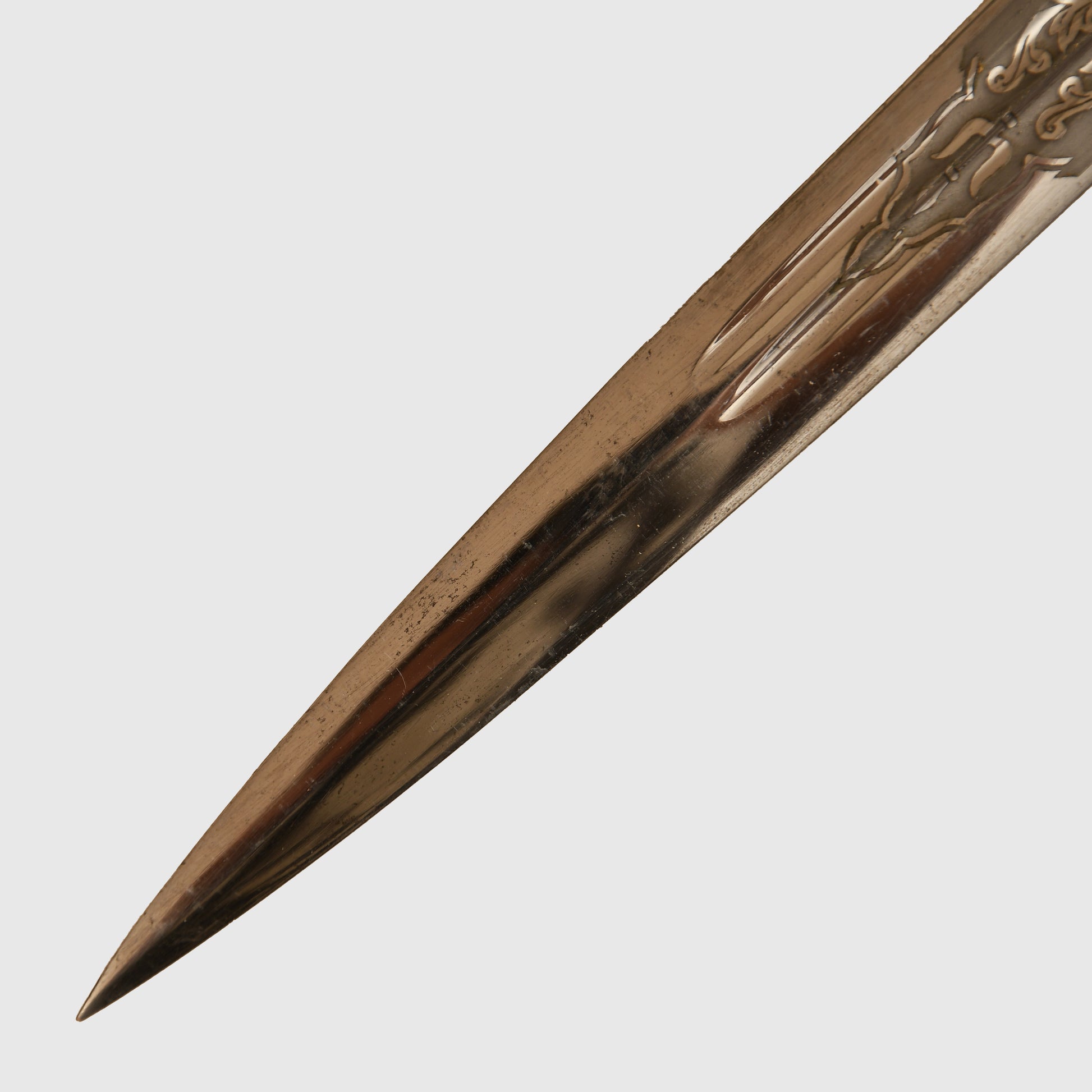 The scabbard features the standard engraved pattern and has one minor depression about one third up from the base—this is not a dent. Both scabbard rings are intact with no other damage. Some gilt remains in the lower field of the scabbard. The display piece fits tightly with its press button fitting into the scabbard.
