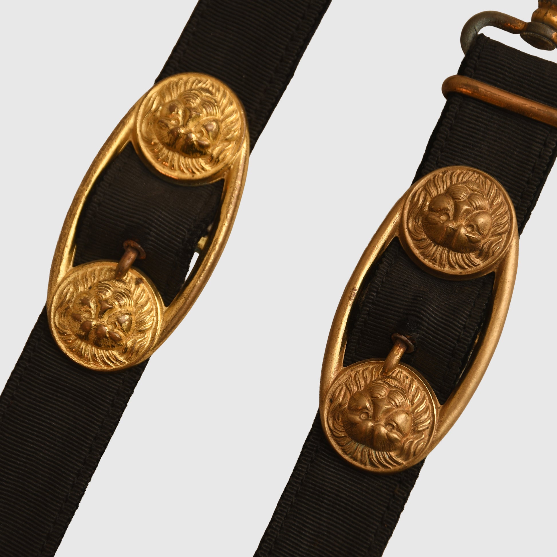 The celluloid grip is fully intact with its original wire in place, complemented by the silver portepee knot still wrapped in its period configuration, showing only light oxidisation. Included is a matching set of aluminium buckled straps, both lion heads bearing the starburst maker’s mark to the reverse. The strapping remains supple and unfaded, with all four sprung-loaded gilded clips functioning perfectly, and the small steadying chain still retaining its gold-toned wash. A particularly fine and complete example.