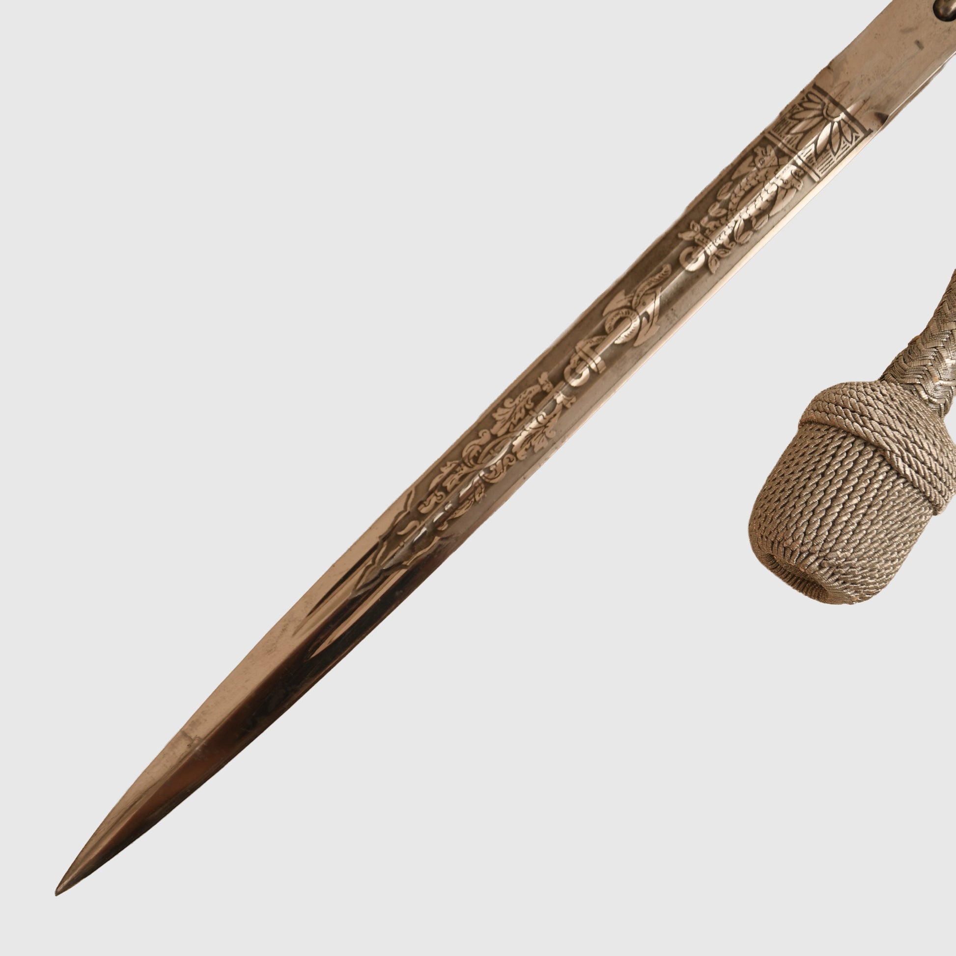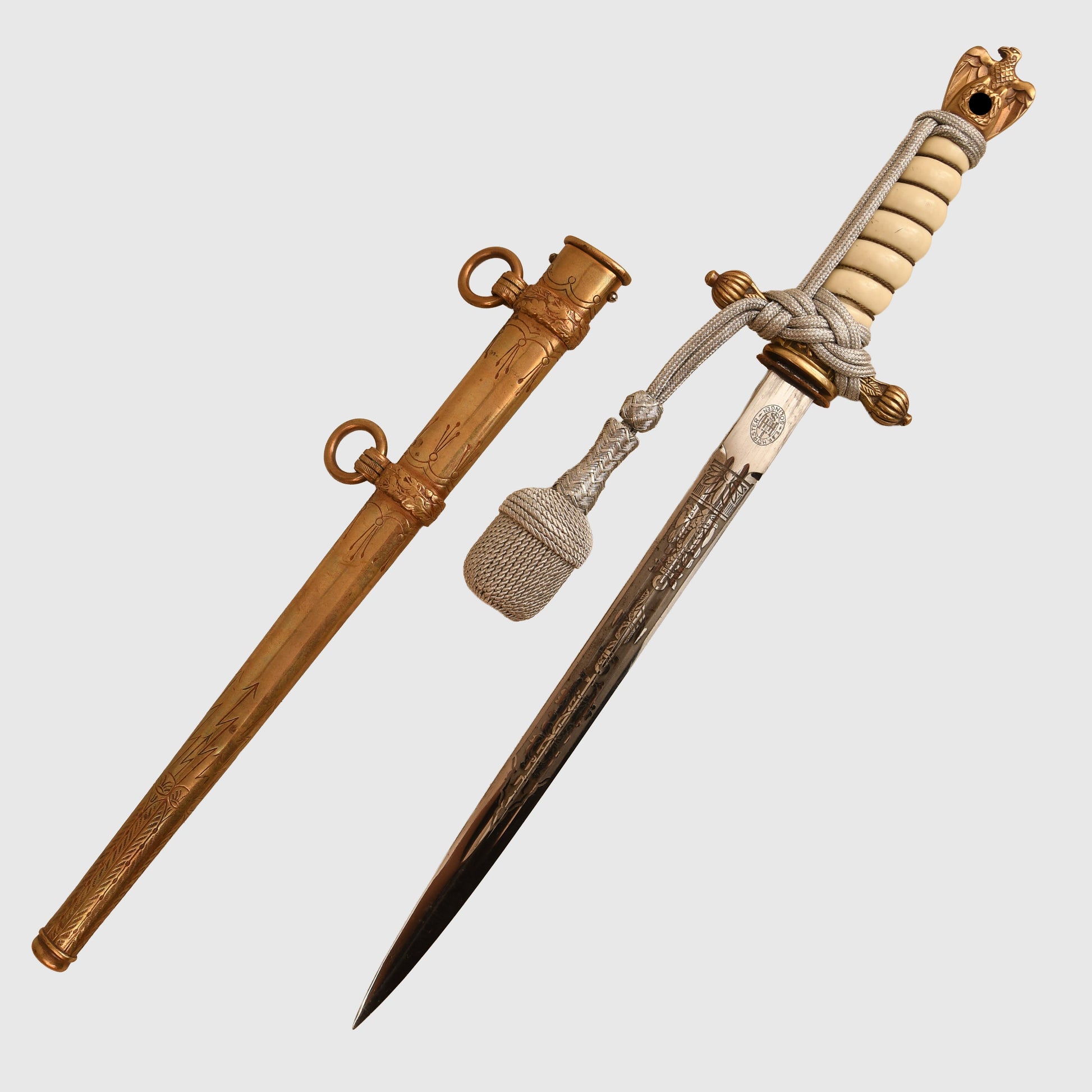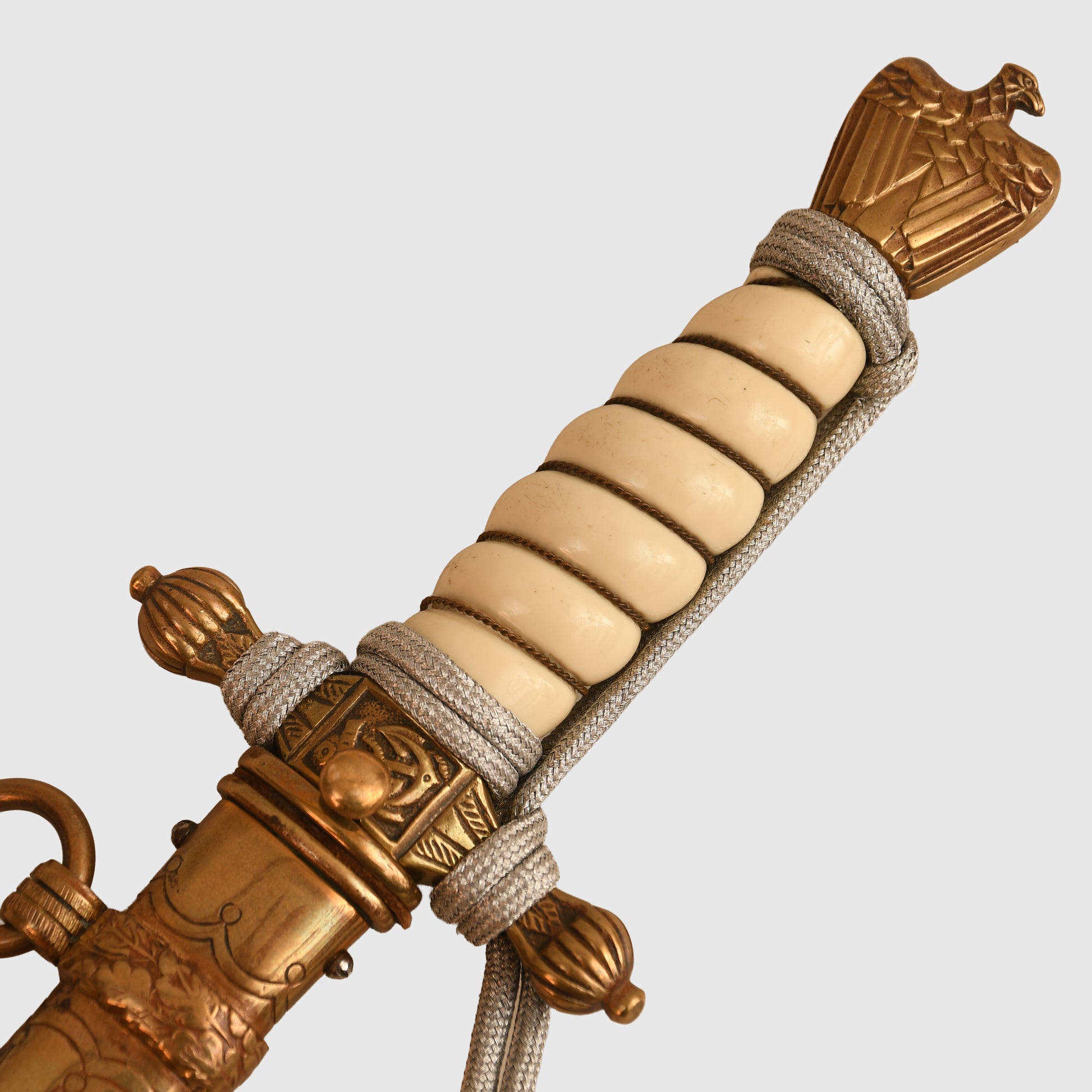 An elegant and well-preserved example of a Kriegsmarine officer’s display piece, featuring the standard naval etching by the renowned firm Eickhorn and retaining its original leather washer. The fit between hilt and scabbard is tight and precise, reflecting excellent craftsmanship. The gilt finish on the eagle pommel, cross guard, and scabbard remains bright and even, with no indentations to the lower section.