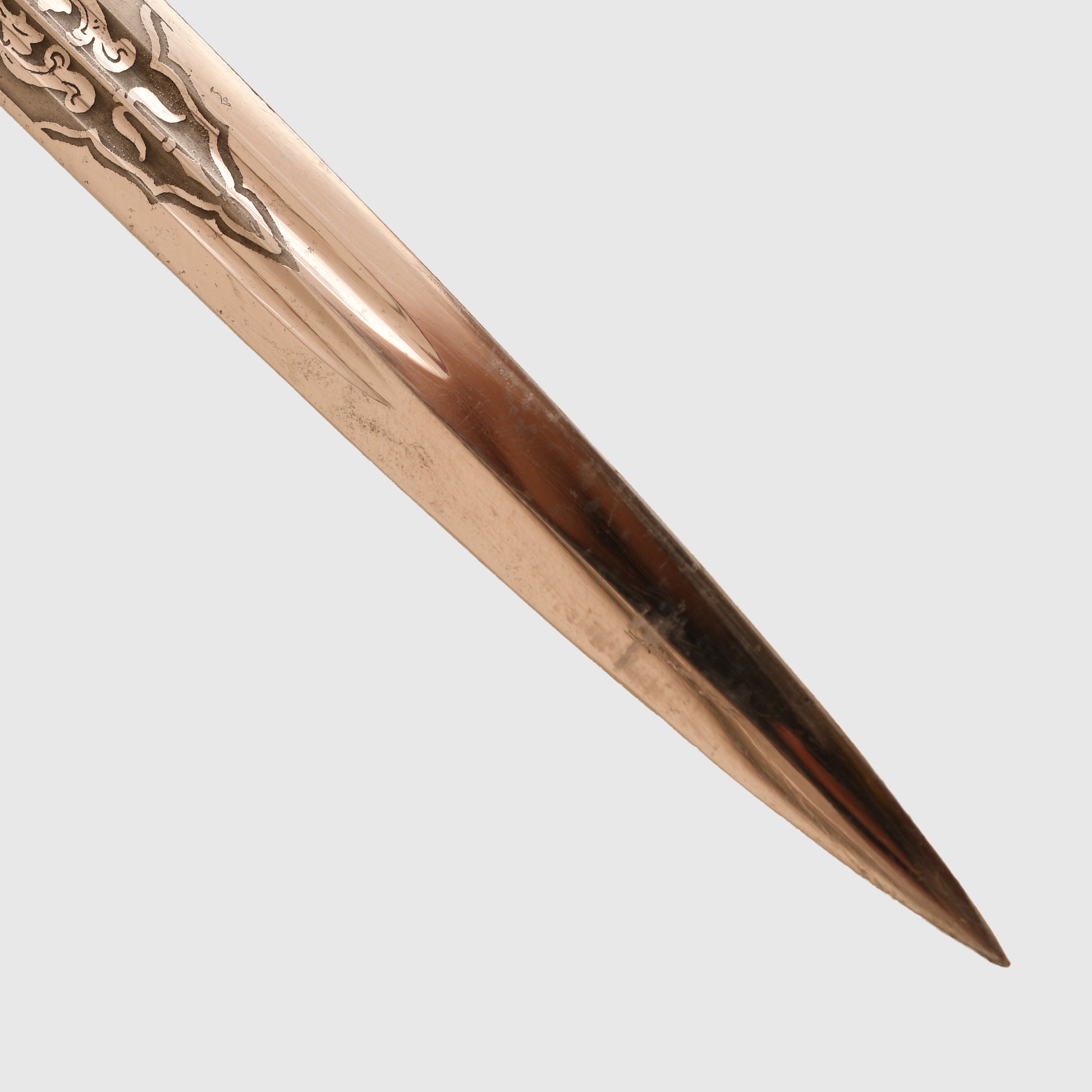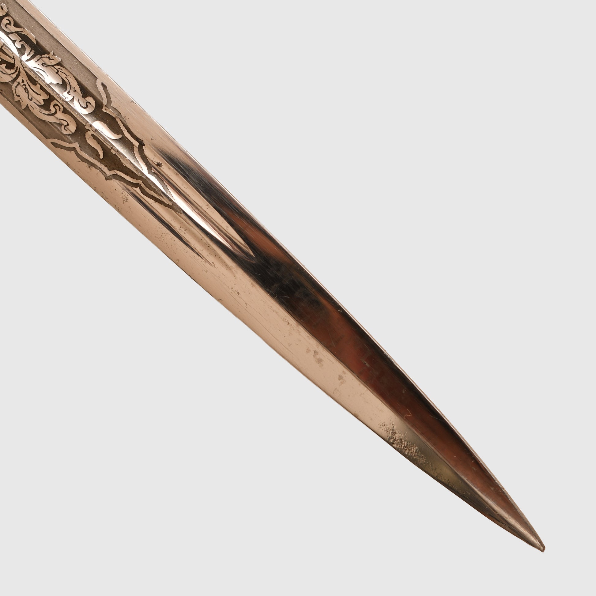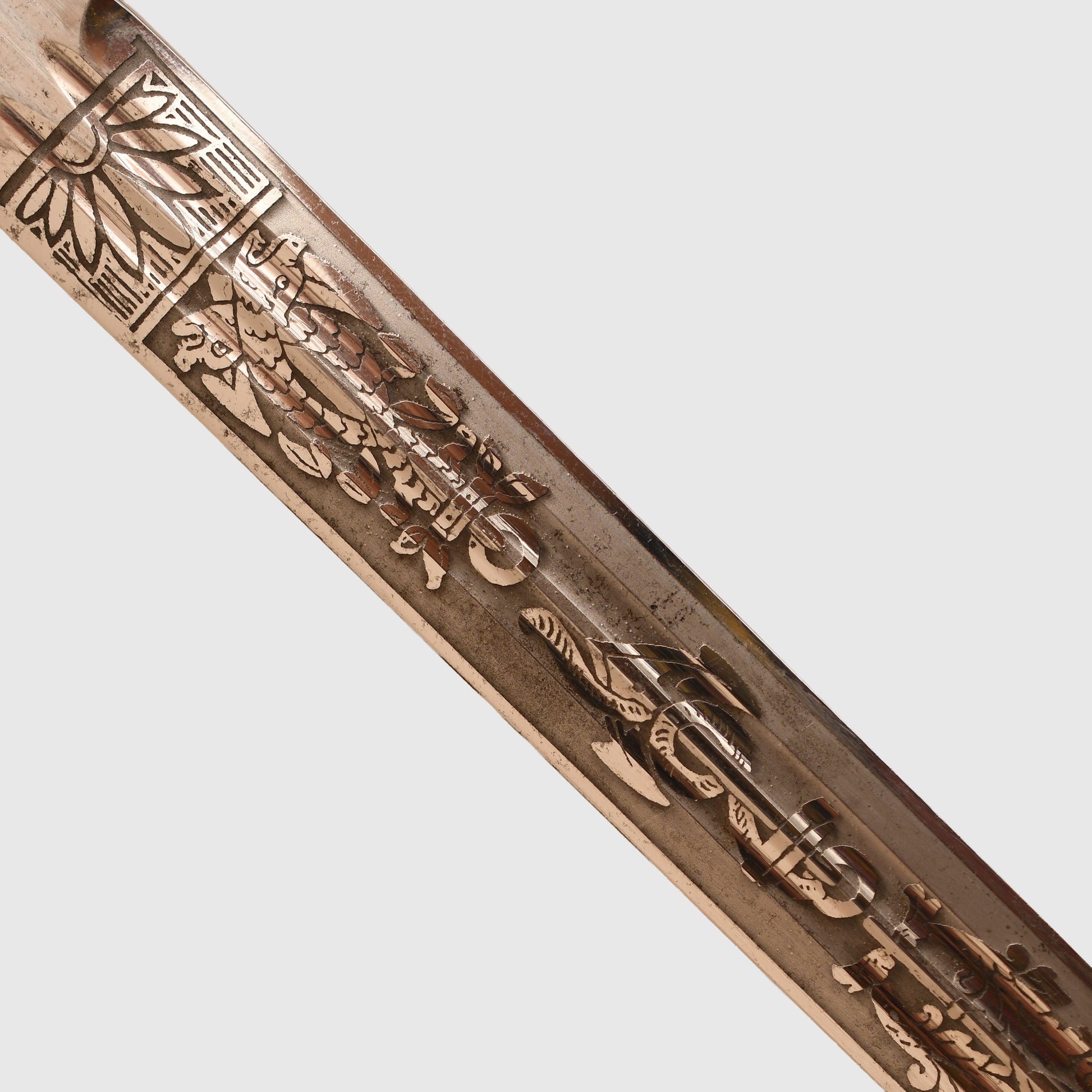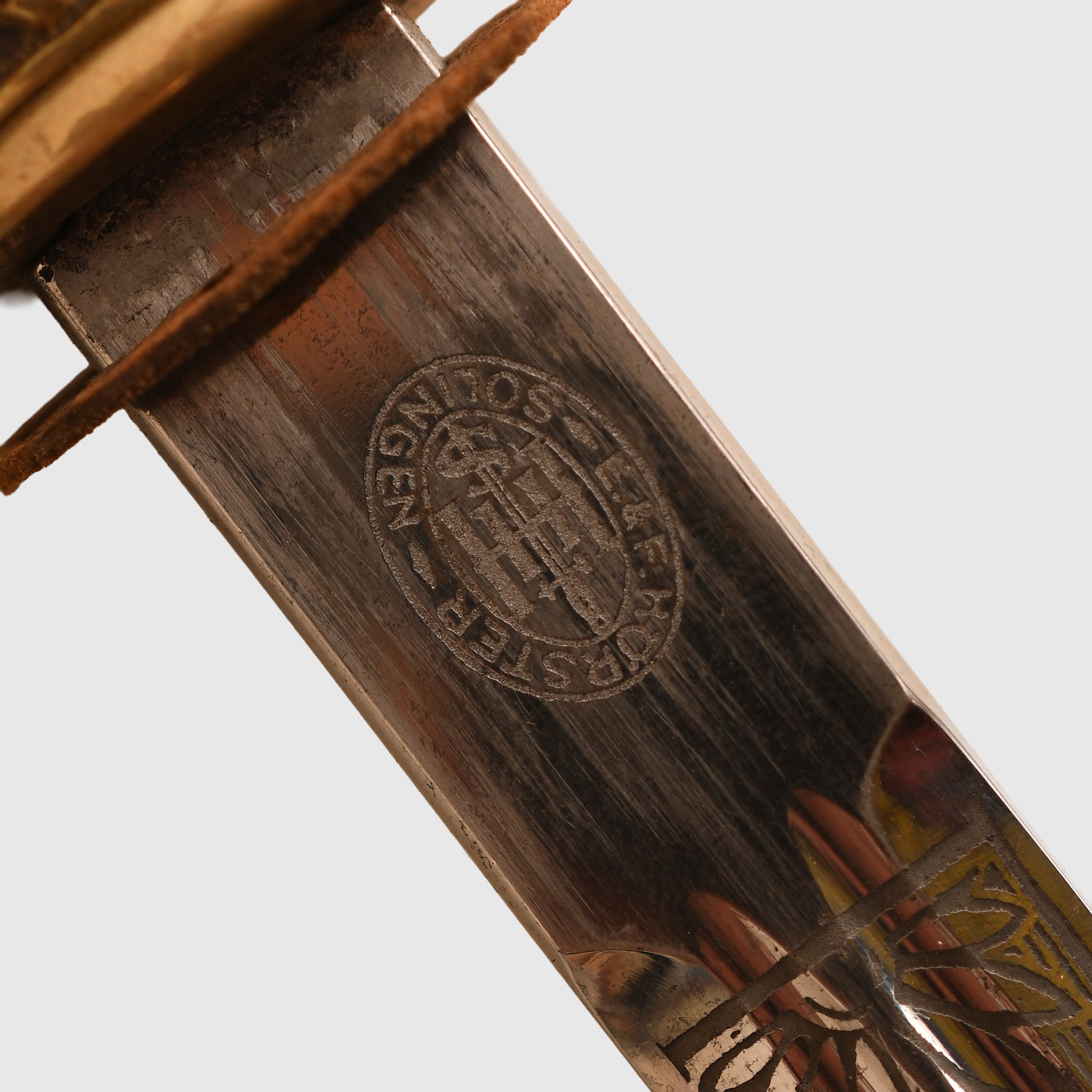 An elegant and well-preserved example of a Kriegsmarine officer’s display piece, featuring the standard naval etching by the renowned firm Eickhorn and retaining its original leather washer. The fit between hilt and scabbard is tight and precise, reflecting excellent craftsmanship. The gilt finish on the eagle pommel, cross guard, and scabbard remains bright and even, with no indentations to the lower section.