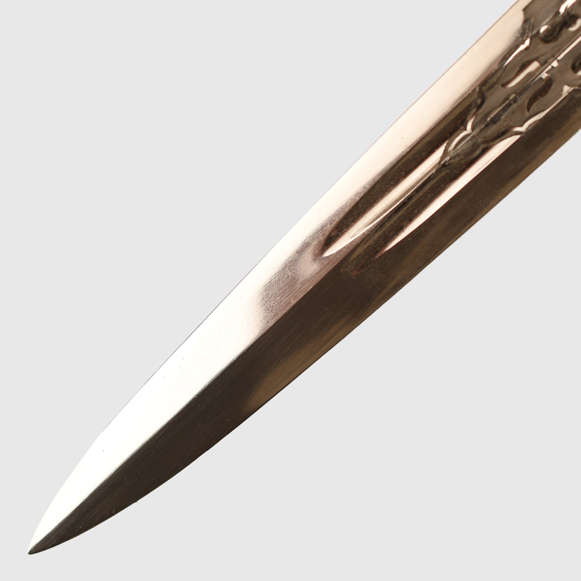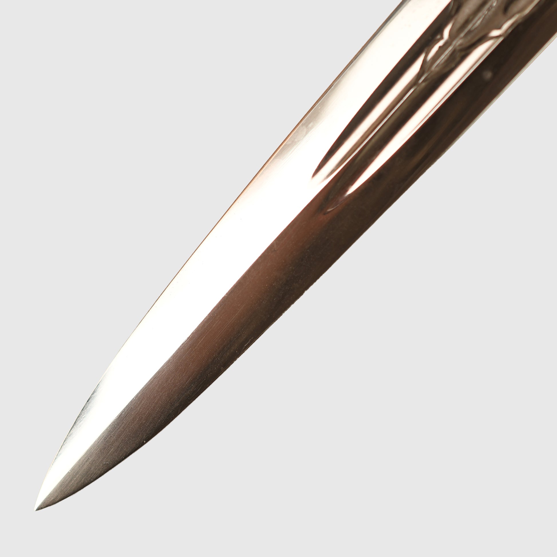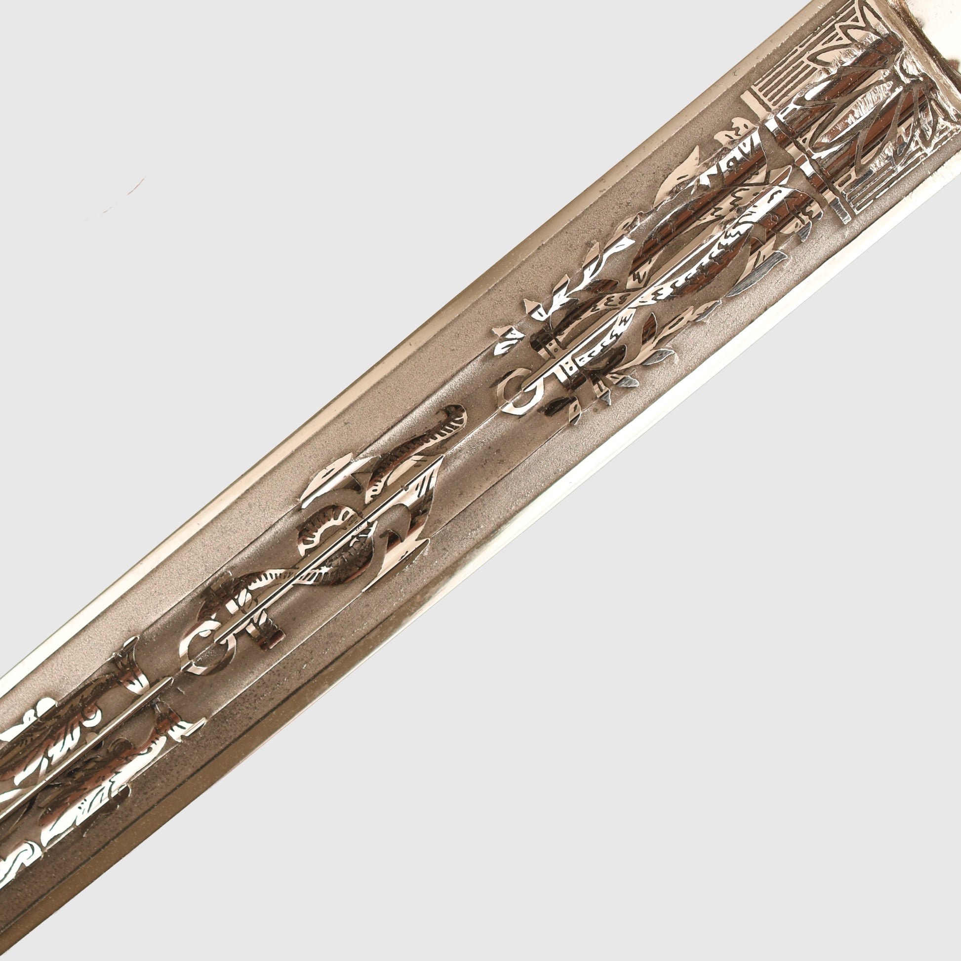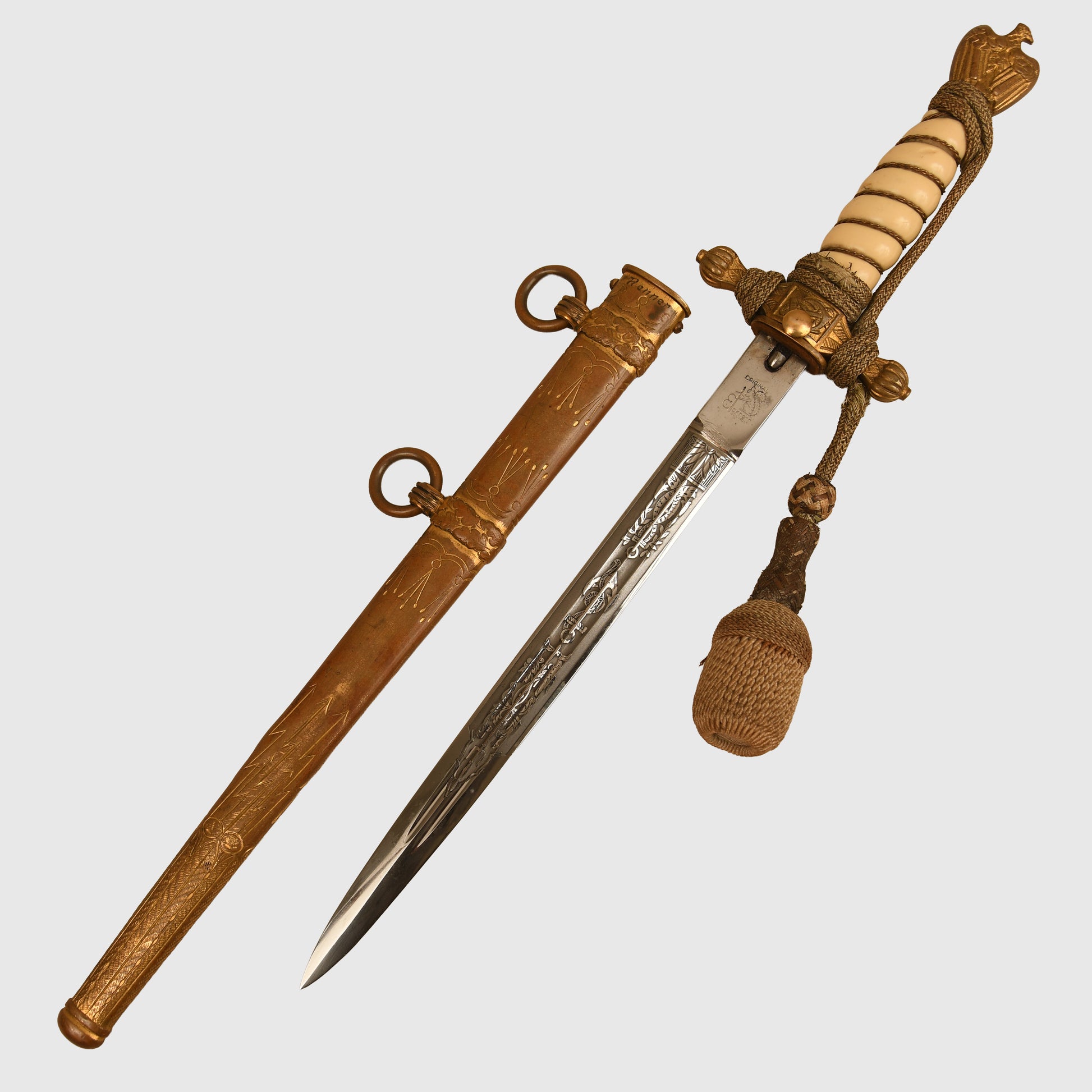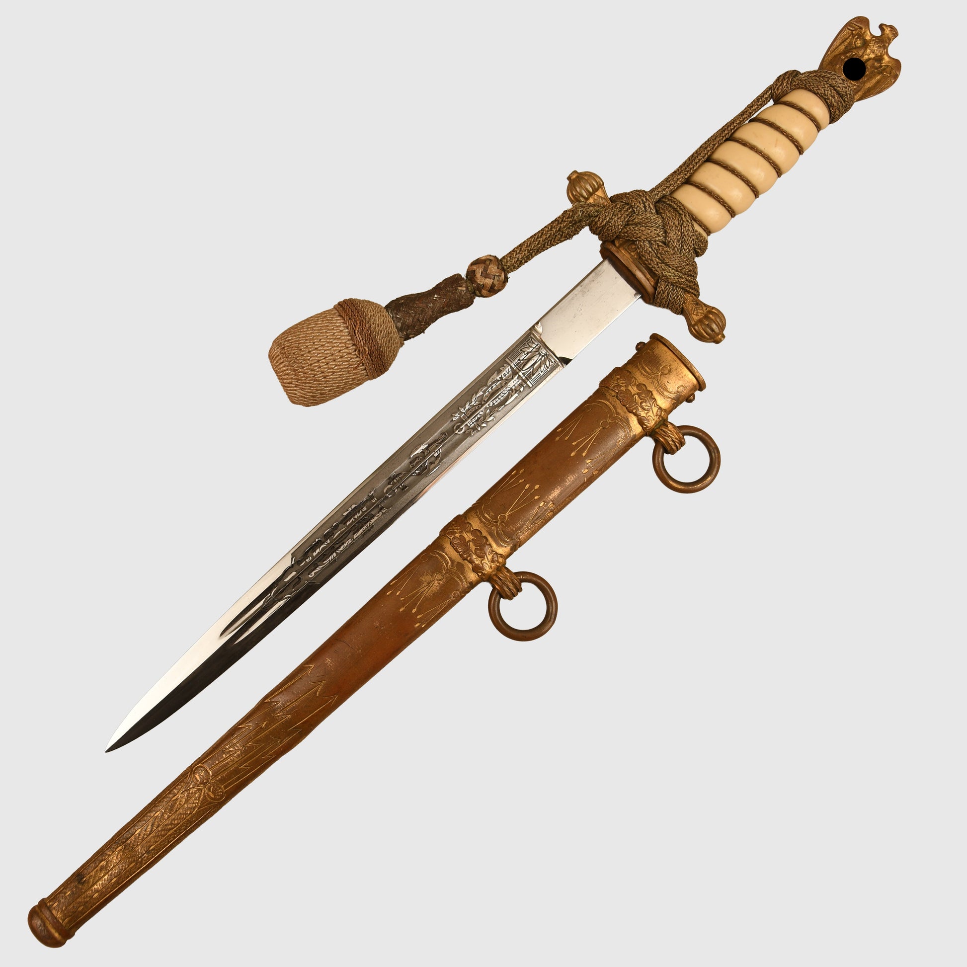 A historically important Second World War Kriegsmarine officers display piece produced by Eickhorn. The piece retains the standard naval decorative panels to both sides and is maker marked to Eickhorn. The celluloid grip shows only minor surface abrasions with no cracking, fitted with its original gold portepee in the correct wrap, showing some light thinning to the wire weave in places. The hilt fittings retain good traces of original gilt, with the grip wire intact and bright.