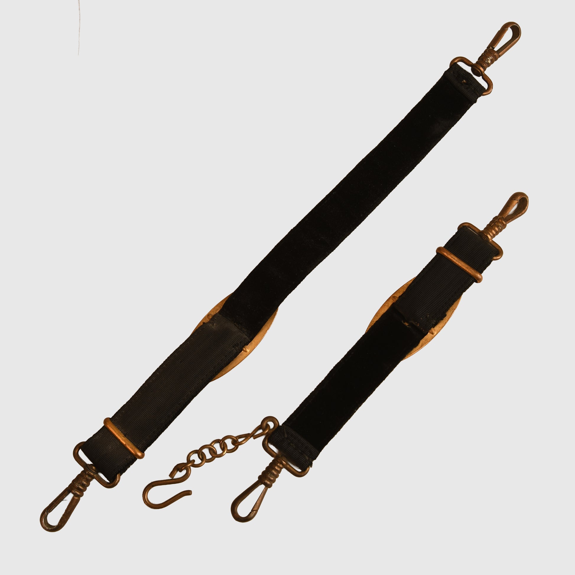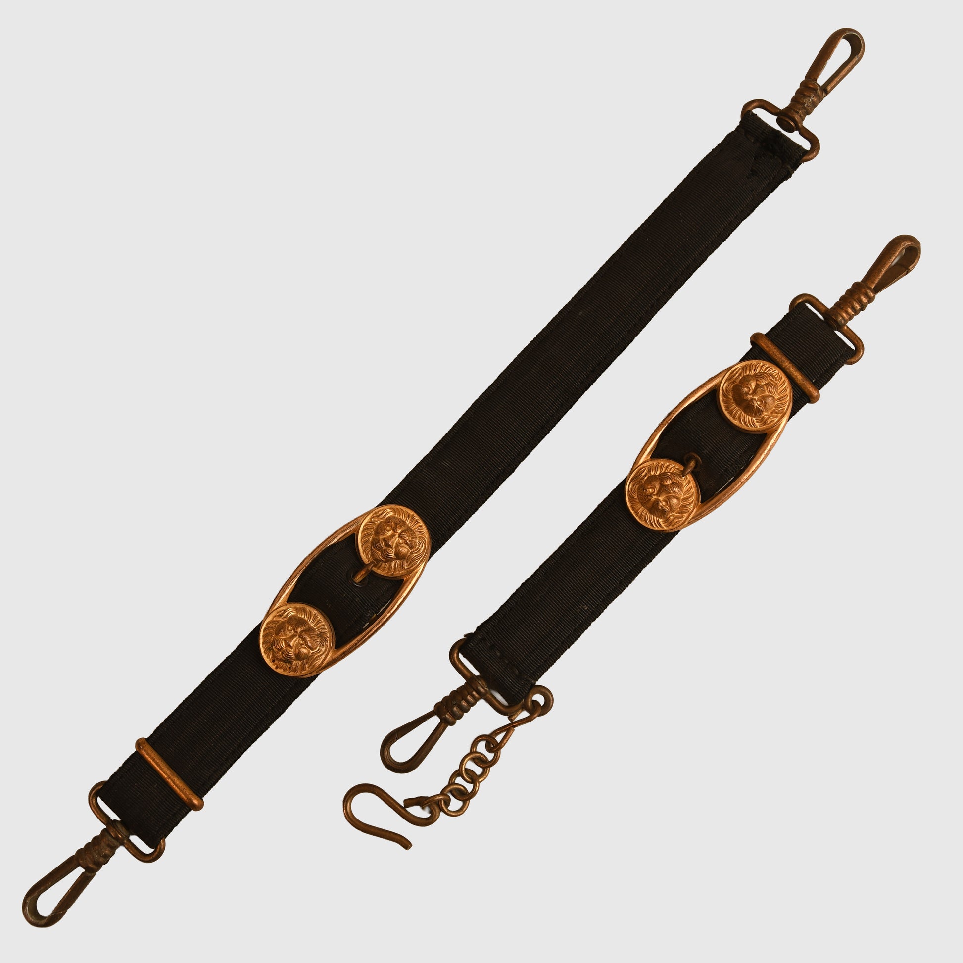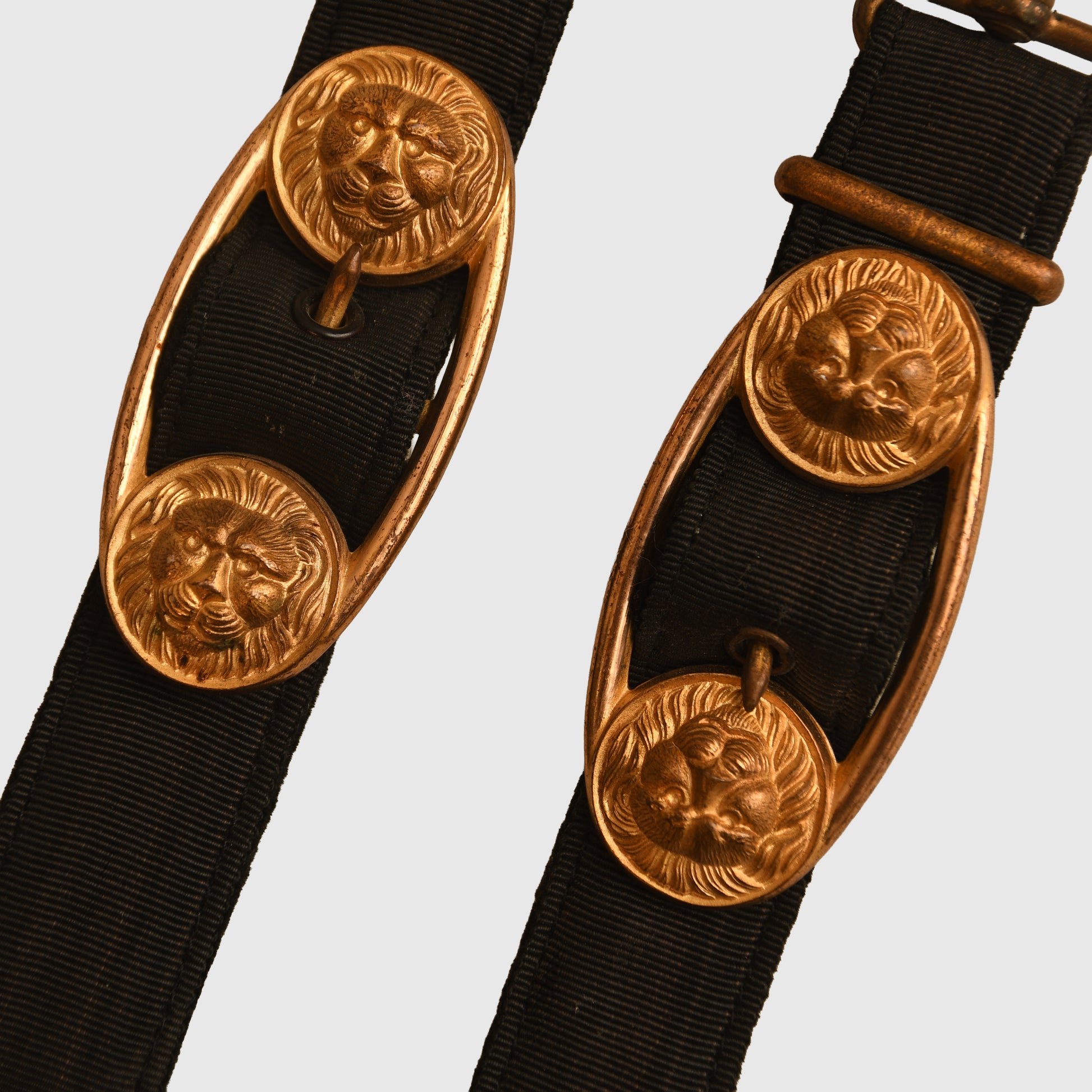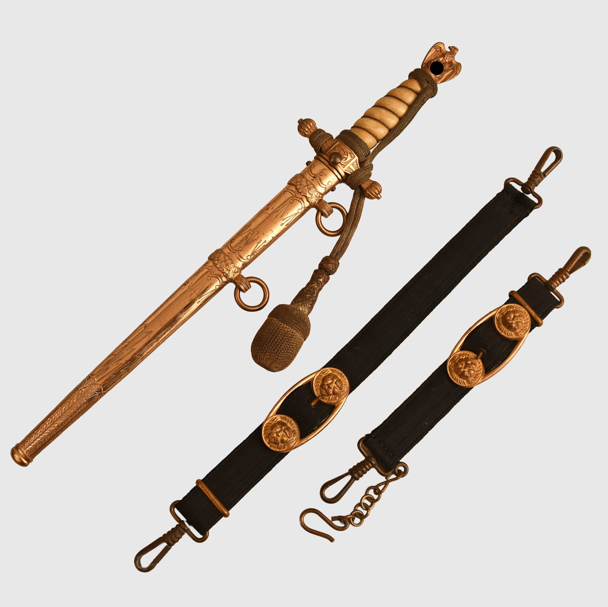 The celluloid grip shows gentle age toning with three small surface lines but remains complete with its original grip wire. The scabbard, notably free from dents—a rarity among naval examples—retains beautiful original gilt throughout. Still accompanied by its original portepee knot, tied in the correct manner, and a matching set of lion mask hangers on black velvet backing. The lion-head buckles bear the correct double-dot maker marking, and all clips and attachments remain functional, including the short steadying chain.