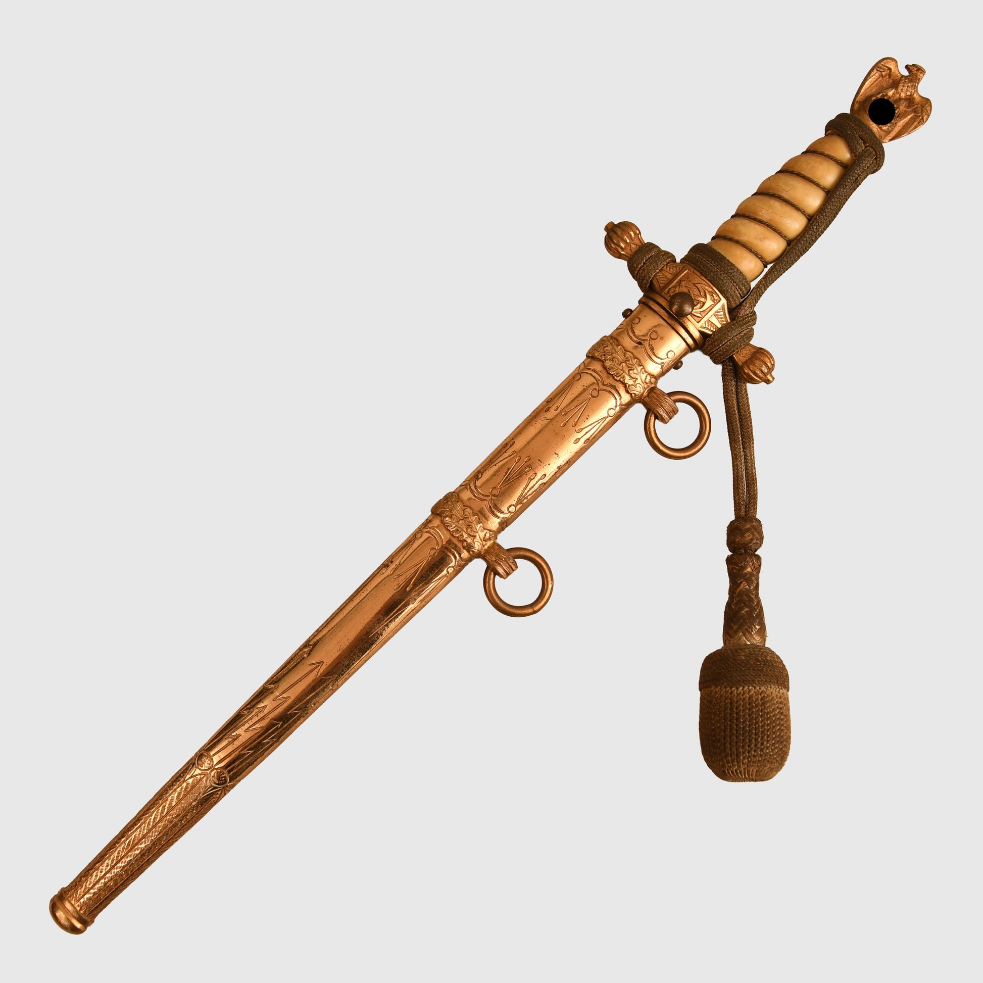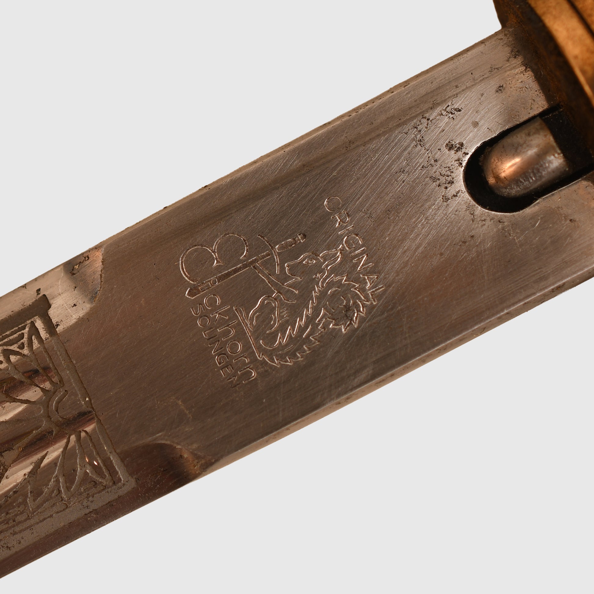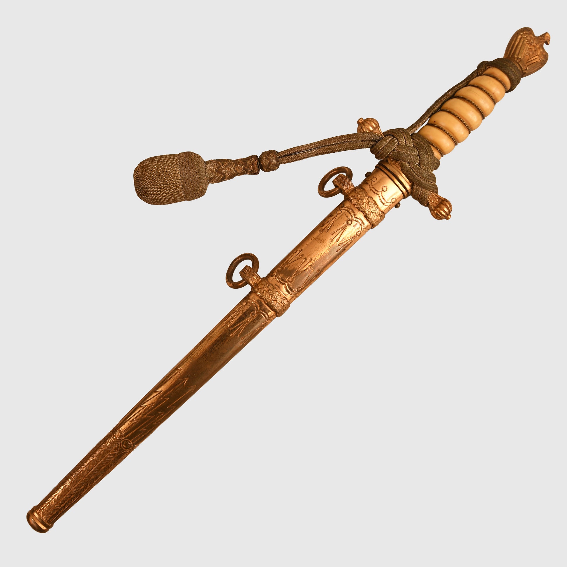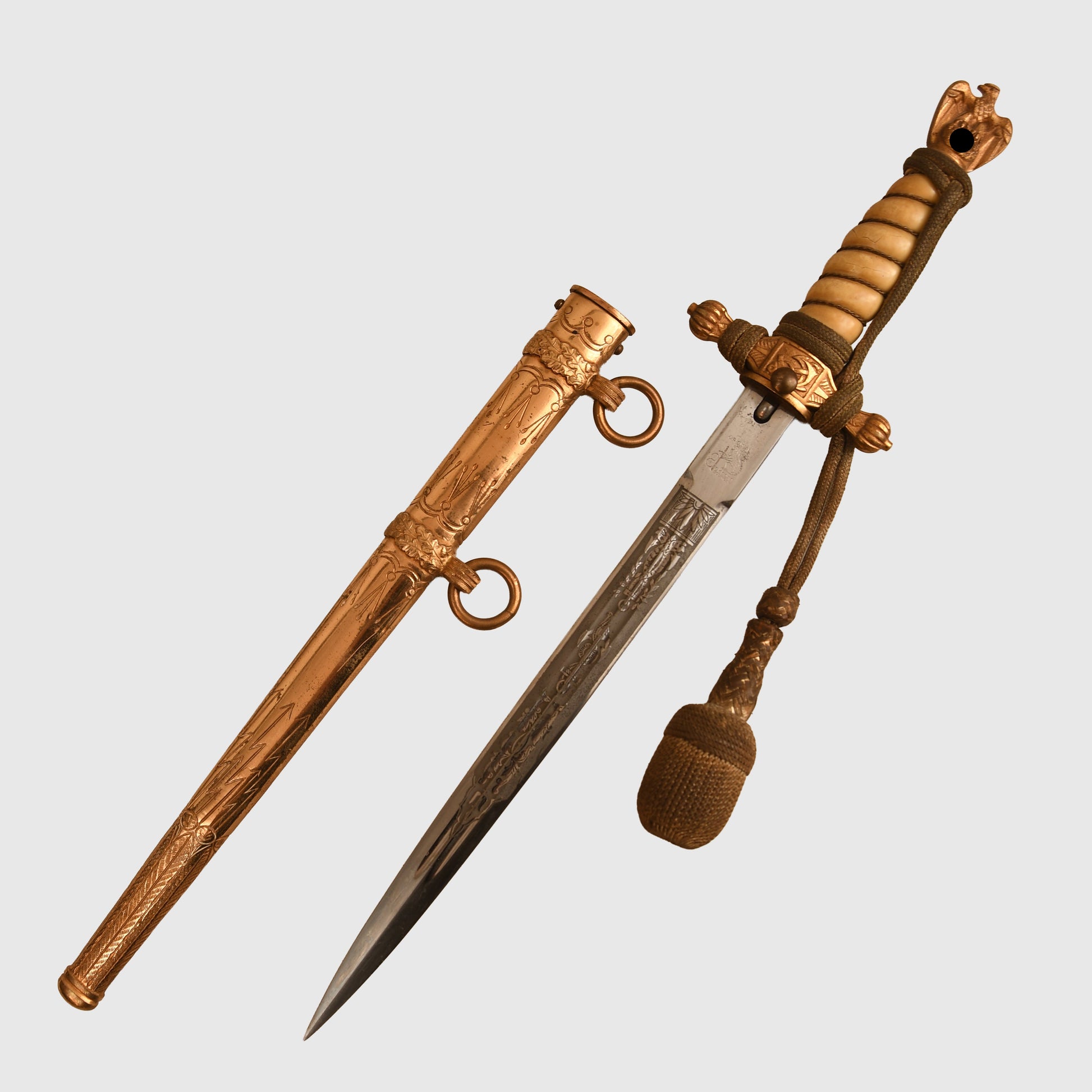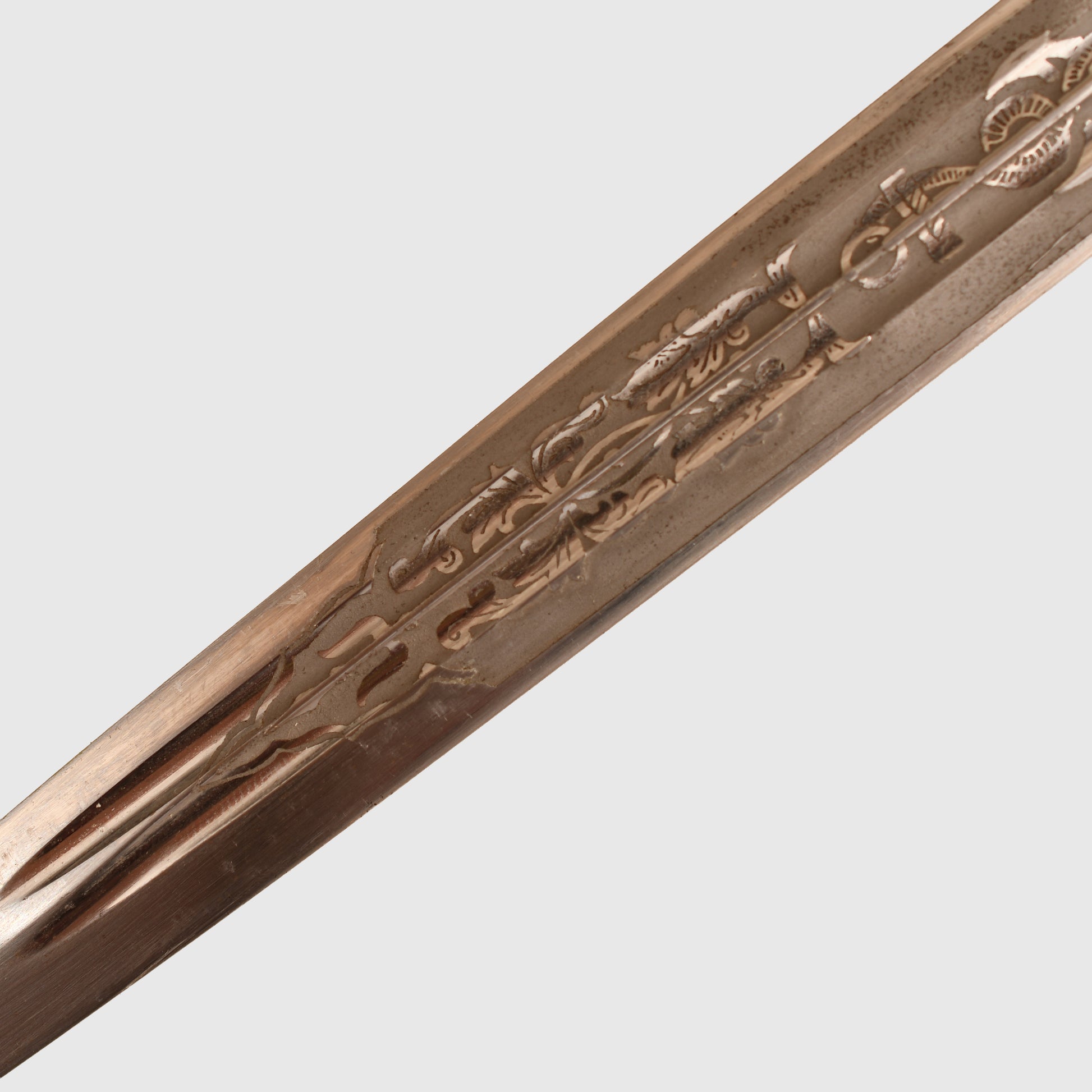A fine and well-preserved Kriegsmarine officer’s presentation example by Eickhorn, Solingen. The surface retains its full naval-style etched patterns with clear double fullers, displaying excellent brightness and quality. The fittings, including the pommel, cross guard, and scabbard, retain much of their original gilt finish with subtle frosted highlights throughout.