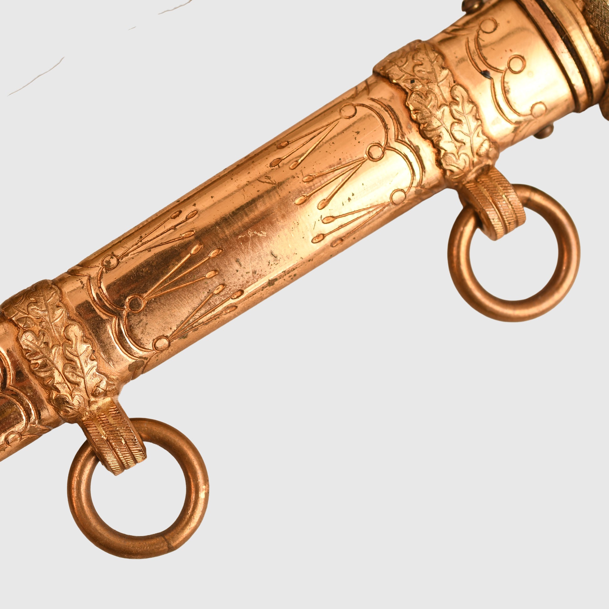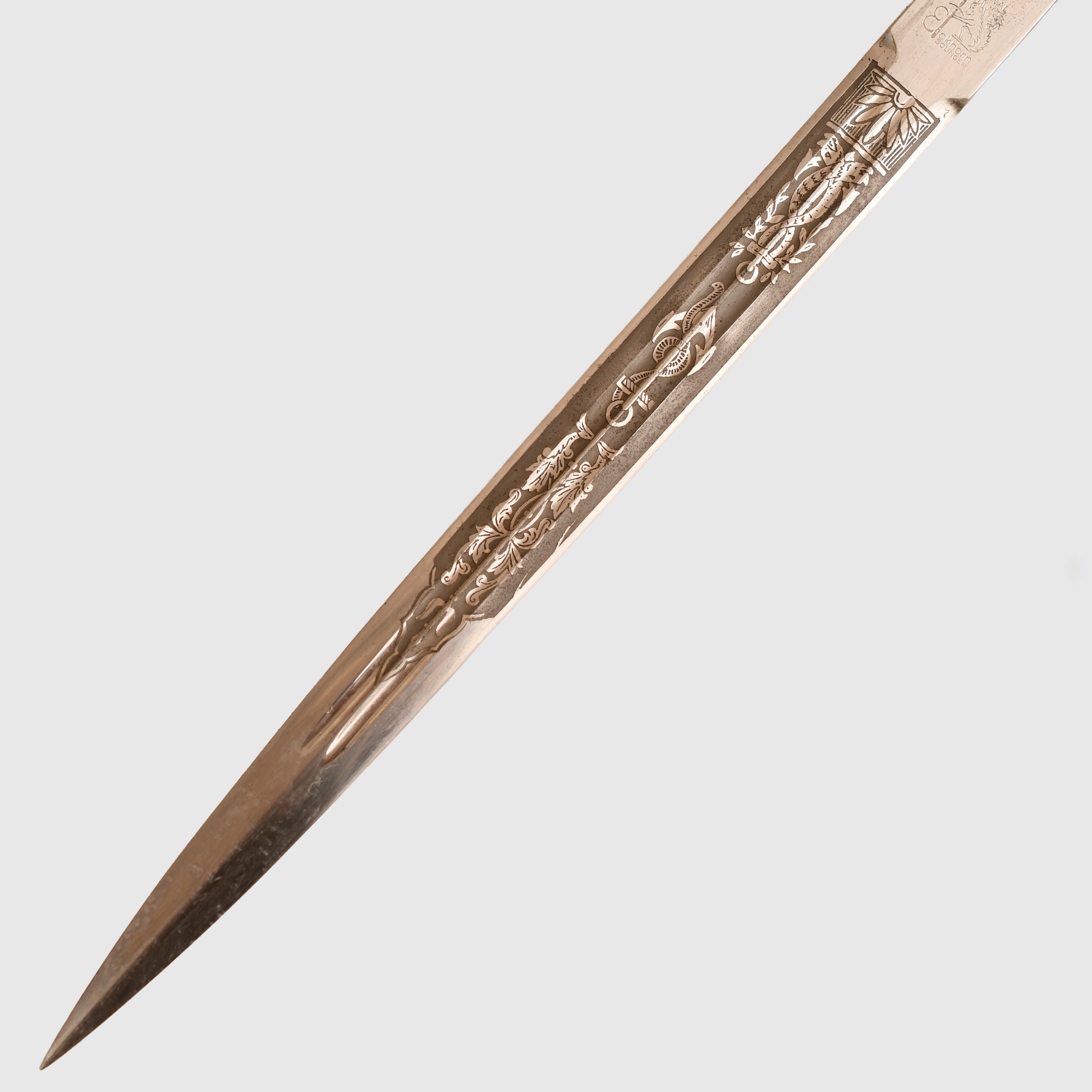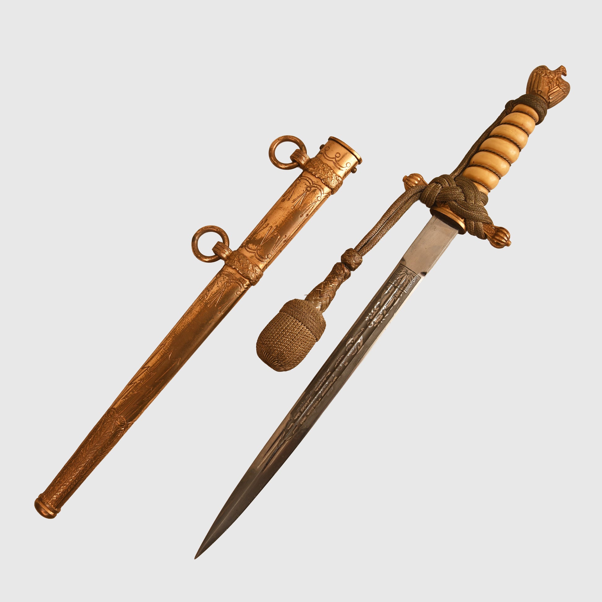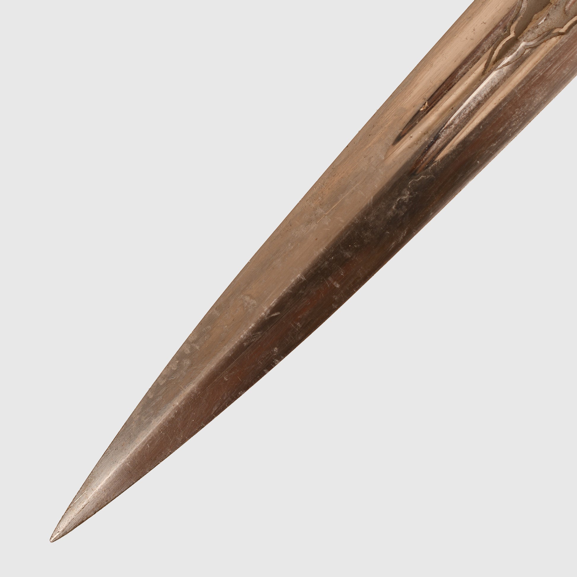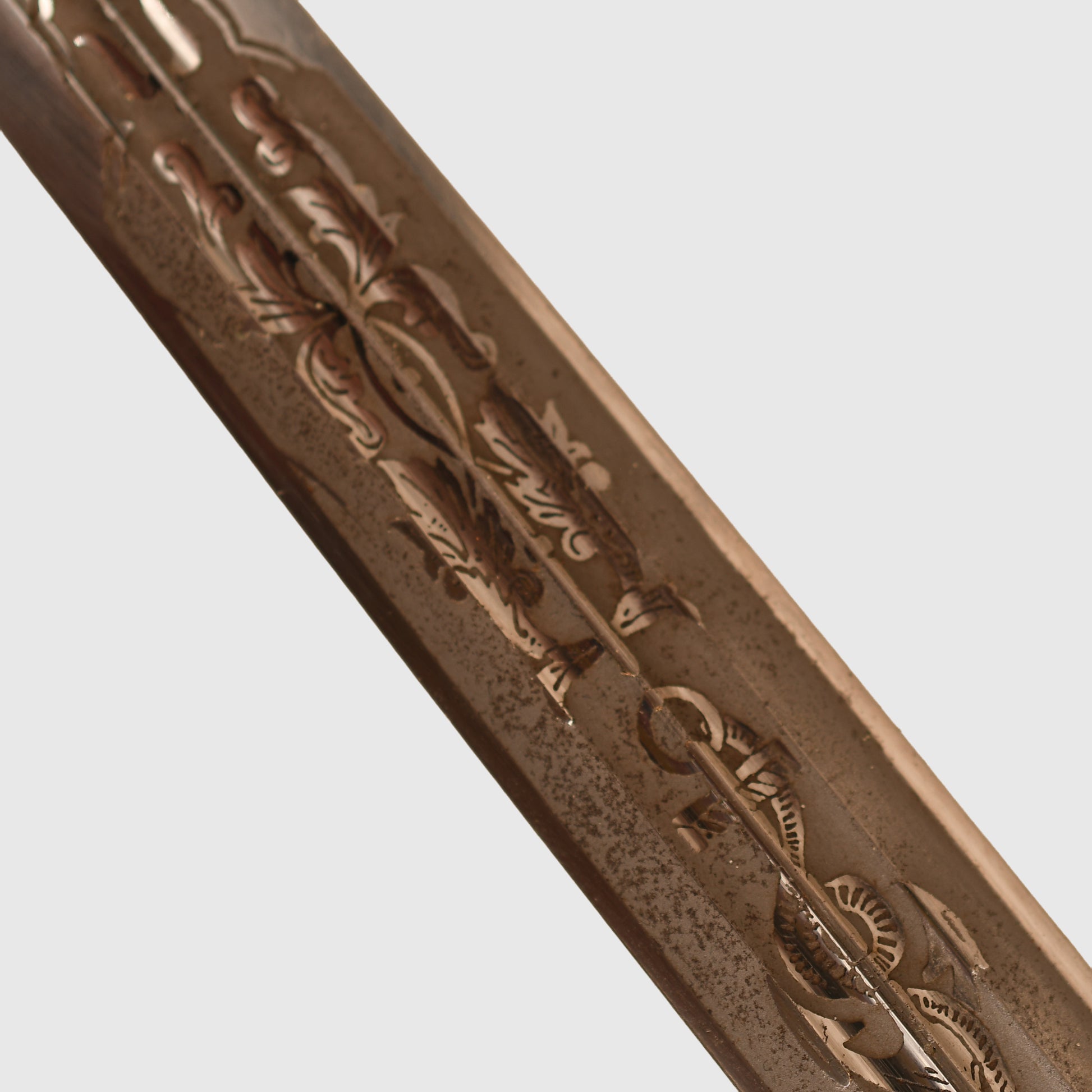 A fine and well-preserved Kriegsmarine officer’s presentation example by Eickhorn, Solingen. The surface retains its full naval-style etched patterns with clear double fullers, displaying excellent brightness and quality. The fittings, including the pommel, cross guard, and scabbard, retain much of their original gilt finish with subtle frosted highlights throughout.