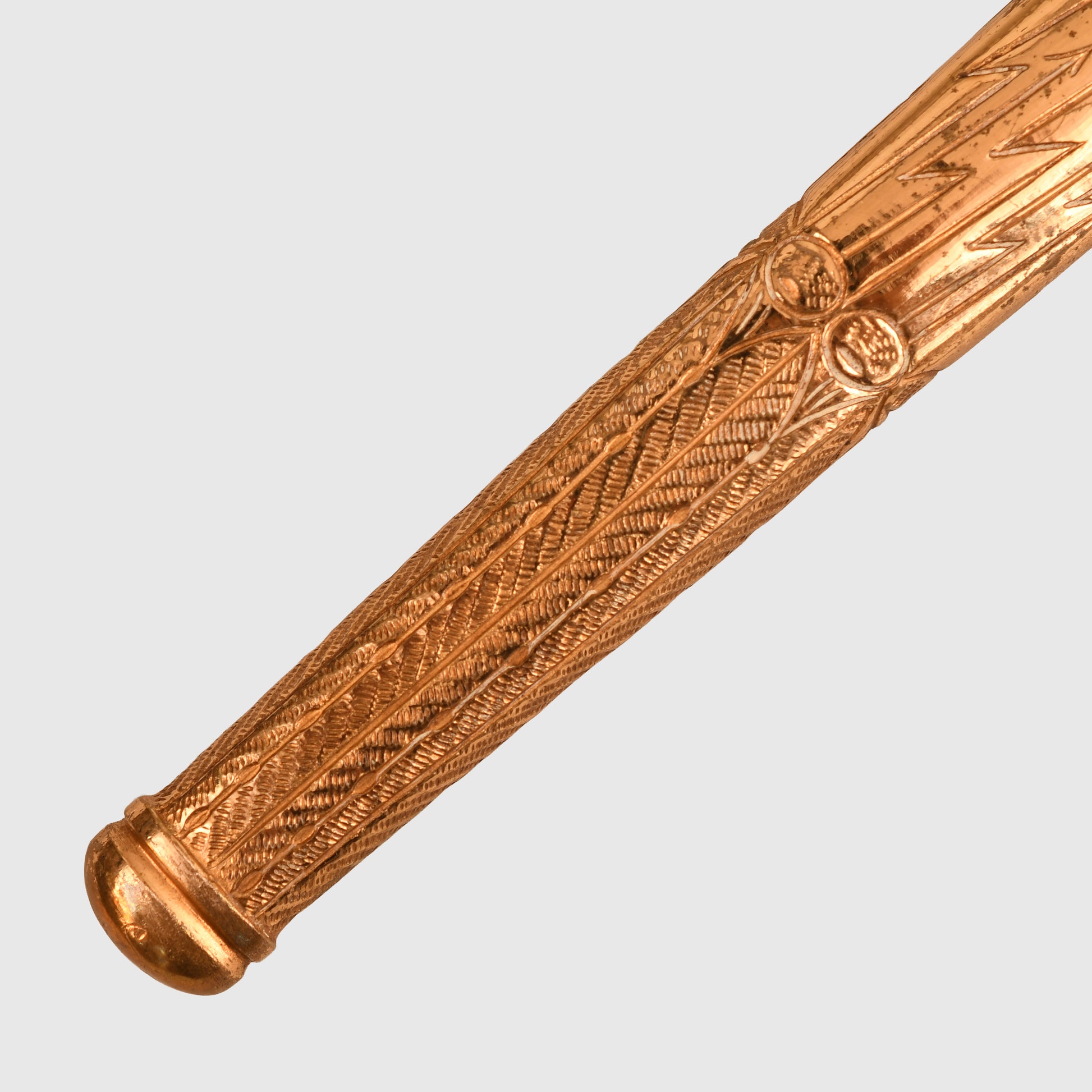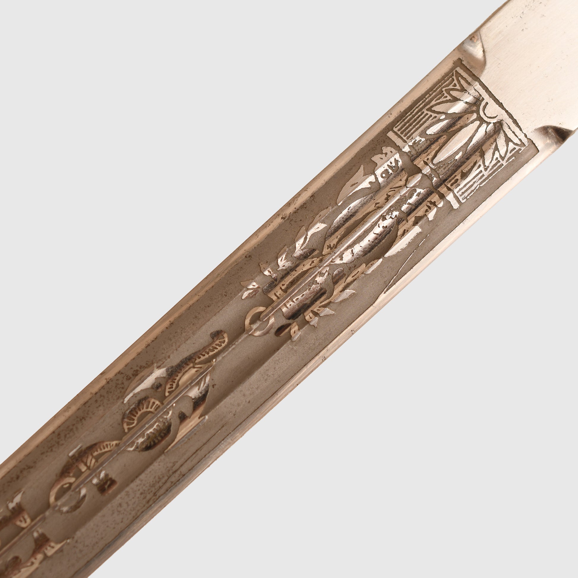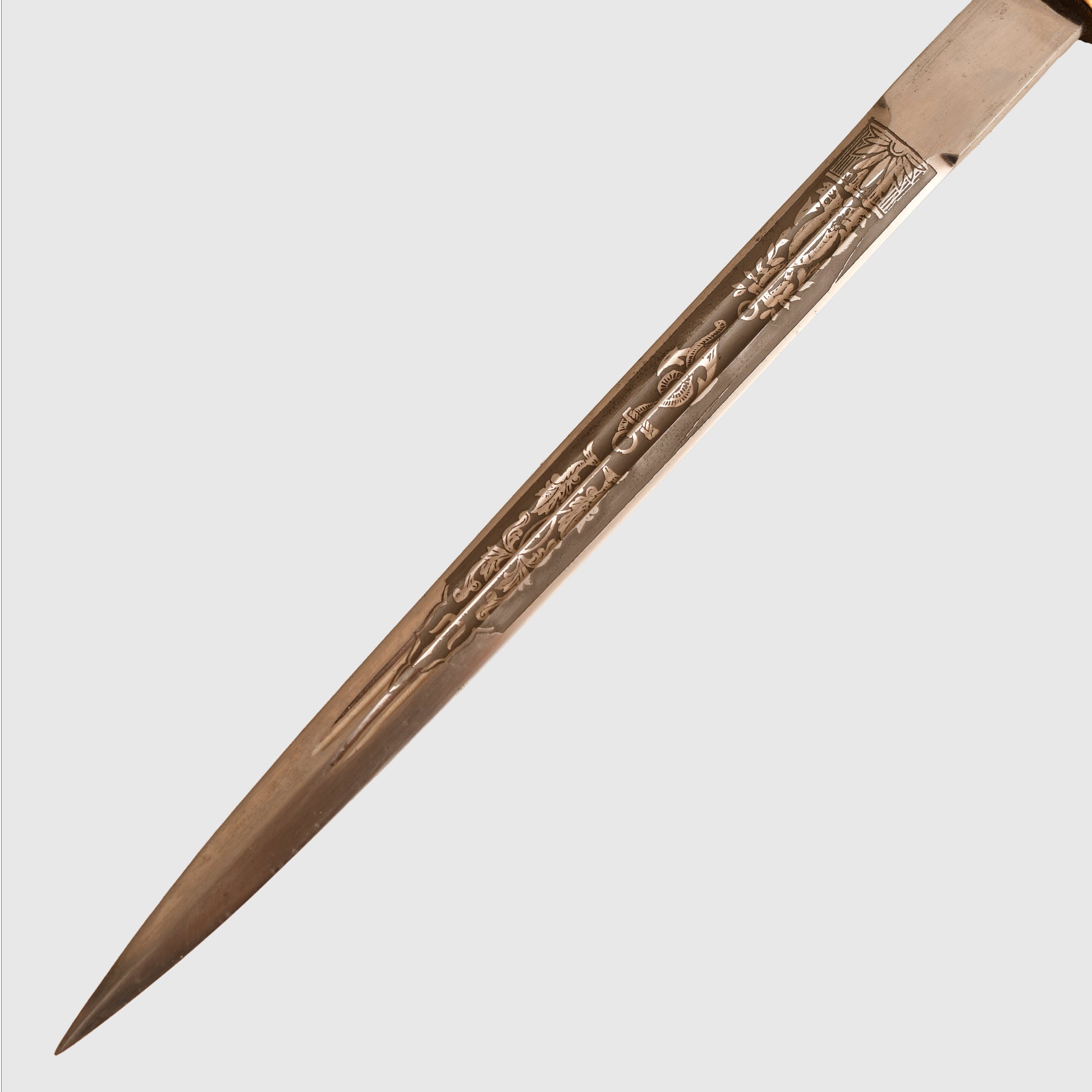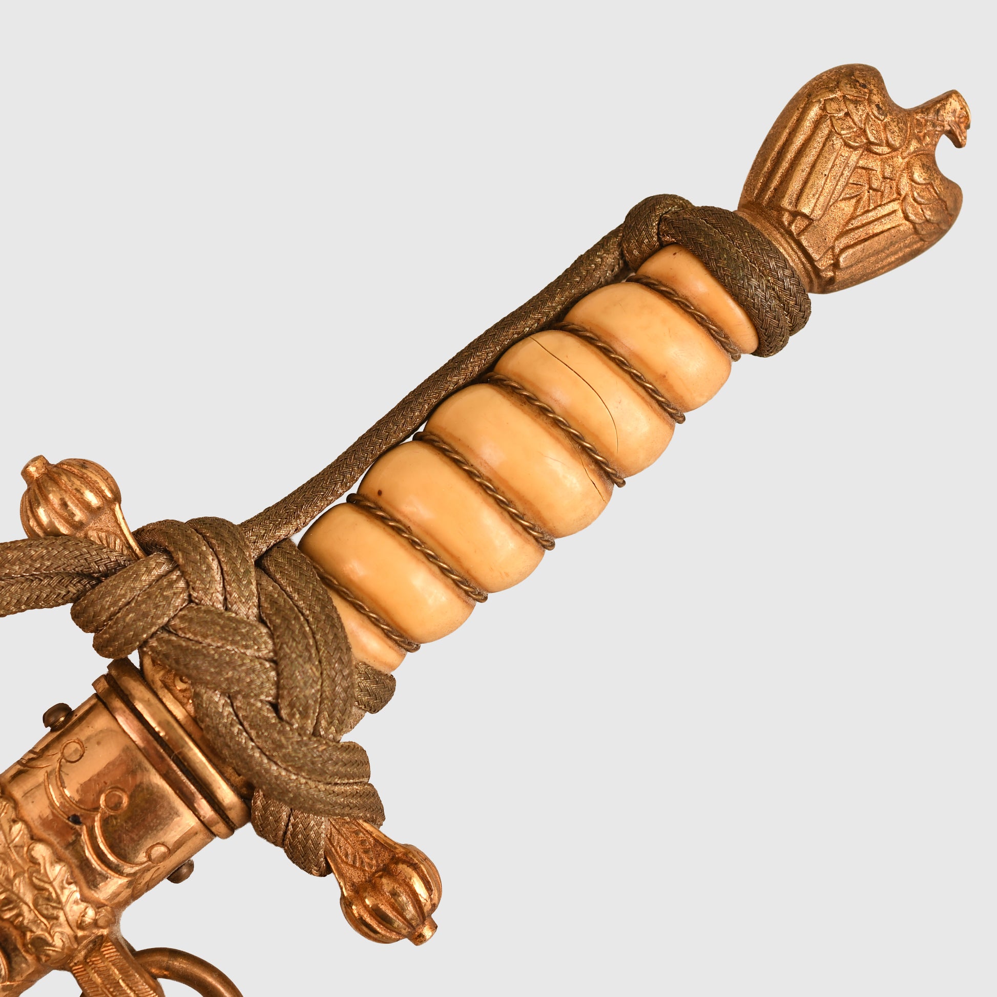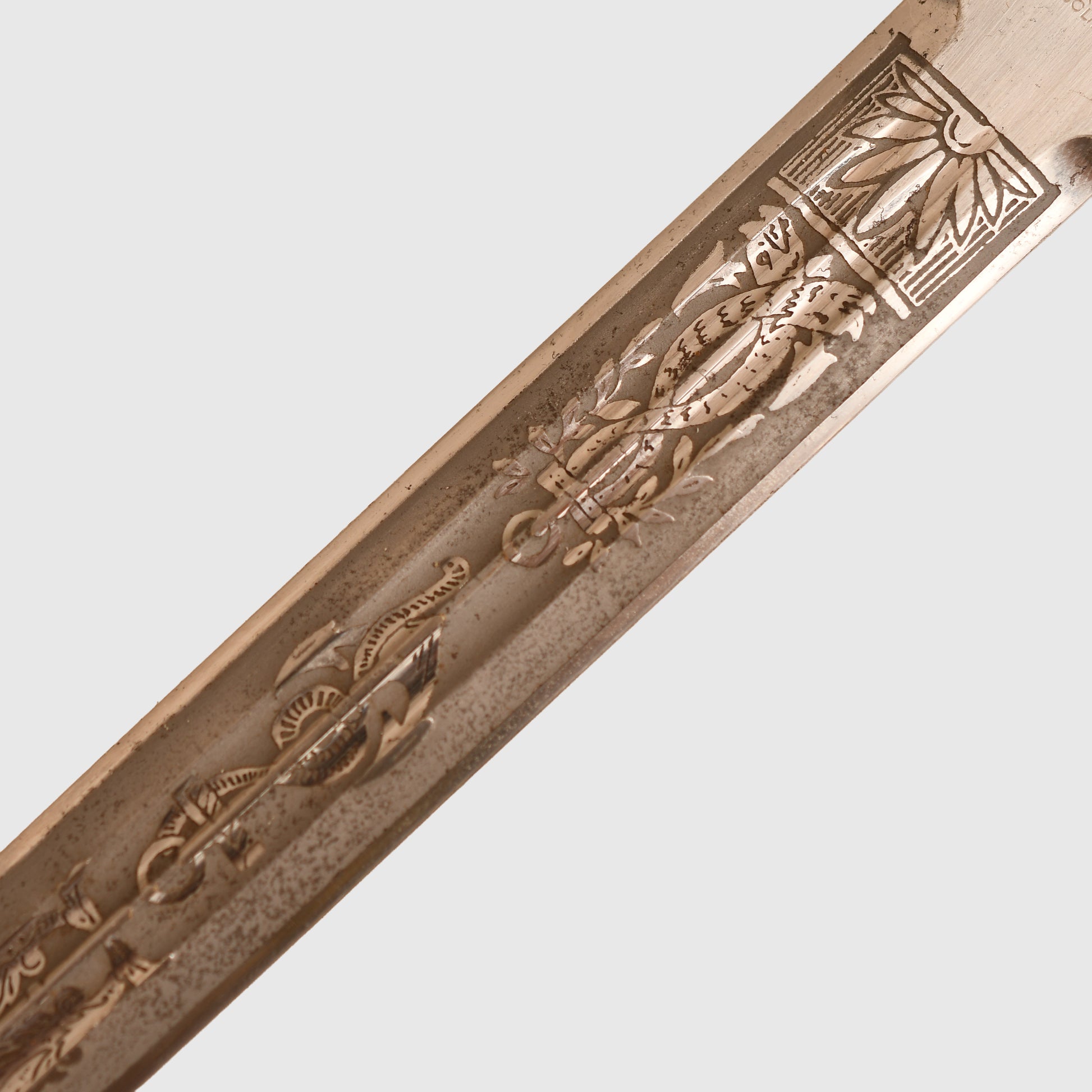 A fine and well-preserved Kriegsmarine officer’s presentation example by Eickhorn, Solingen. The surface retains its full naval-style etched patterns with clear double fullers, displaying excellent brightness and quality. The fittings, including the pommel, cross guard, and scabbard, retain much of their original gilt finish with subtle frosted highlights throughout.